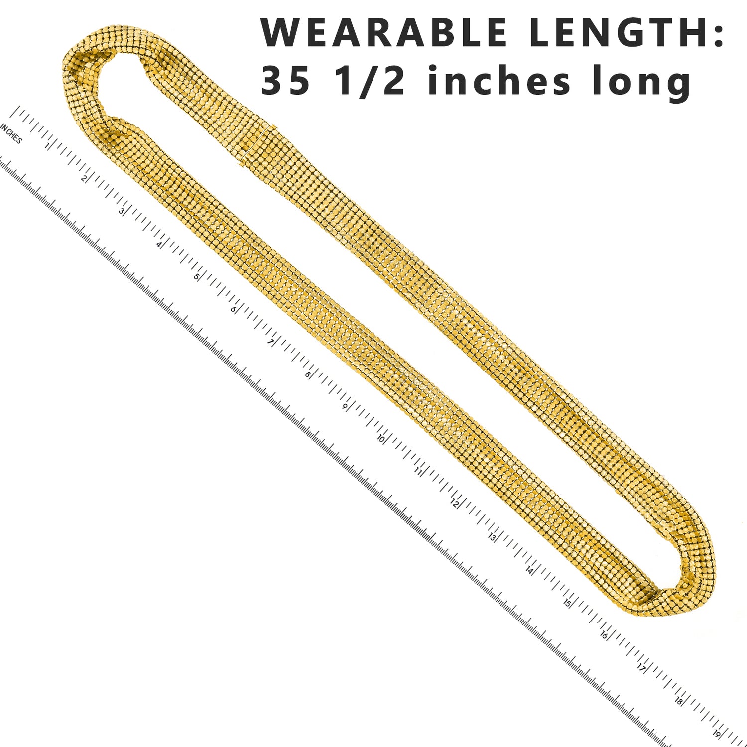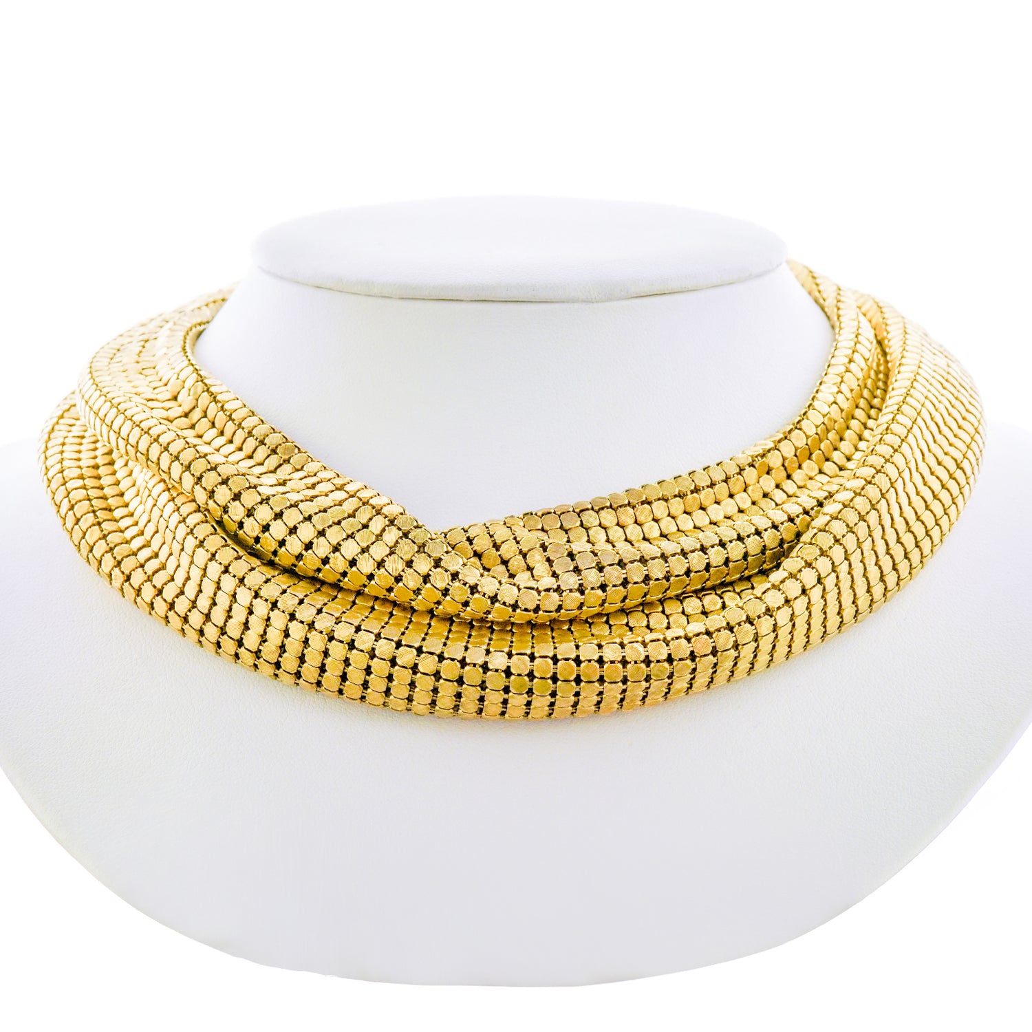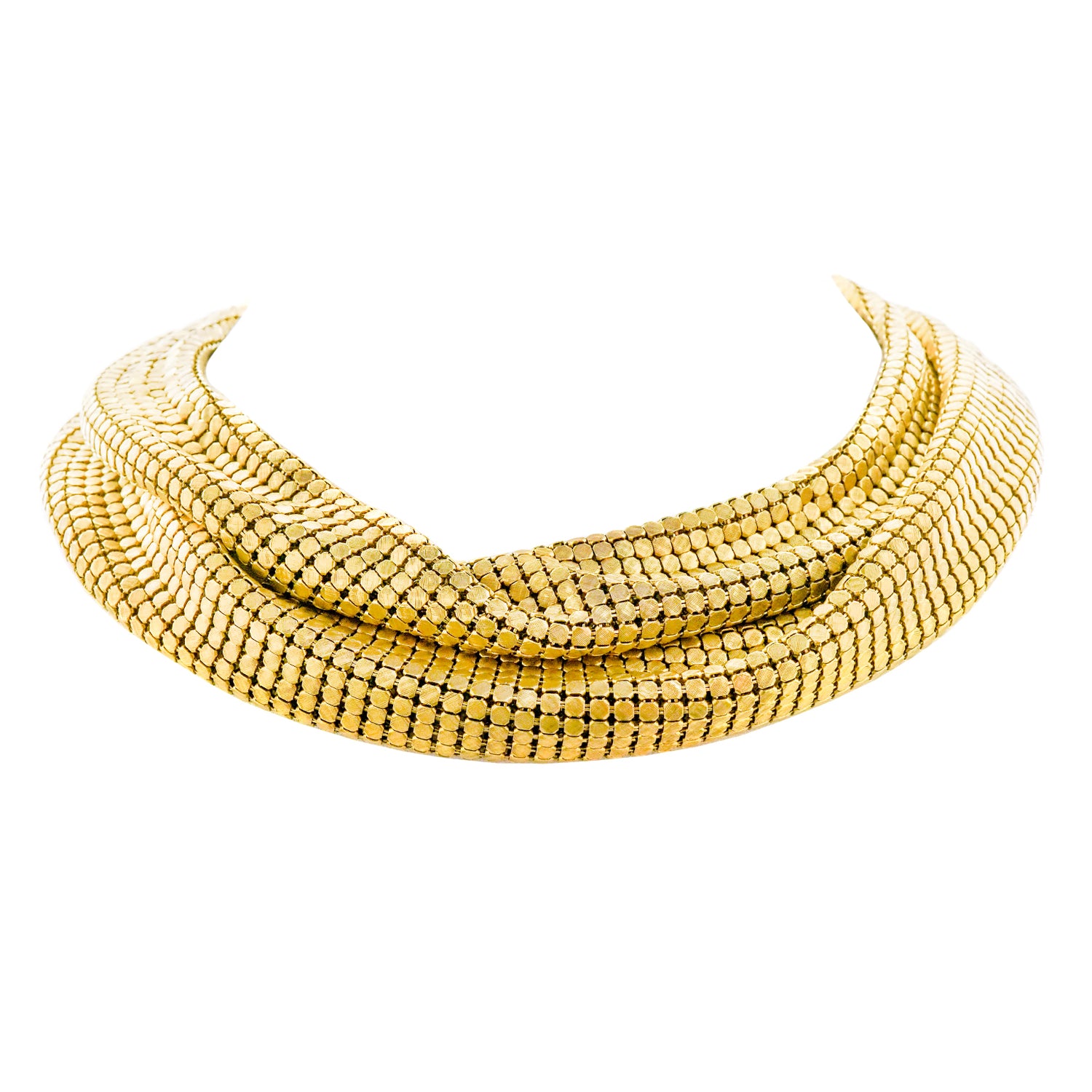 Circa 1970s, 18k, by Wilm, Hamburg, Germany.  Weaving together hand-textured and polished elements, this striking 18k yellow gold necklace has a sophisticated visual narrative. Since the 1700s, Wilm has created impeccably styled jewelry. This spectacular 35 1/2 inch necklace, with its brilliant textile motif, easily goes from the sidewalk to the catwalk. Constructed of meticulously hand-fabricated and engraved pieces to form a gold mesh, it can be worn around the neck doubled or long, and additionally slung on the hips as a decorative belt. The flexible nature of the components makes it very comfortable on and easy to wear. Excellent condition.
