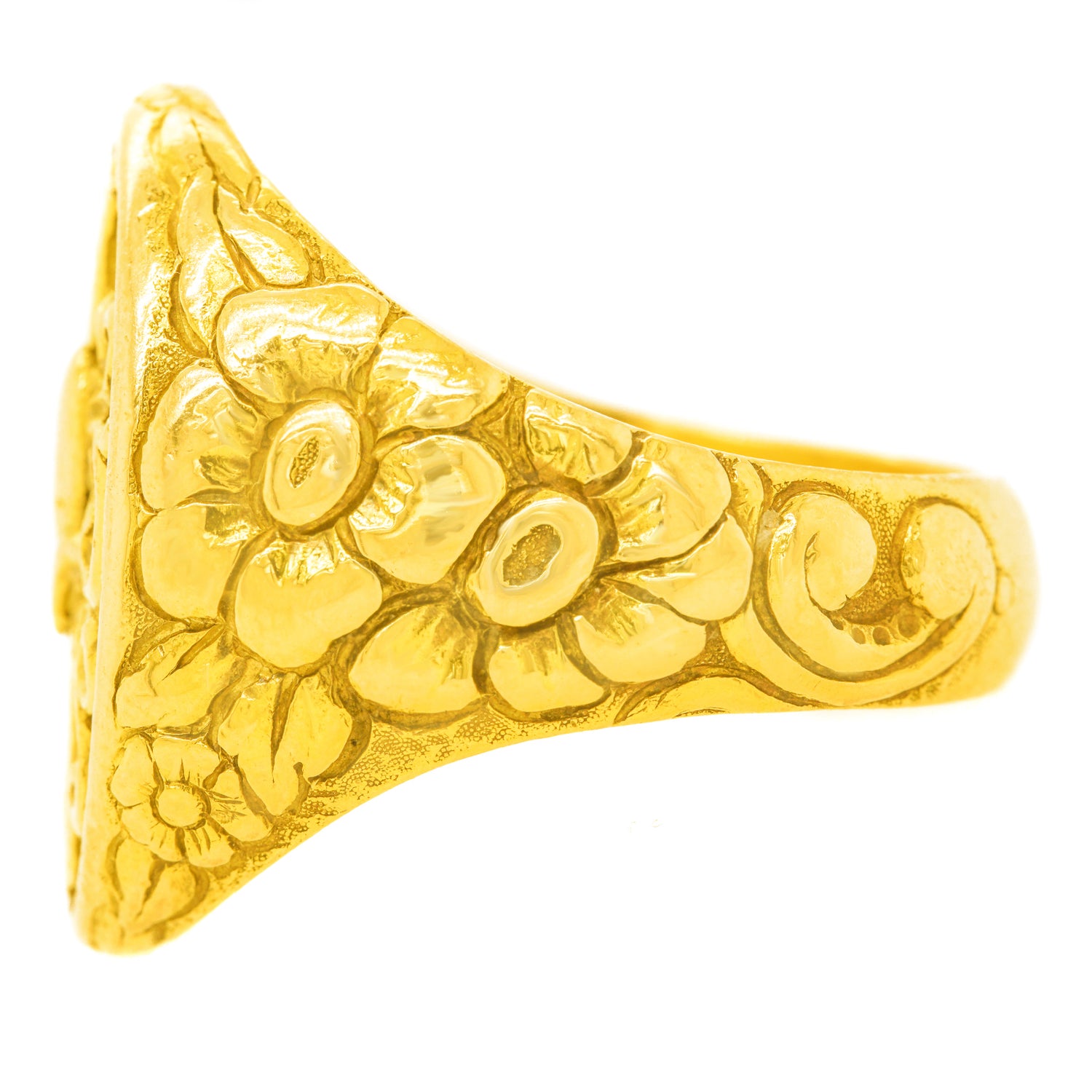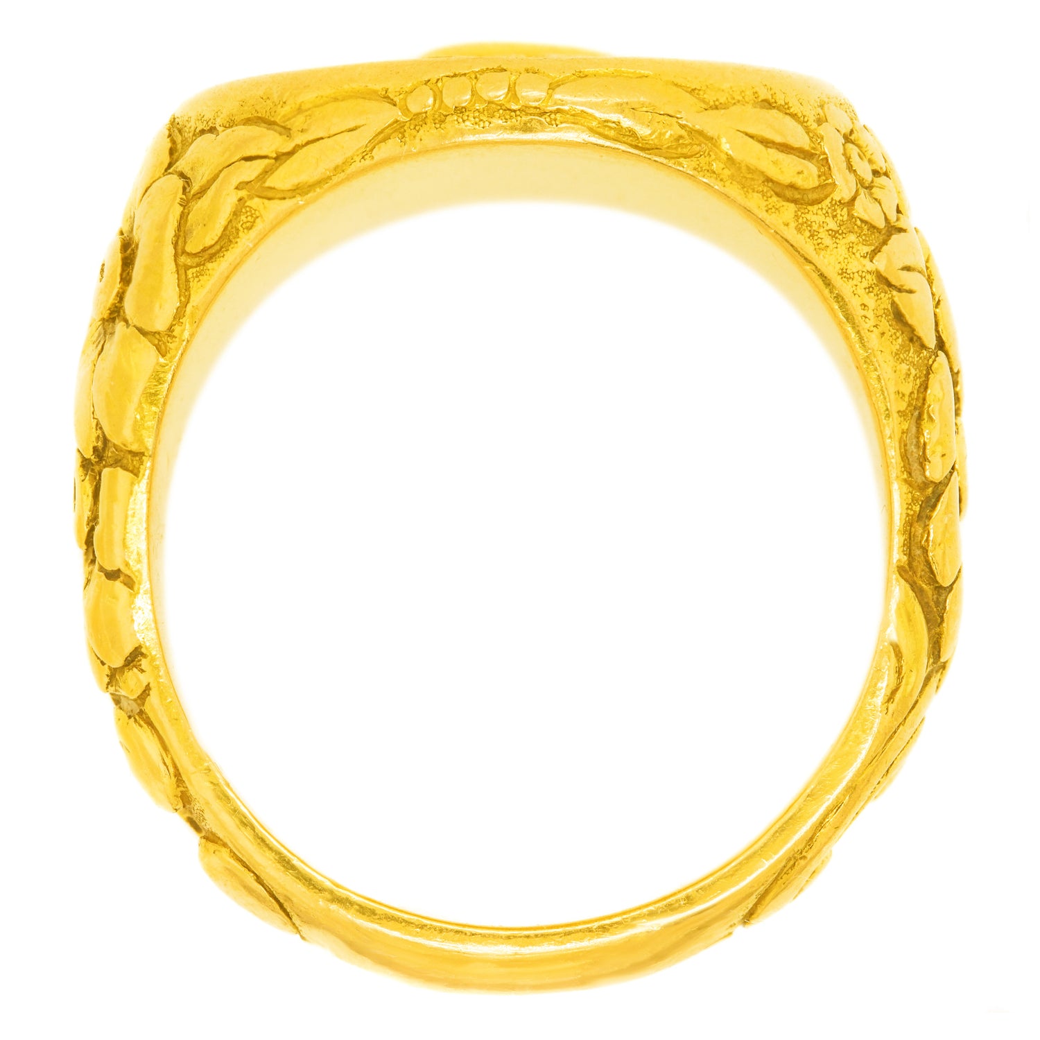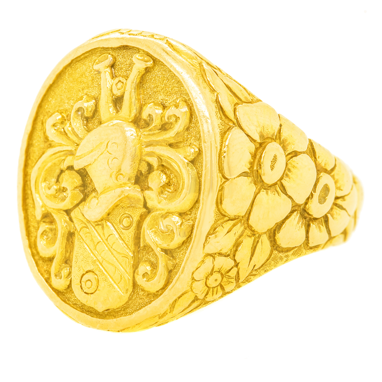 Circa 1890s, 18k, attributed Switzerland. This gorgeous 18k yellow gold signet ring features generous size, scale, and heft. The bold town and country look is underscored by a hand-chased armorial and highly detailed sides and hoop. Superbly made, this antique ring is in excellent condition.