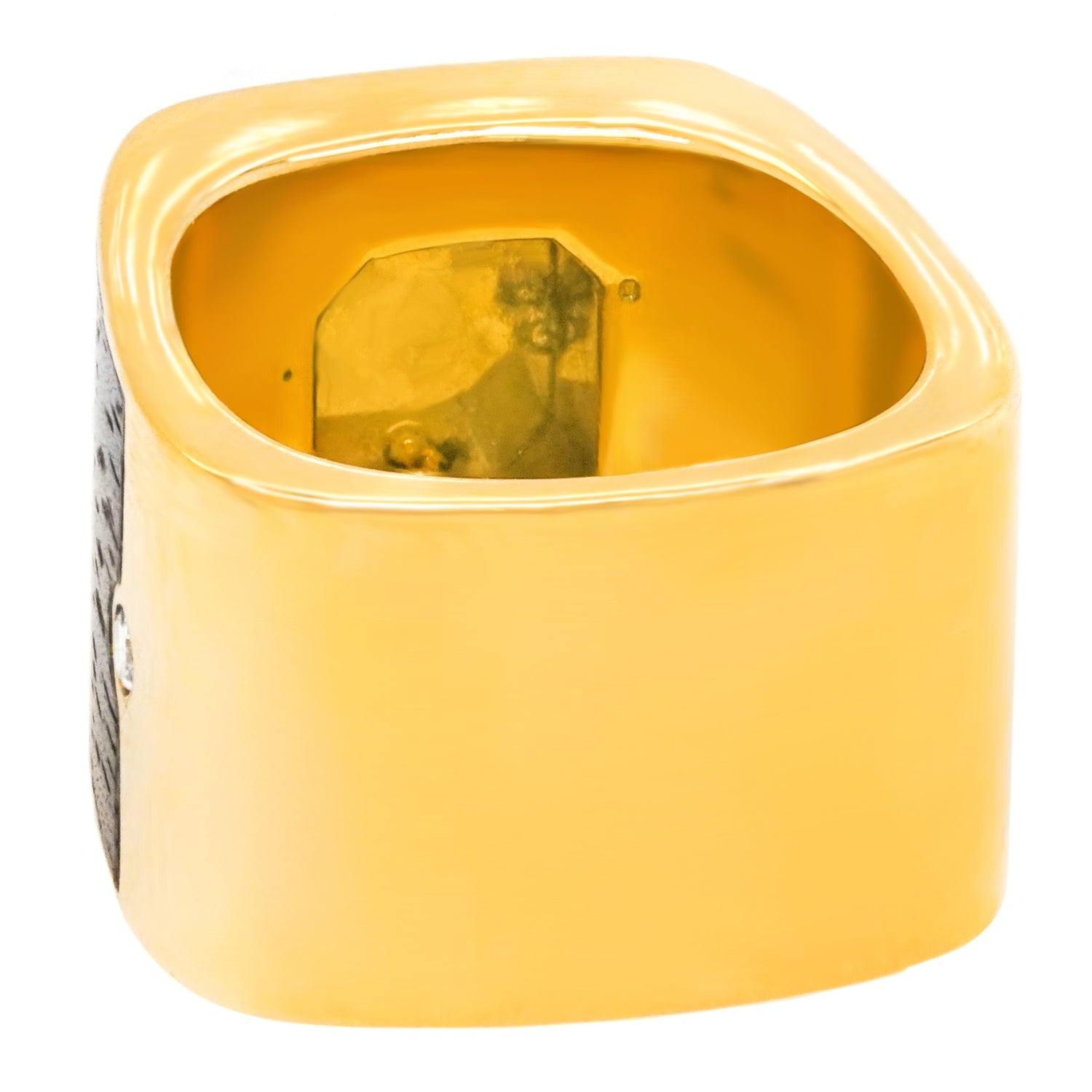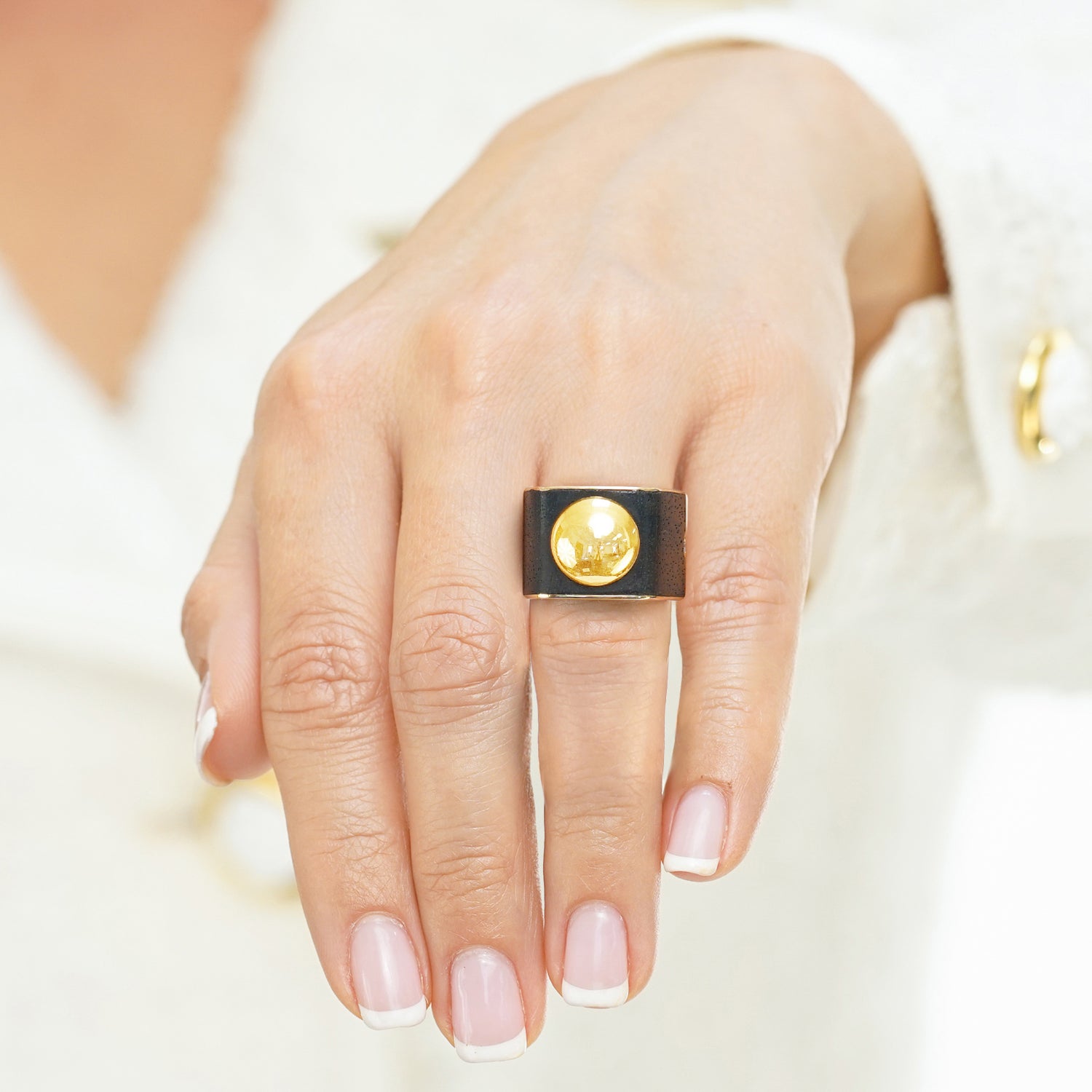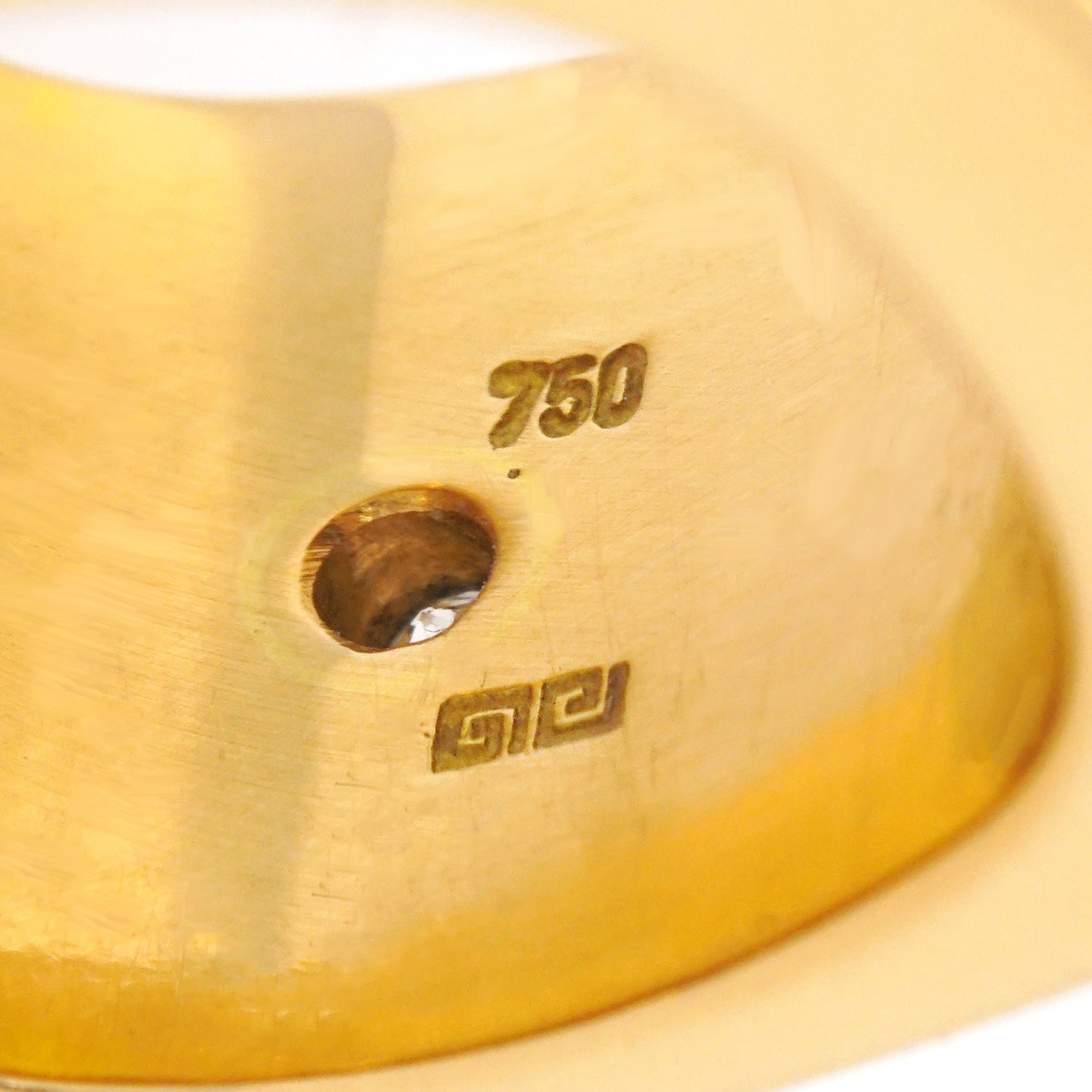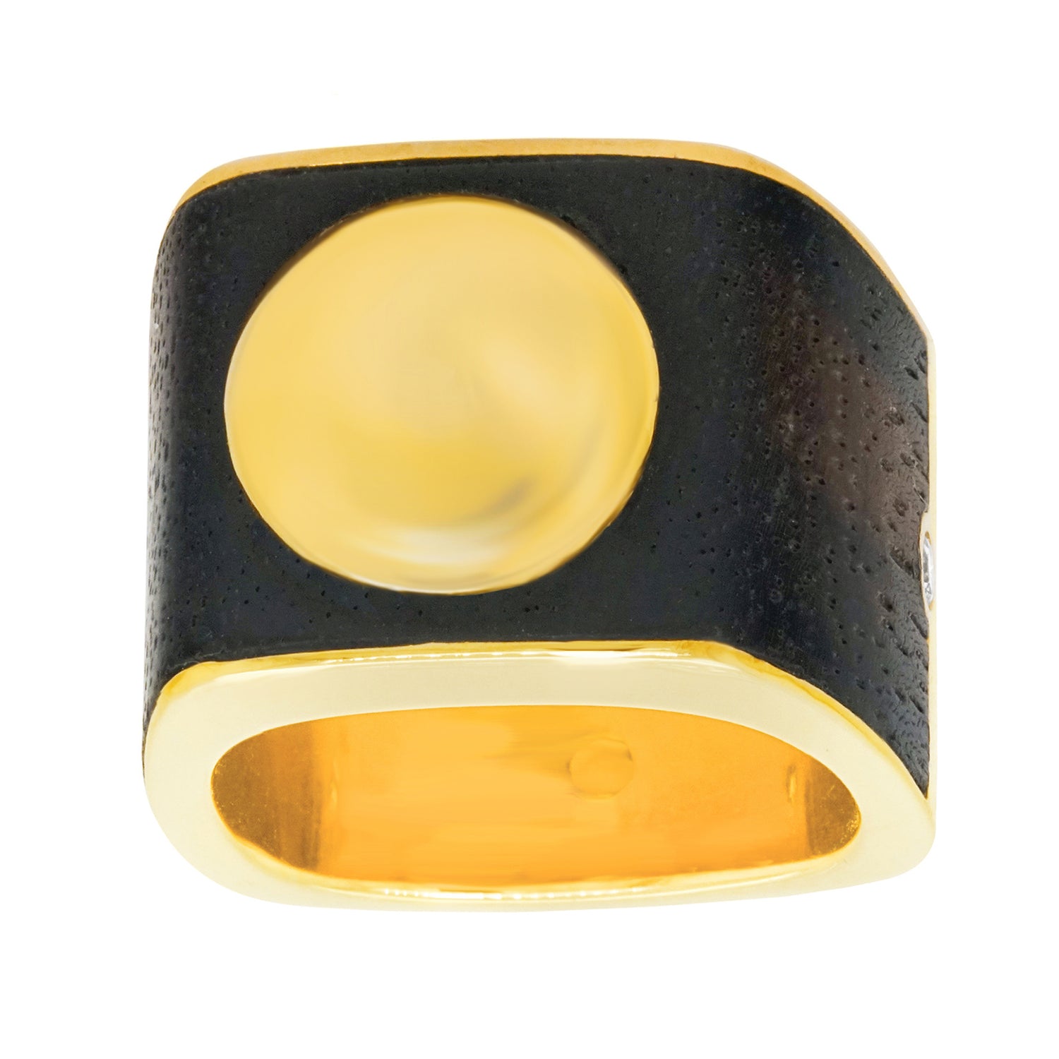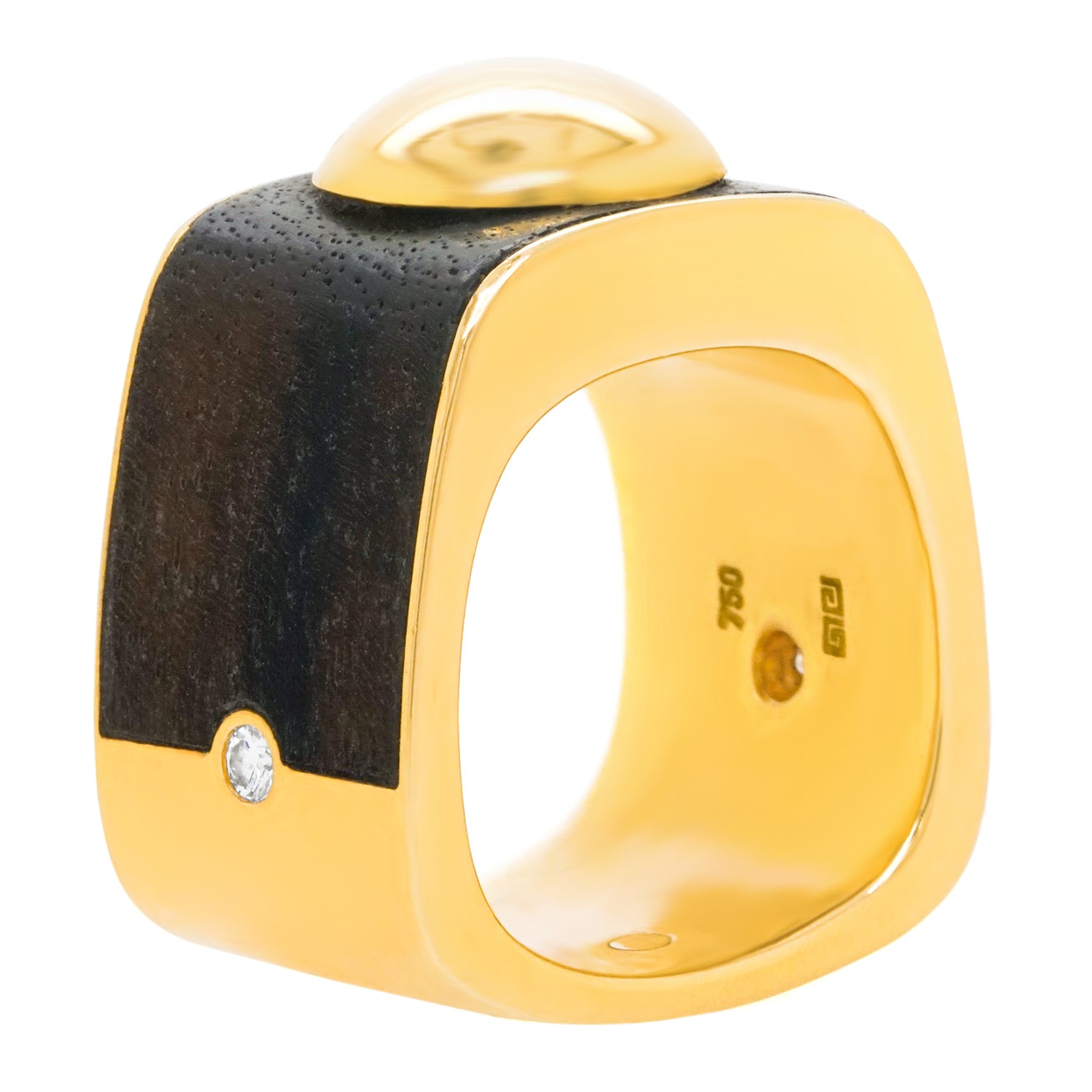 Circa 1960s, 18k, by Paul Binder, Zurich, Switzerland. Visually arresting, this ring is about contrasting shapes, and textures. A perfect drop of gold sits on a landscape of deeply hued ebony mounted on polished eighteen-karat gold and smartly finished with two diamonds marking the border between metal and wood. This ring has an edgy vibrancy underscored by an effortless sense of fashion. The look is fresh and bold, a very wearable piece of sixties Art Jewelry. Meticulously made by Paul Binder of Zurich, it is in excellent condition.