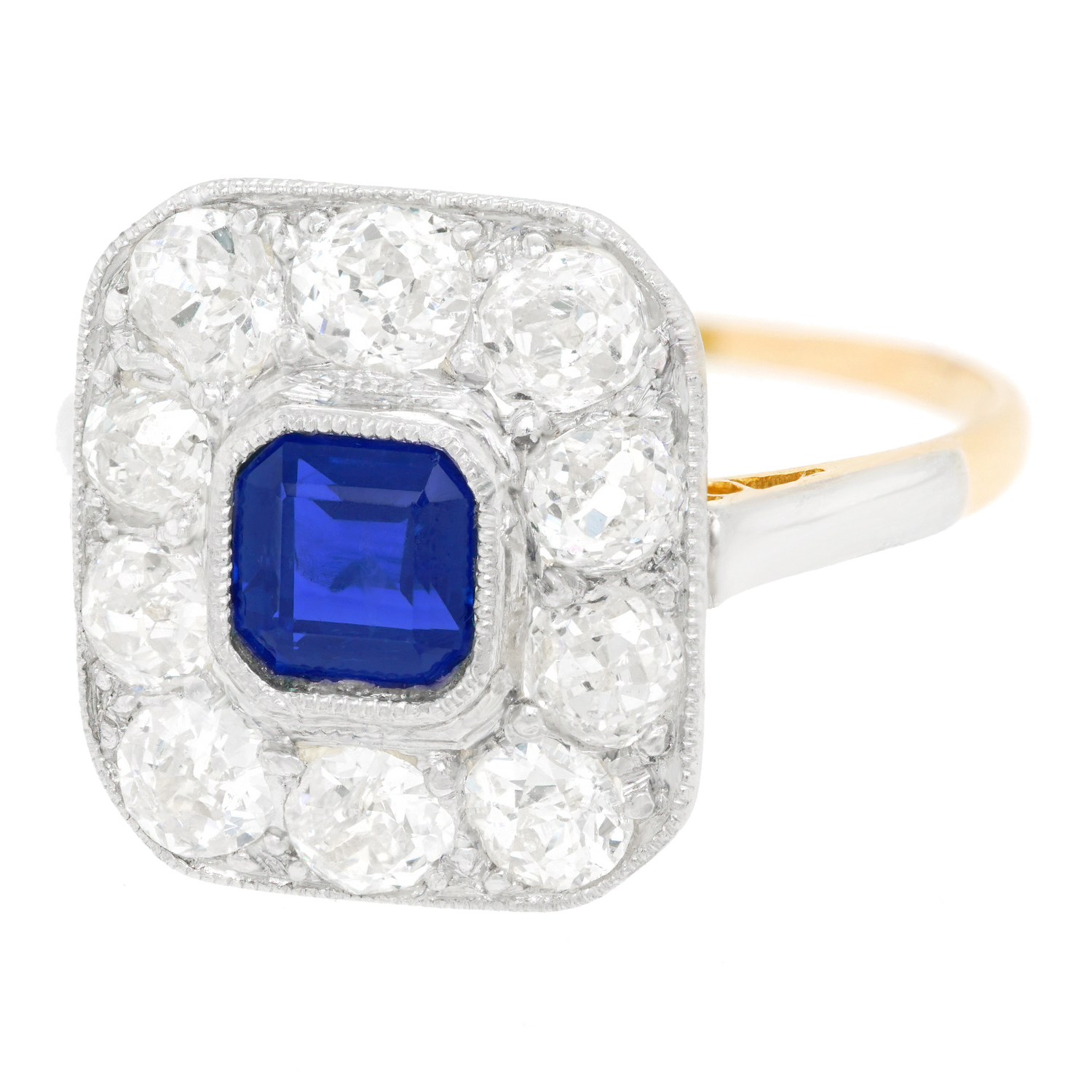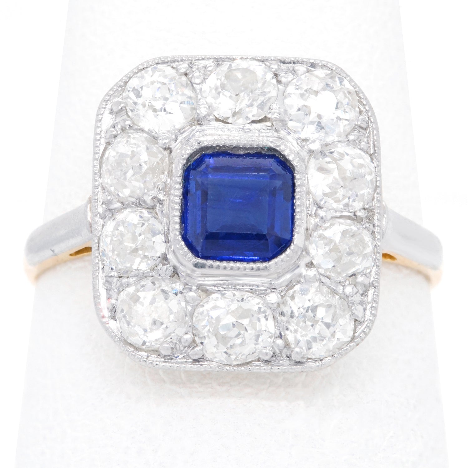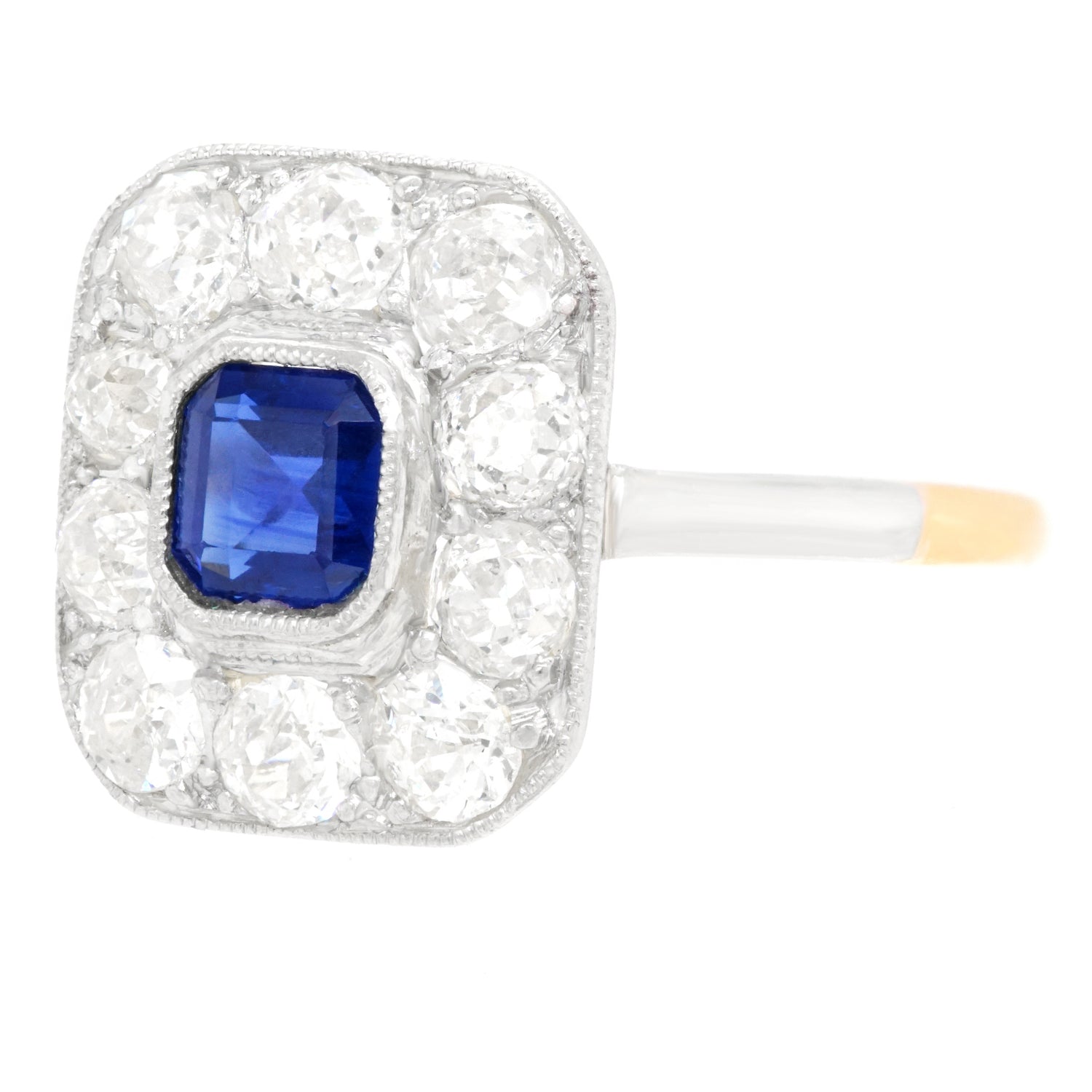 Circa 1920s, Platinum over 18k, American. With its platinum top and 18k yellow gold body, this eye-catching Art Deco ring features a 1.0-carat royal blue sapphire surrounded by 1.35 carats of gorgeous old mine-cut diamonds. Art Deco jewelry has a stylistic authenticity that lends verve to any moment of fashion. Meticulous fabrication in platinum and eighteen-karat gold completes the picture. Excellent condition.