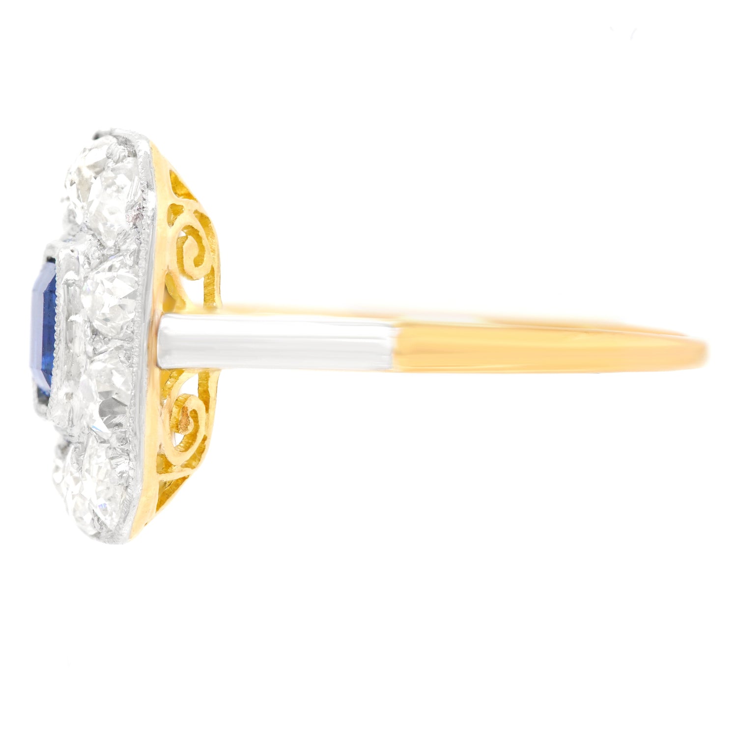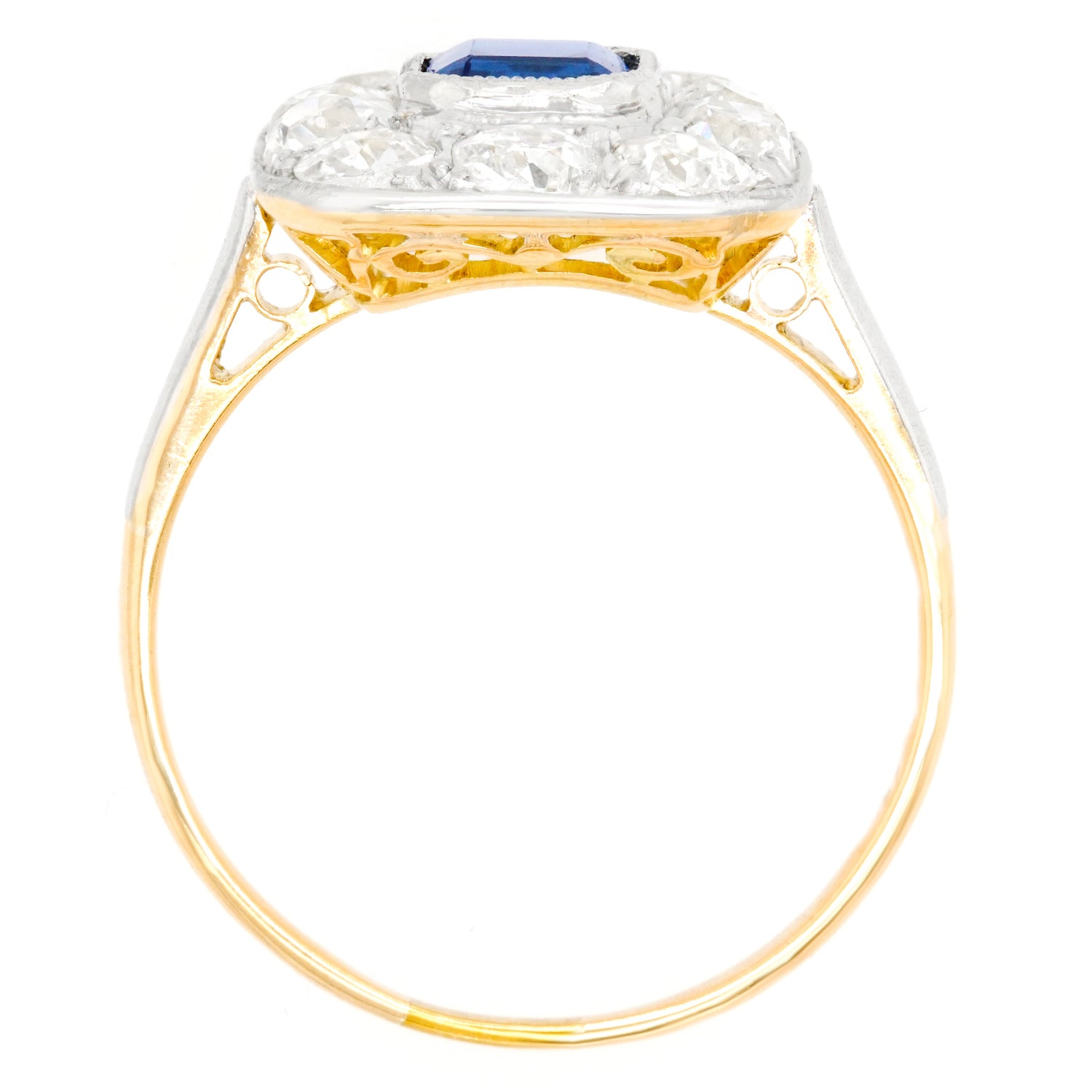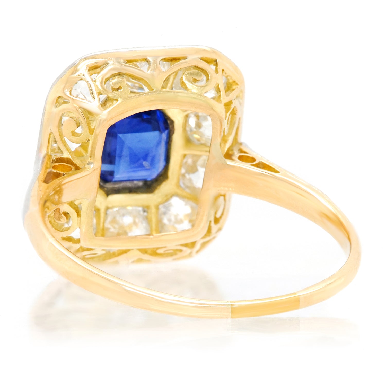 Circa 1920s, Platinum over 18k, American. With its platinum top and 18k yellow gold body, this eye-catching Art Deco ring features a 1.0-carat royal blue sapphire surrounded by 1.35 carats of gorgeous old mine-cut diamonds. Art Deco jewelry has a stylistic authenticity that lends verve to any moment of fashion. Meticulous fabrication in platinum and eighteen-karat gold completes the picture. Excellent condition.