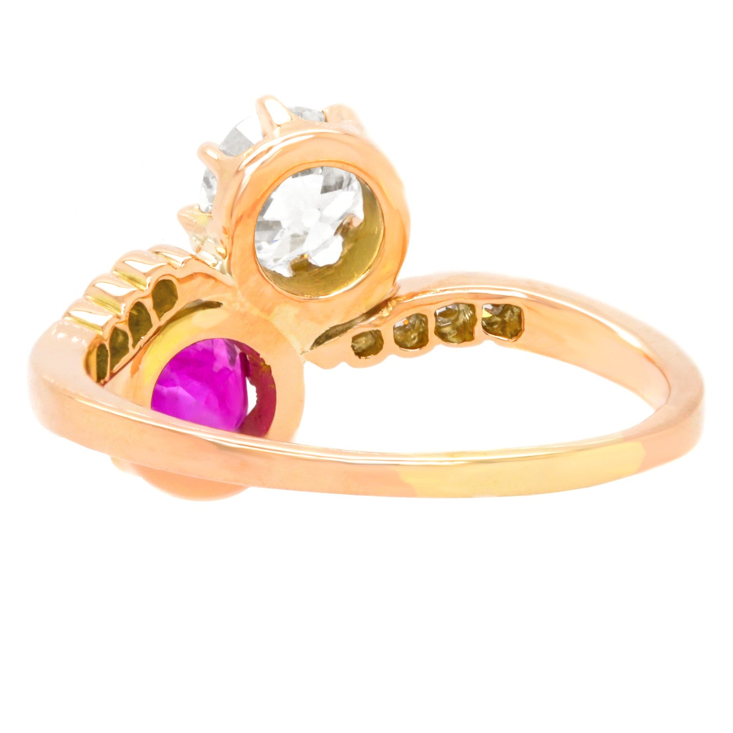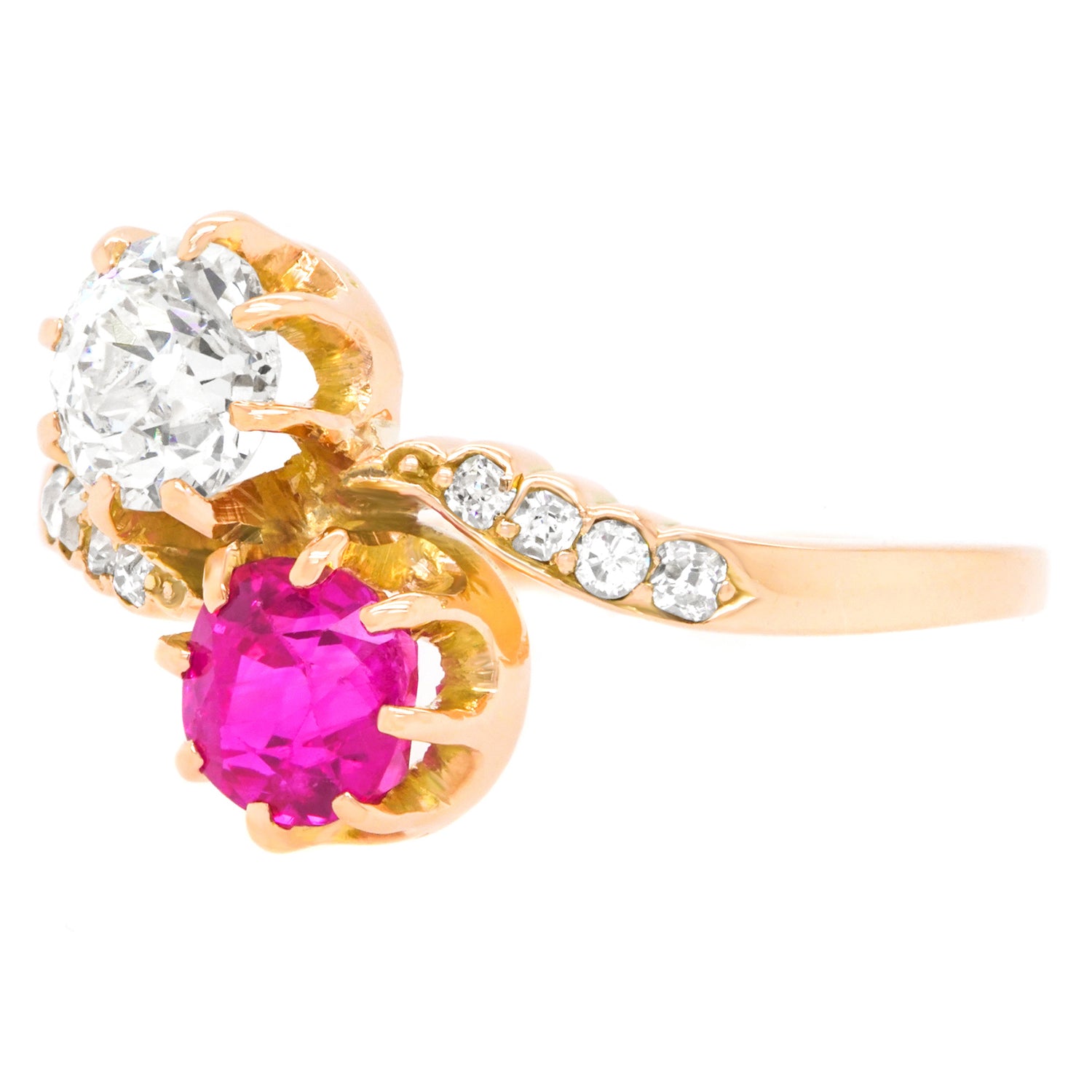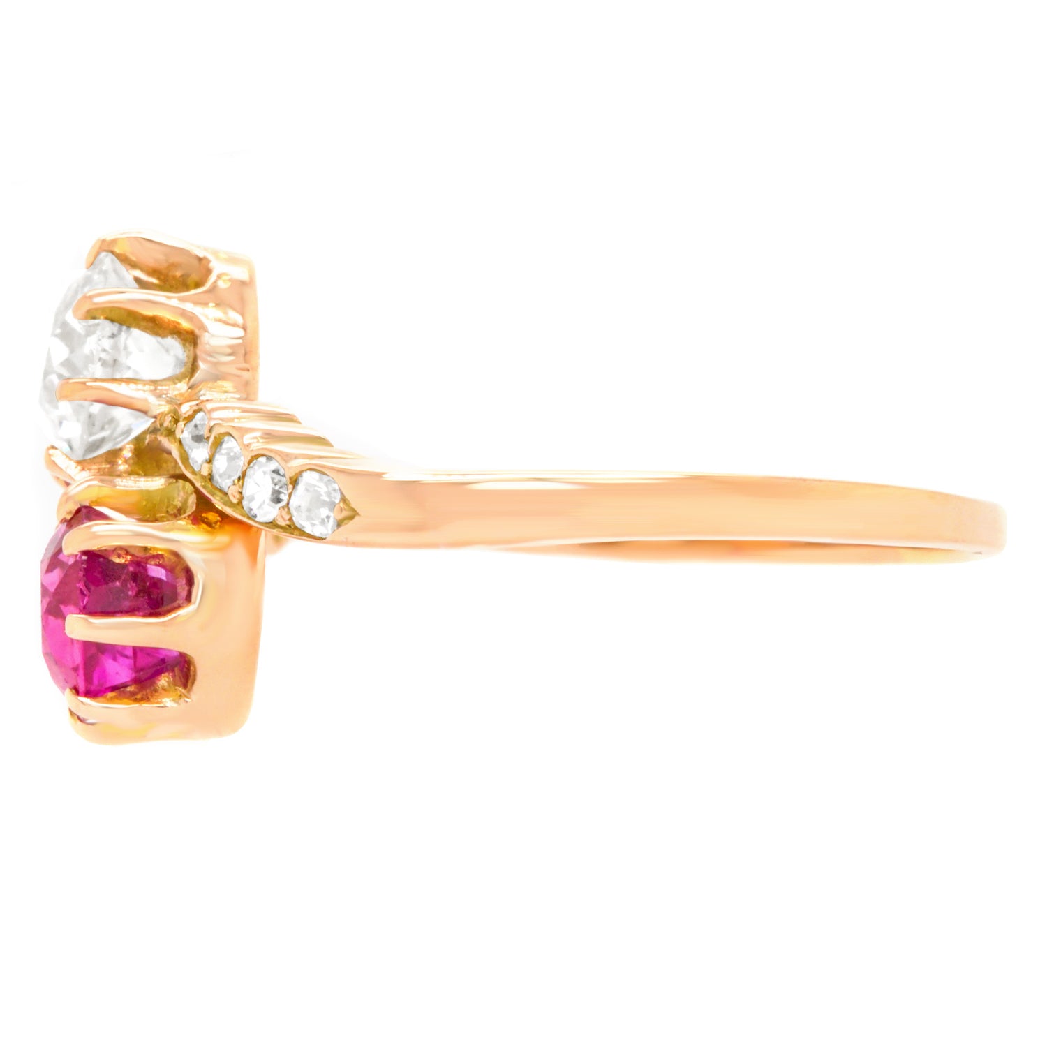 Circa 1890s, 14k.    This late 19th-century Croix-tests ring features a fabulous .65-carat ruby paired with a brilliant white .60-carat diamond. The look is vintage chic at its antique best. Finely fashioned, it is in excellent condition.