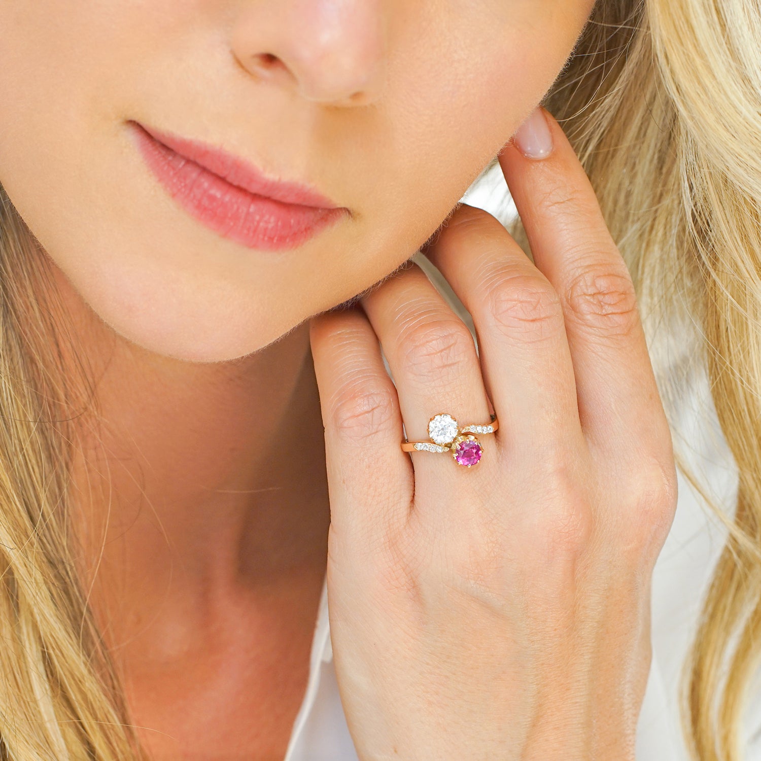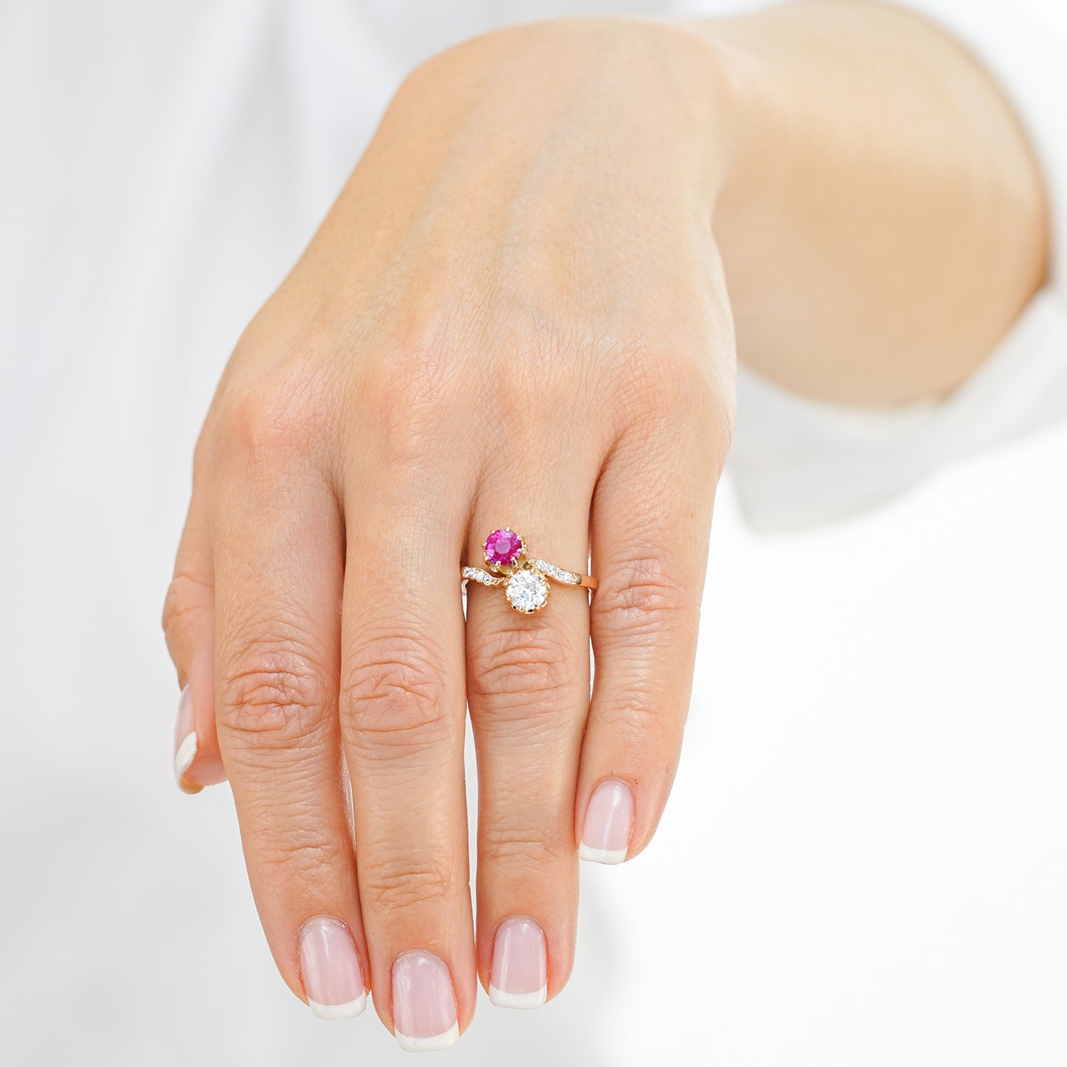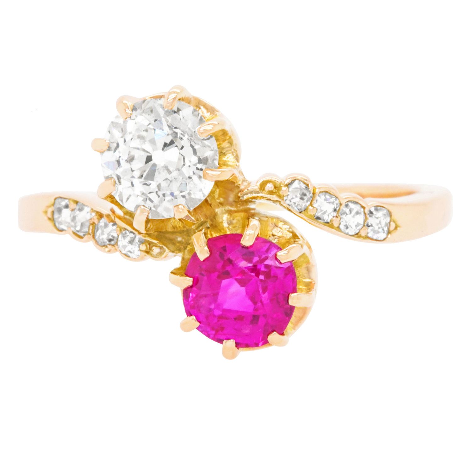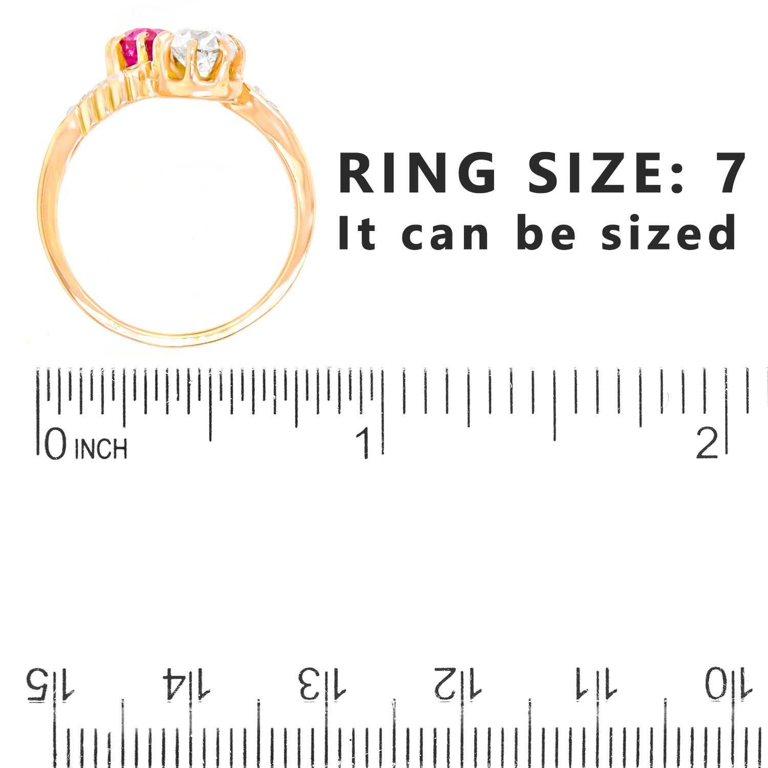 Circa 1890s, 14k.    This late 19th-century Croix-tests ring features a fabulous .65-carat ruby paired with a brilliant white .60-carat diamond. The look is vintage chic at its antique best. Finely fashioned, it is in excellent condition.