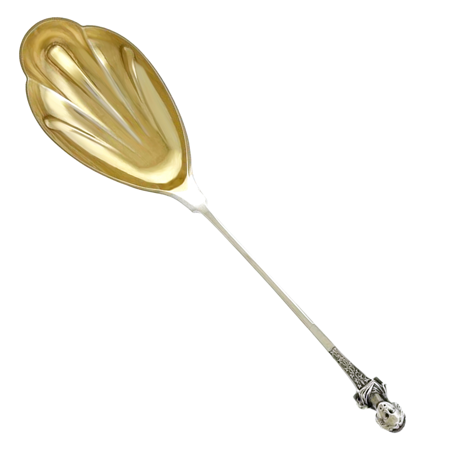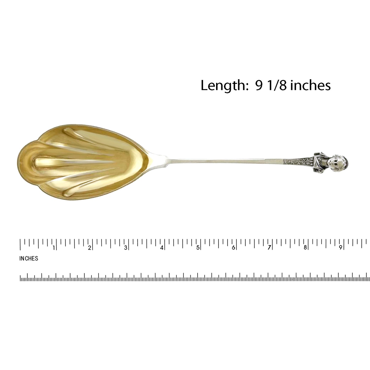 Circa 1860s, Coin Silver, by Gorham, Providence, RI. Beautiful and rare berry spoon in a speciality "woman's bust" motif. The spoon has a very nice gold wash in the bowl. Excellent condition.