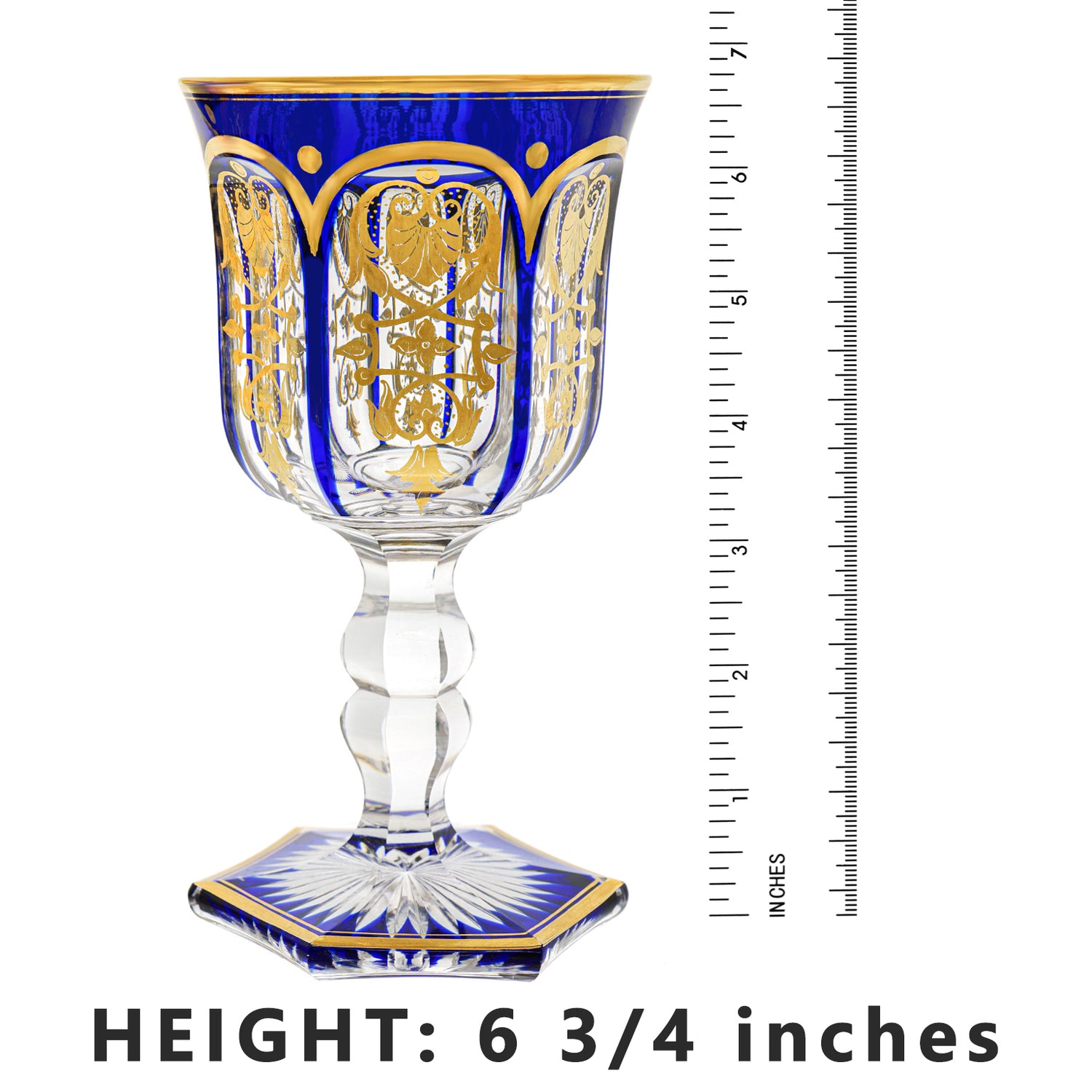Circa 1860s, Baccarat, France. These antique Baccarat water goblets are perfect for water or wine. The pattern is Empire and the look is Baroque revival, or the French decoratif movement of the Deuxieme Empire. Made in cobalt-cased glass with gorgeous gilt details, this set of 10 is especially rare as they feature a double knob on the stem instead of the usual single knob. Because of this, they also have extra height. Superbly made, they are in excellent condition.