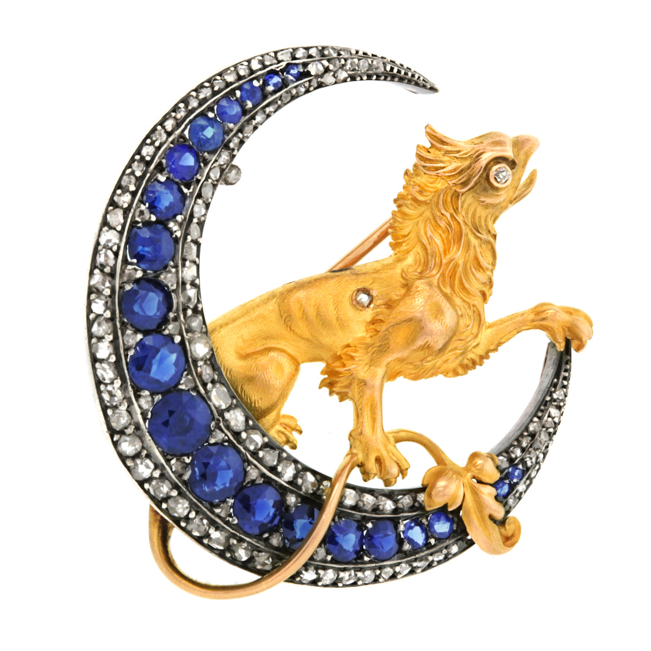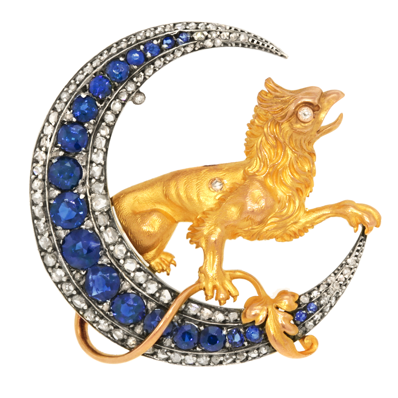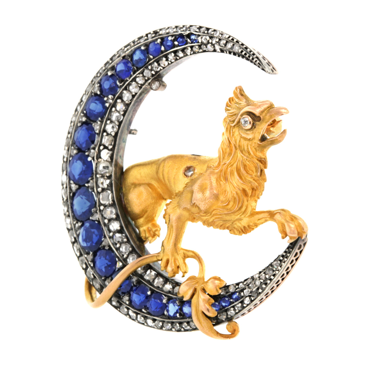 Circa 1880s. 18k, France. This magnificent French brooch features a finely modeled golden griffin sitting in a crescent moon. Set with 5 carats of well-matched sapphires and 3.25 carats of rose-cut diamonds, the pin is eye-catchingly fluid. From design to fabrication, this one-of-a-kind piece is gorgeous.