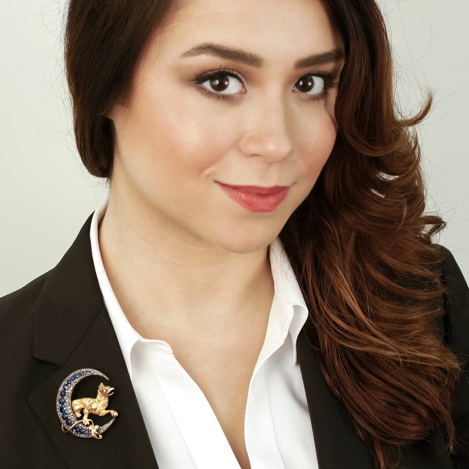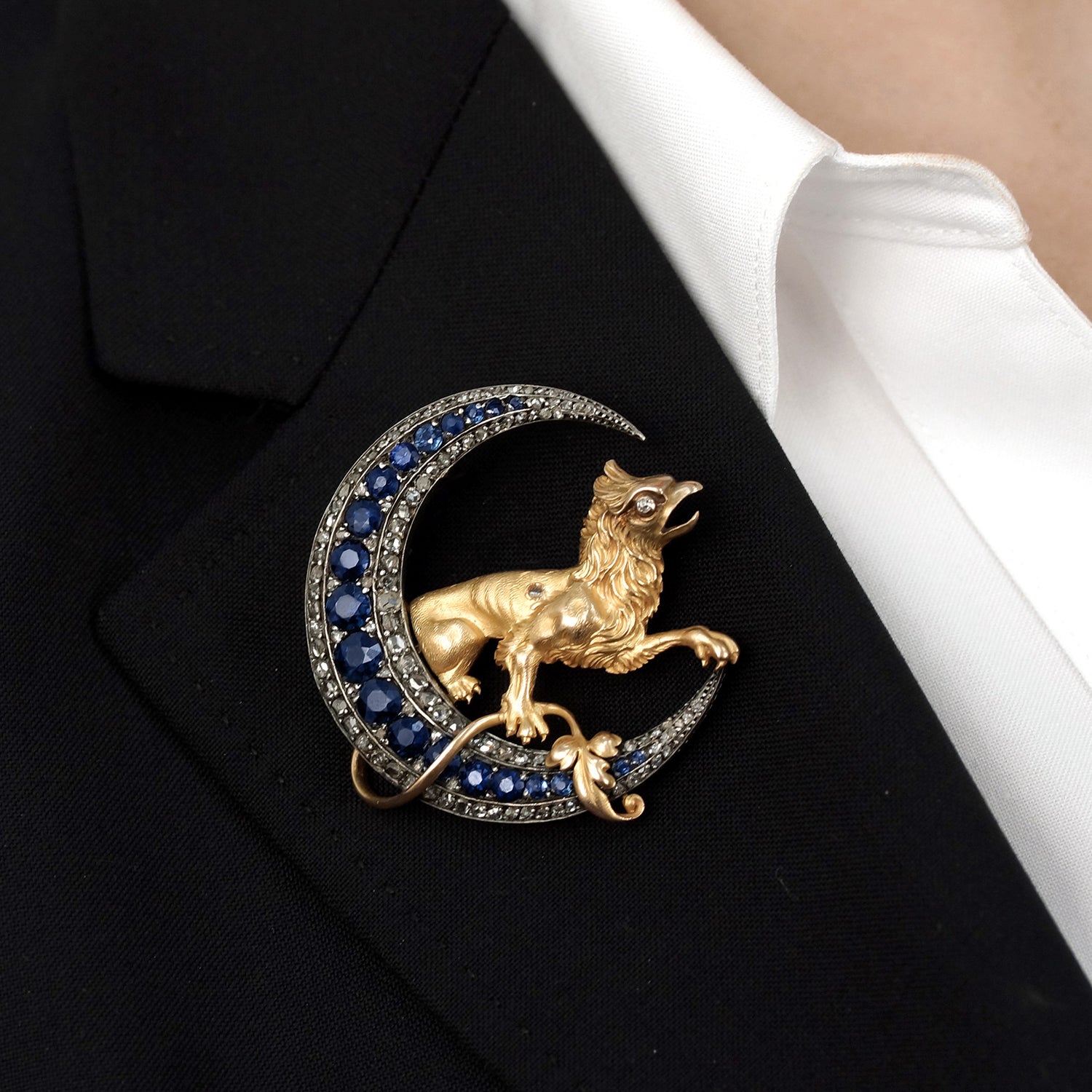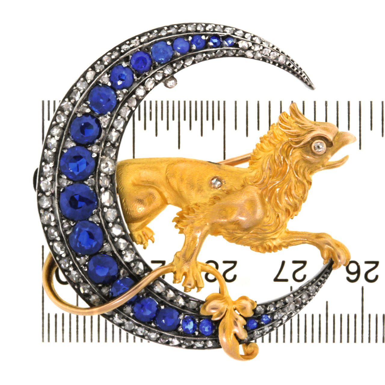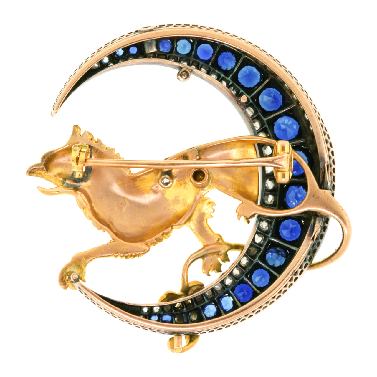 Circa 1880s. 18k, France. This magnificent French brooch features a finely modeled golden griffin sitting in a crescent moon. Set with 5 carats of well-matched sapphires and 3.25 carats of rose-cut diamonds, the pin is eye-catchingly fluid. From design to fabrication, this one-of-a-kind piece is gorgeous.
