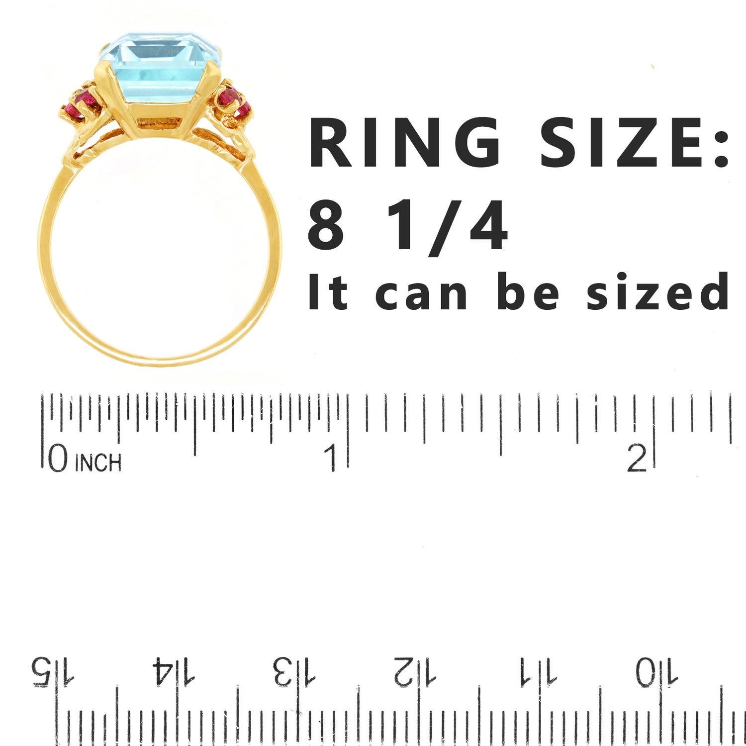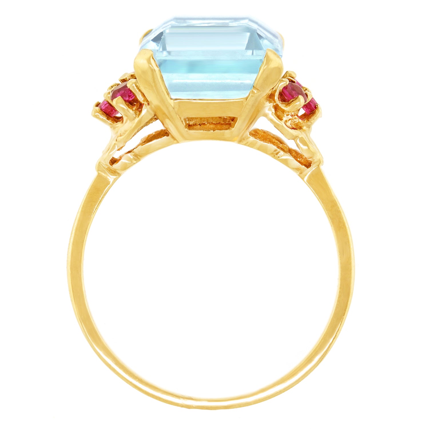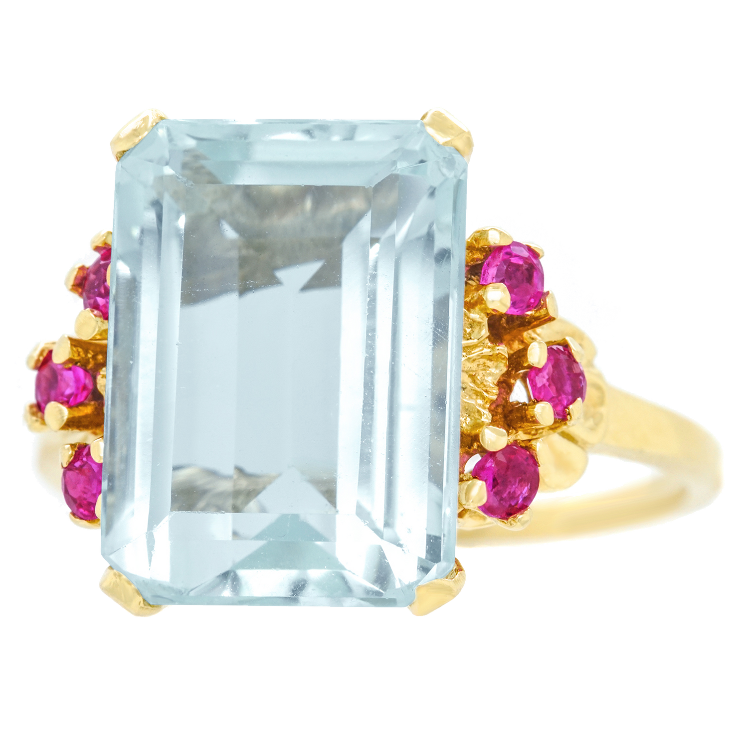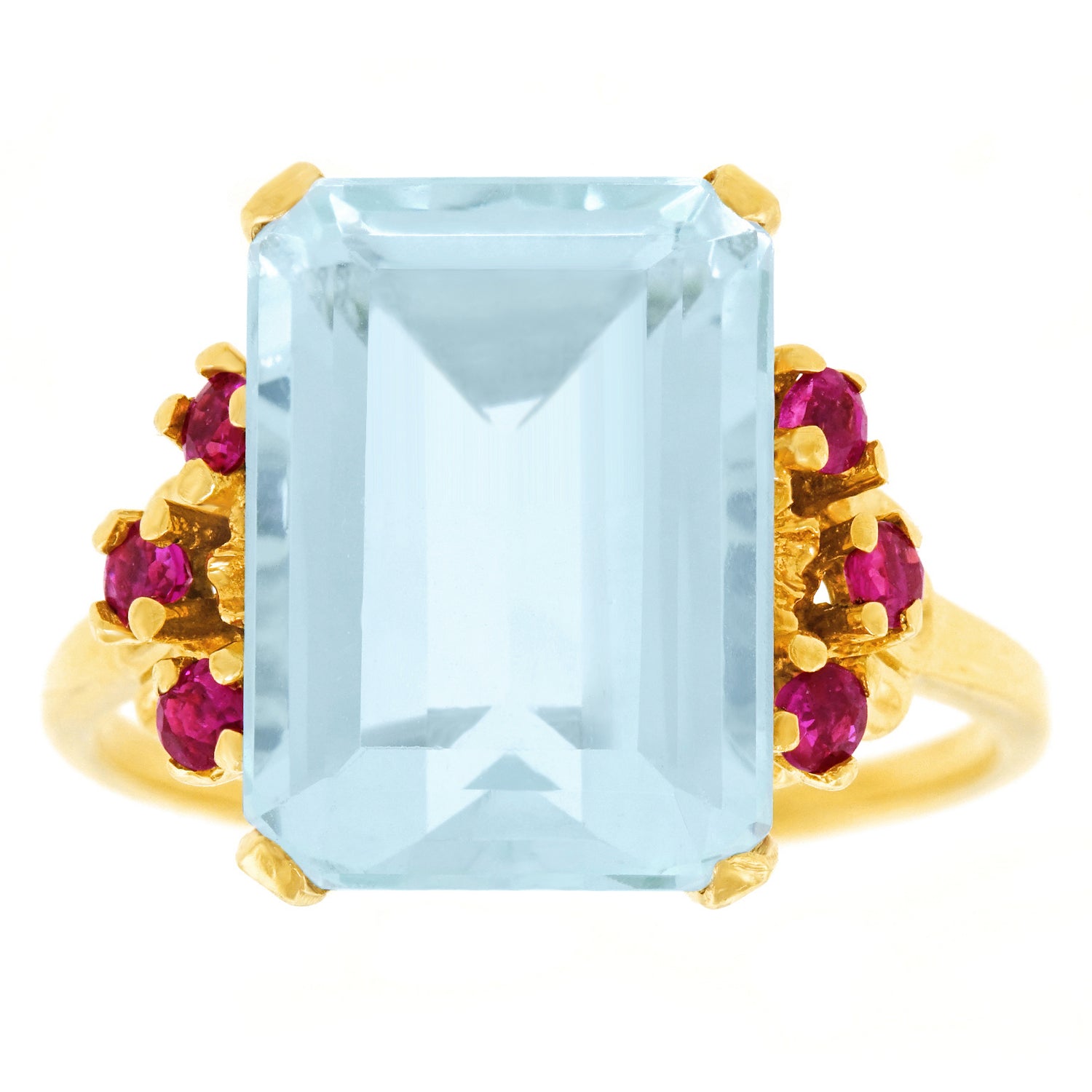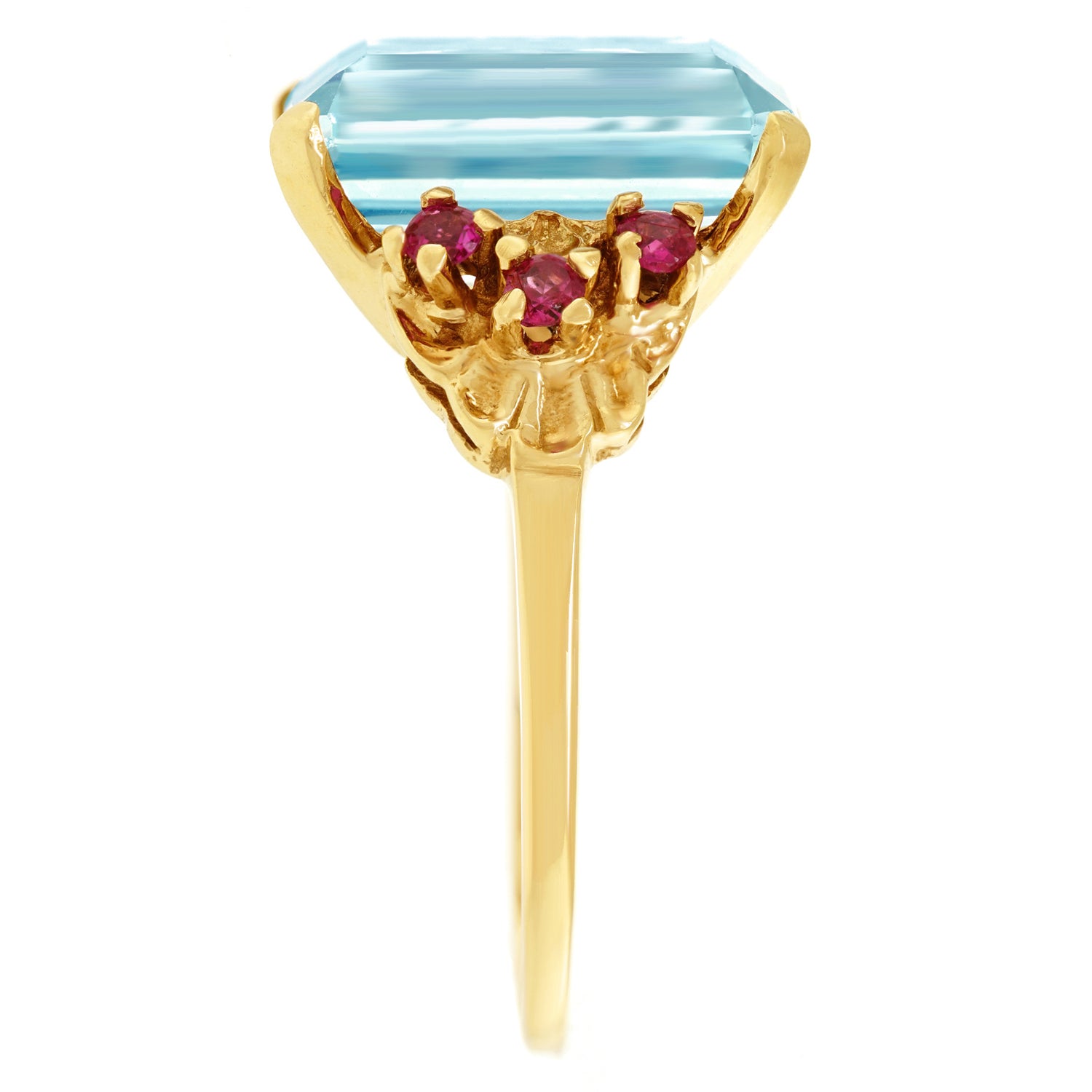 Circa 1950s, 14k, American. This classic retro fifties ring features a lush blue 7.50-carat aquamarine accented by .30 carats of fine rubies. The look is confident, colorful, and chic. Finely fashioned, this ring is the perfect size -- big enough to make a statement, yet comfortable for every day. Excellent condition.
