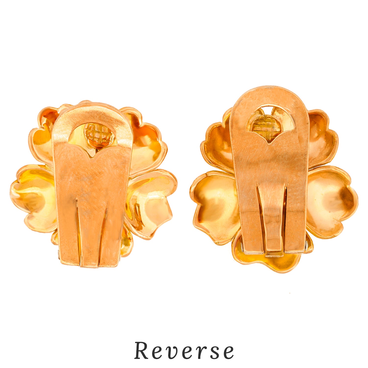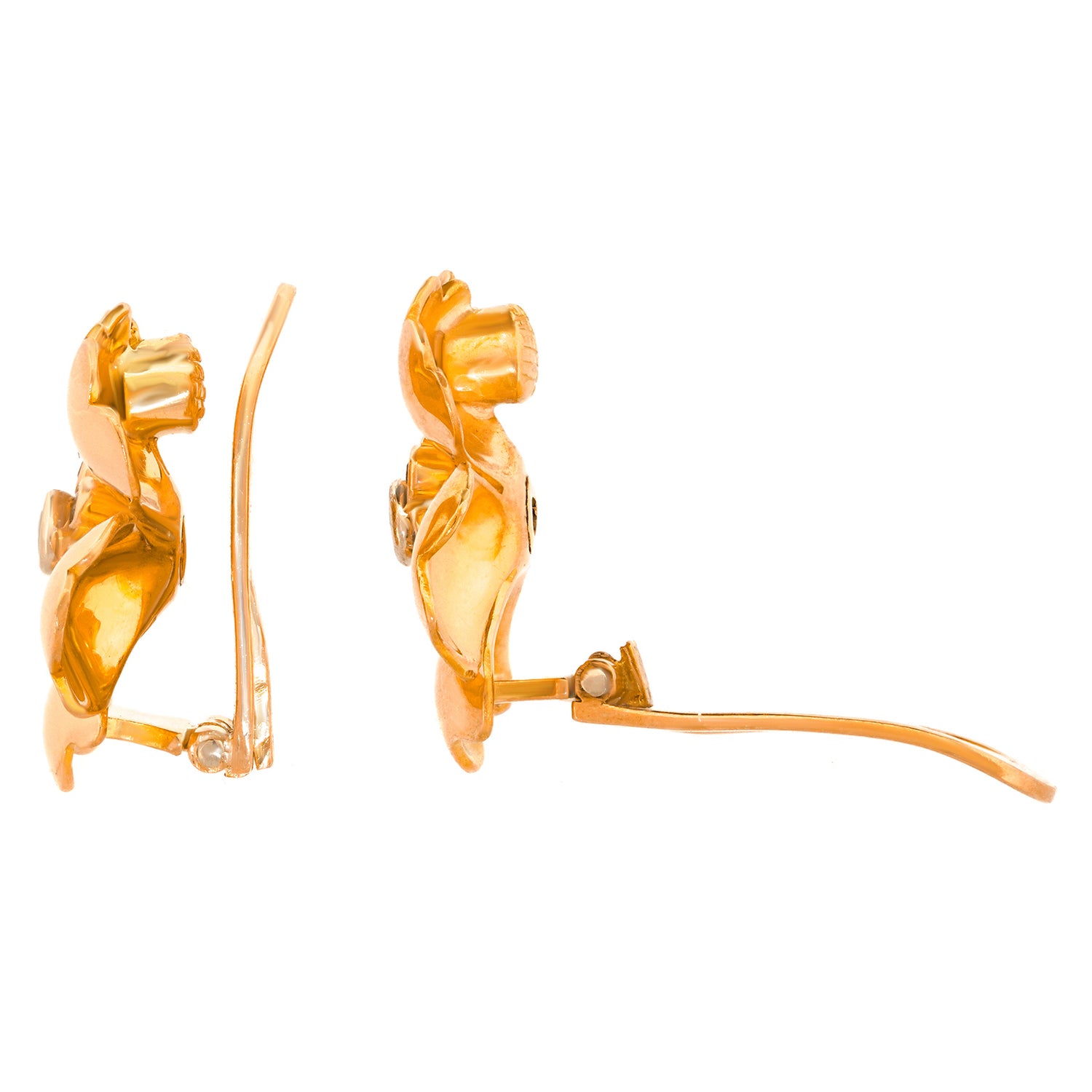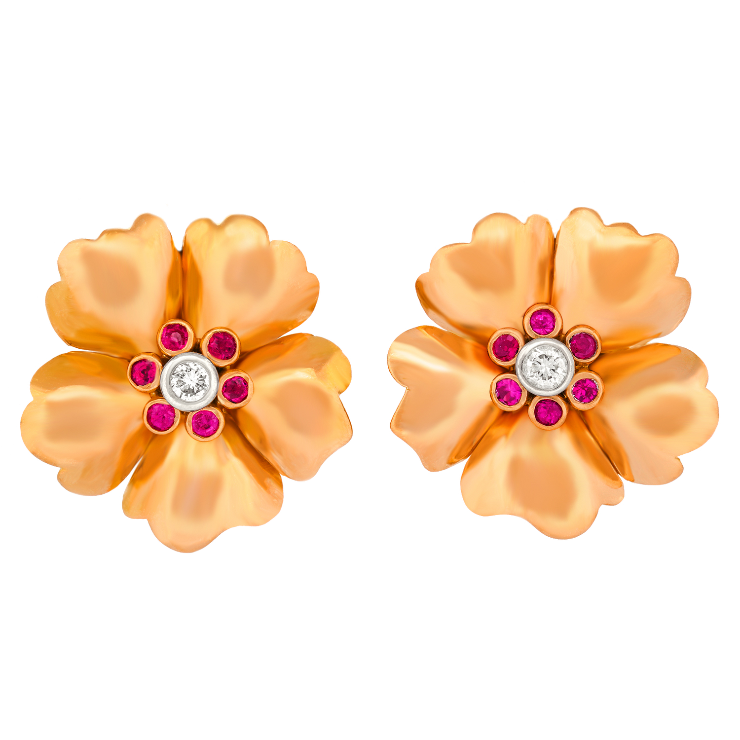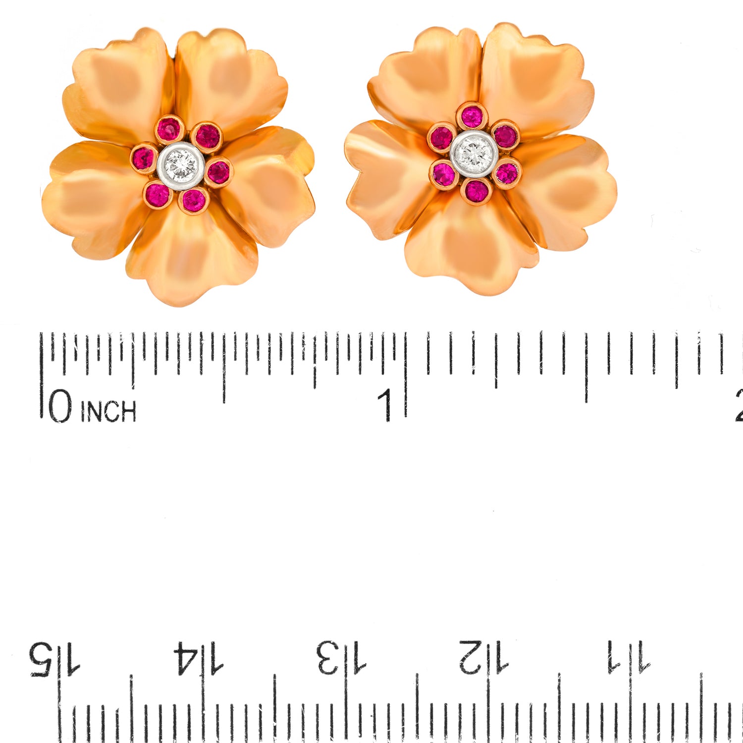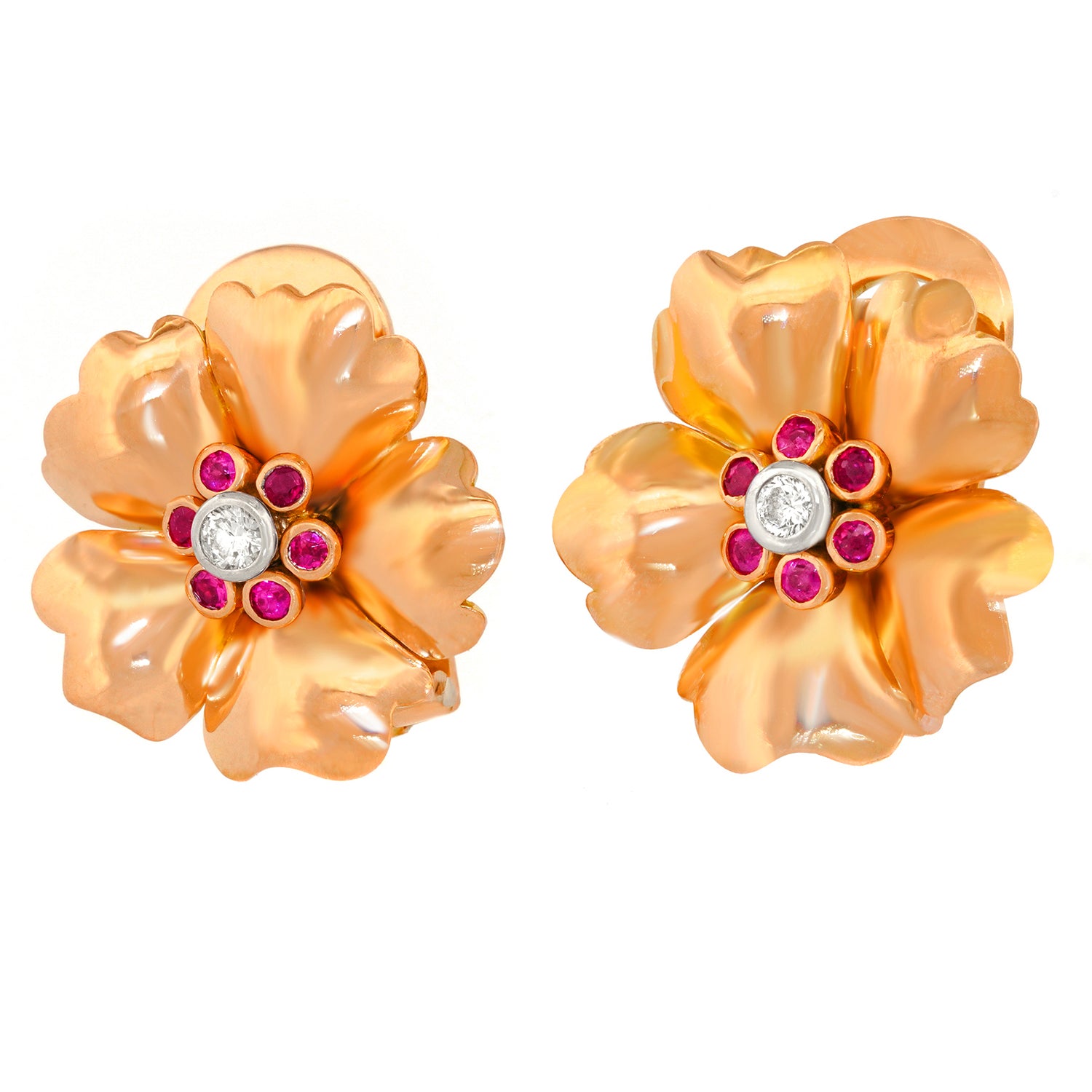 Circa 1940s, 18k. Flowers are nature's perfect fashion... flower earrings are one of the best flavors of vintage style - charmingly bold, timelessly chic, and very American. The eye is drawn by clusters of vivid red rubies around a diamond, and the polished gold petals glow from every angle. Well-made in eighteen-karat gold, they are in excellent condition.