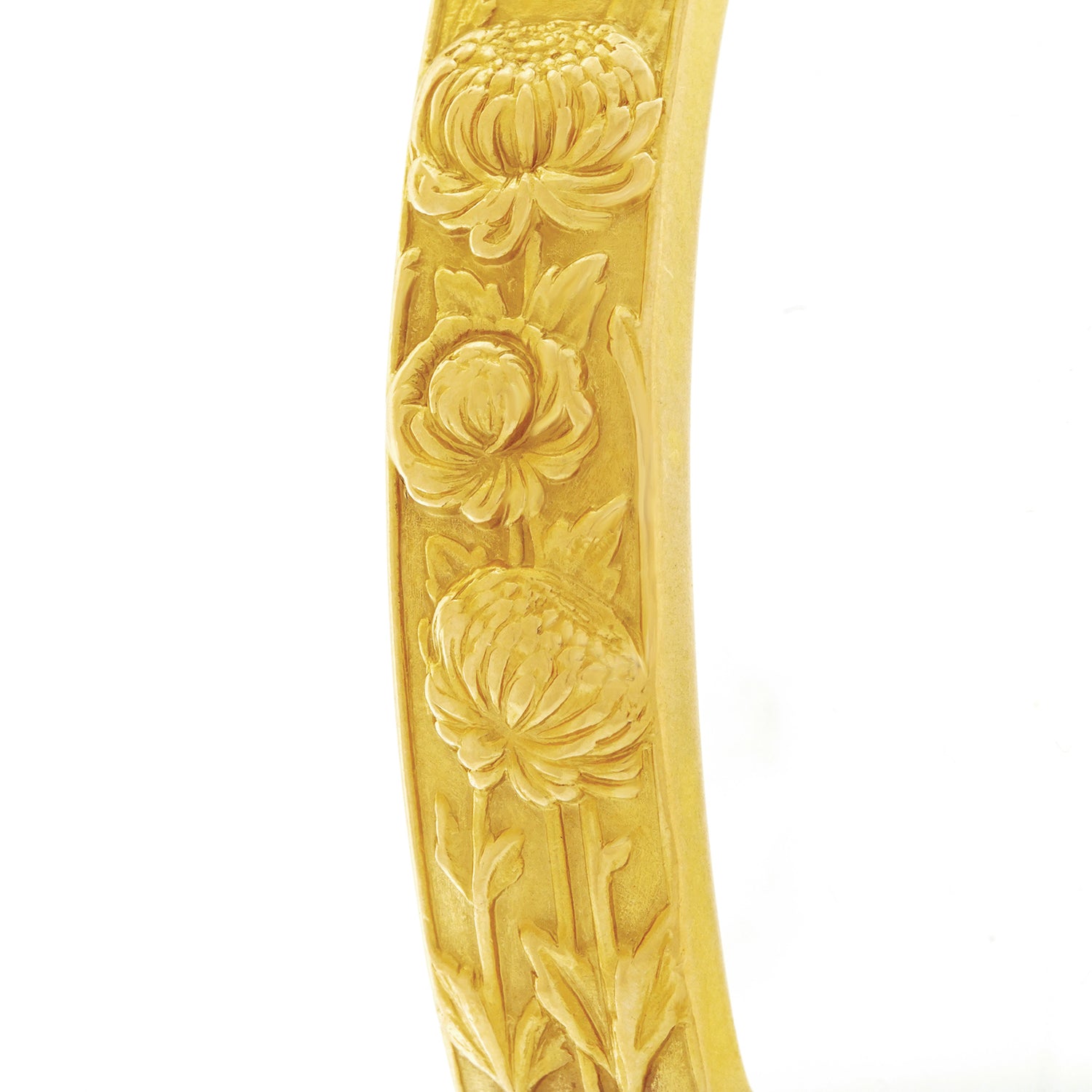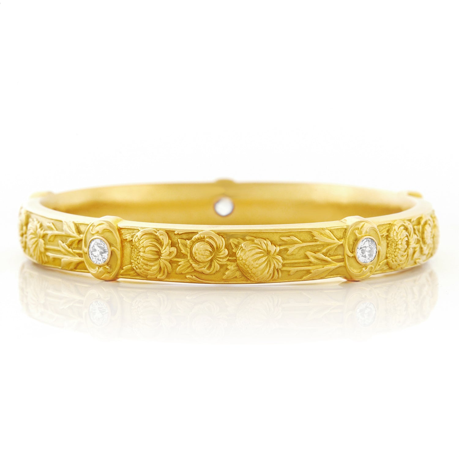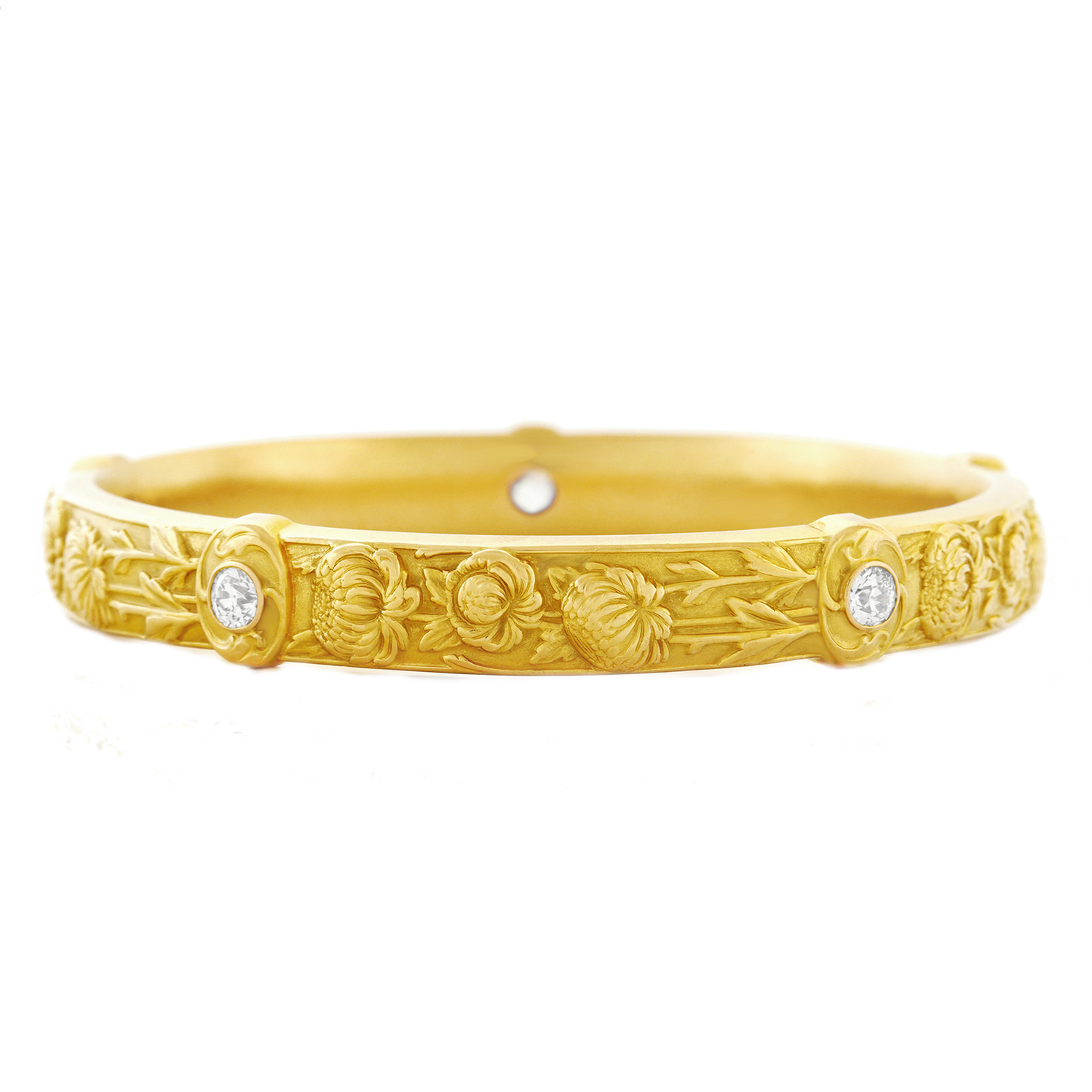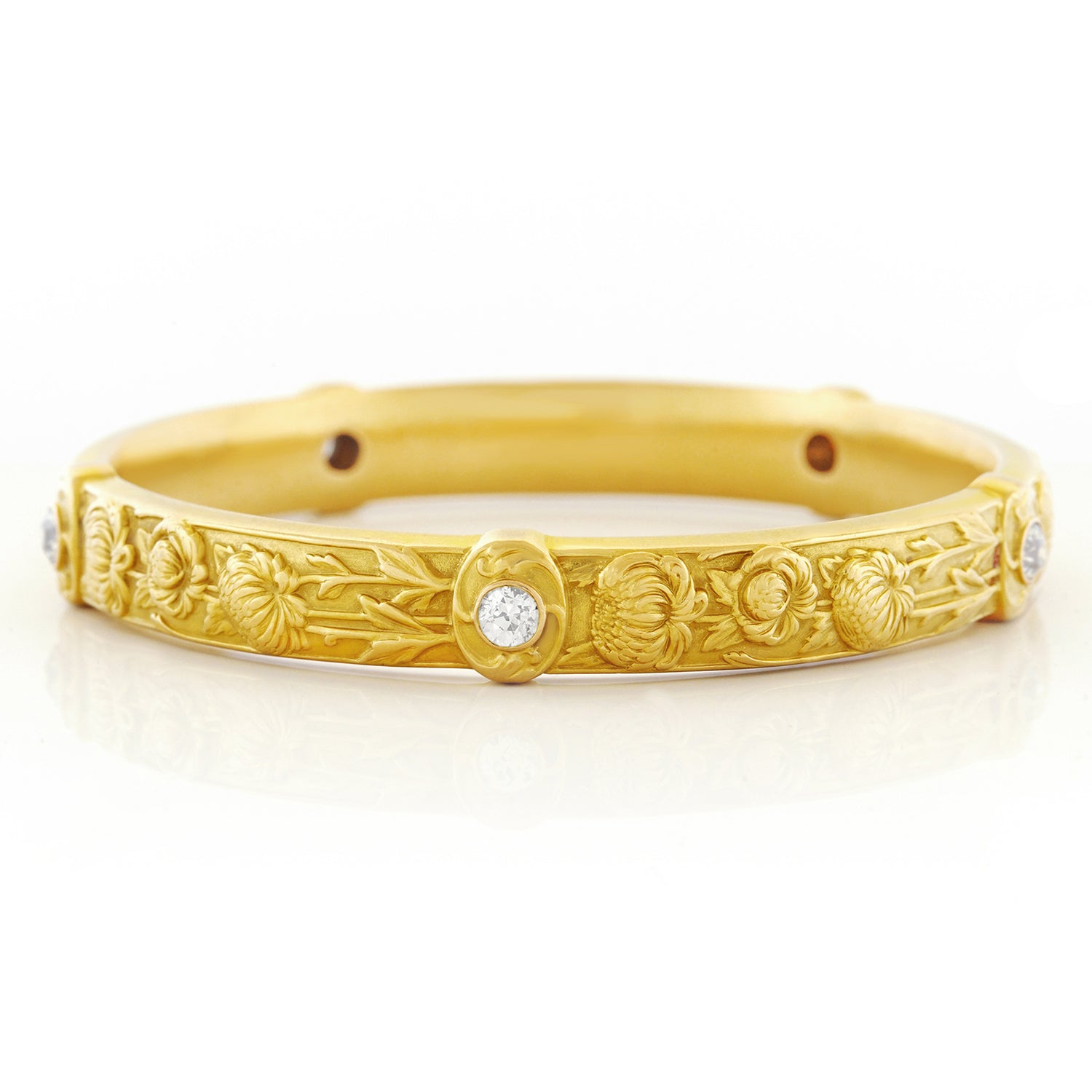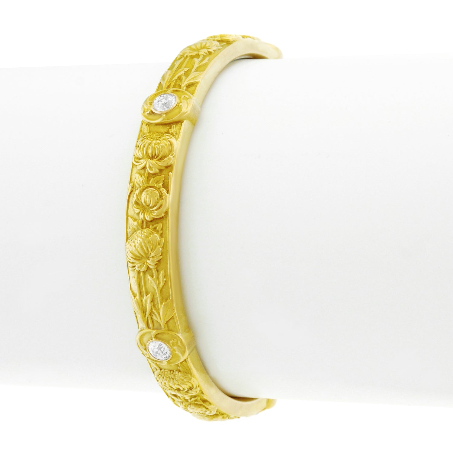 Circa 1890s, 18k, by Riker Brothers, American.  This stunning Art Nouveau bangle, in the Japanese taste by Riker Brothers, features a rare diamond-set Imperial chrysanthemum design. Delightfully antique-chic, Riker Brother bangles are matchless fashion accessories. This one is a quintessential example of how the Riker brothers were central to the Nouveau movement in America. Beautifully made, it is in very good condition.