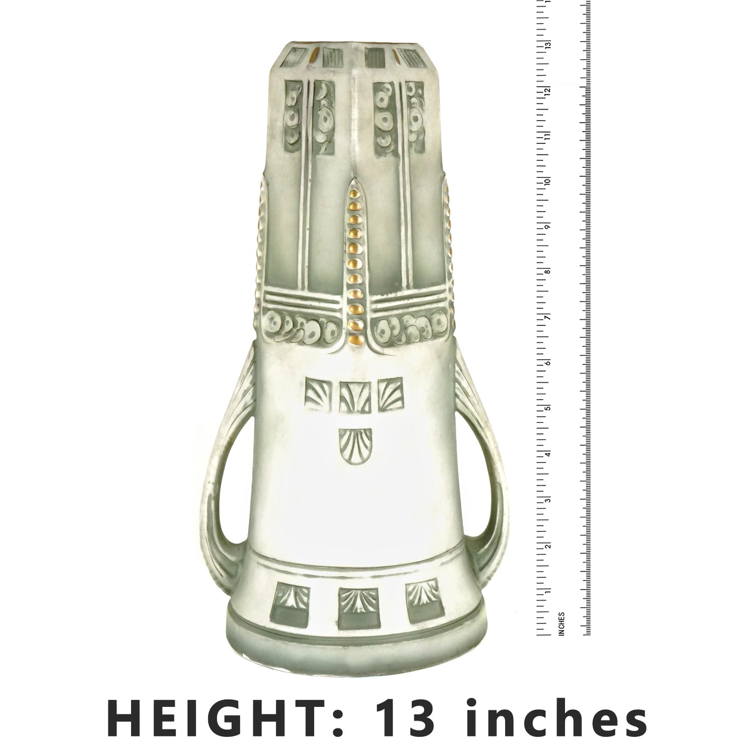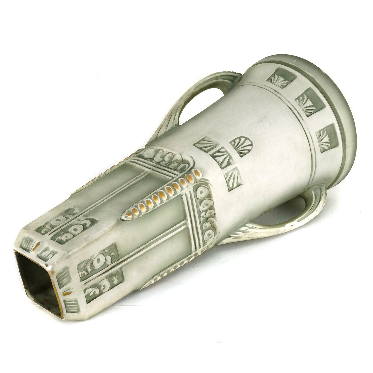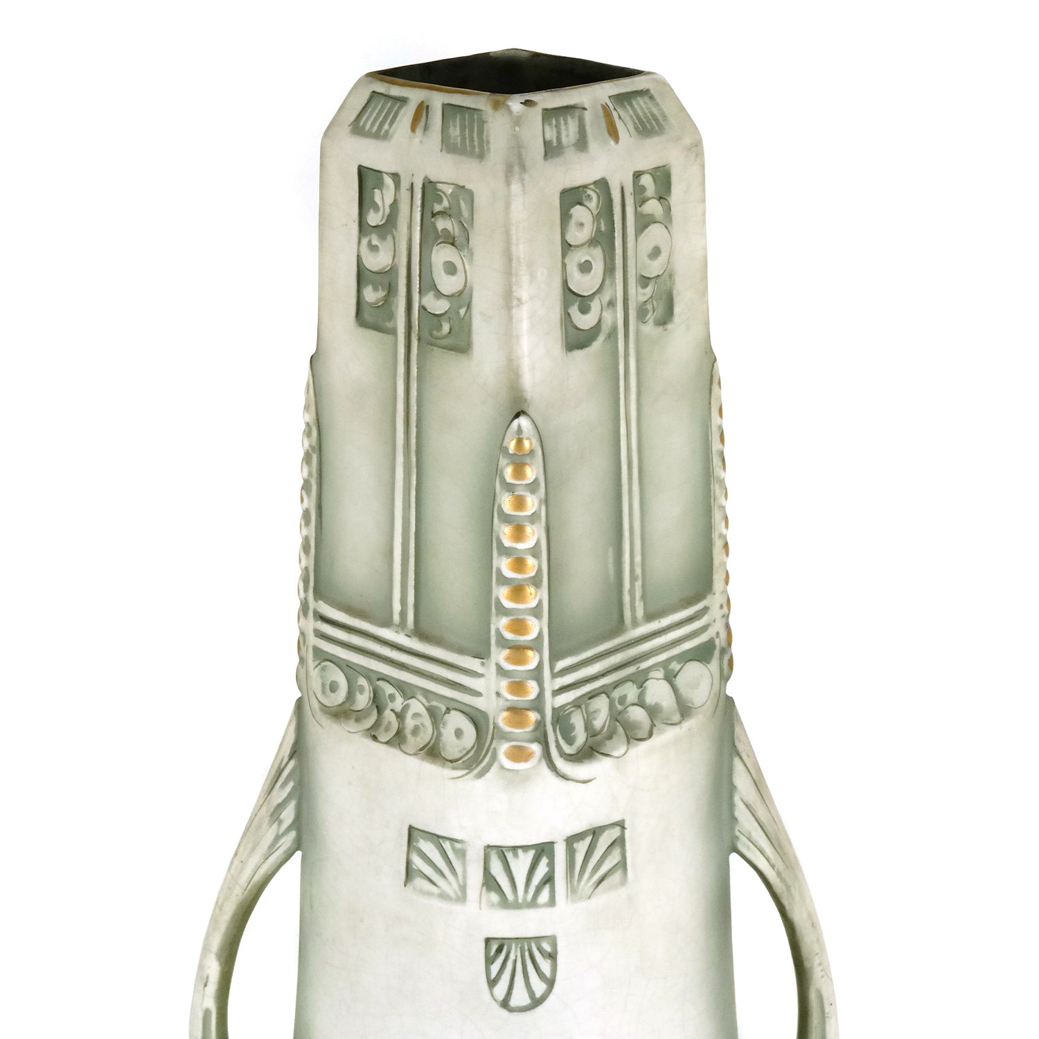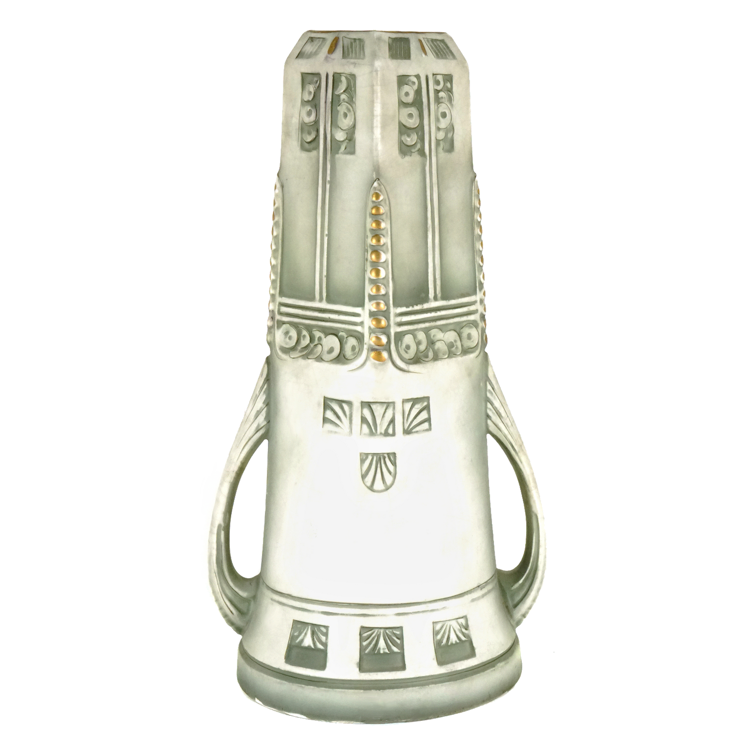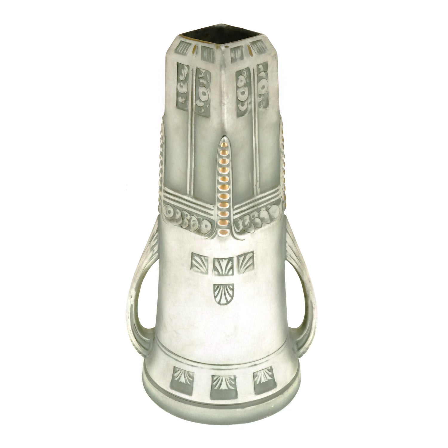 Circa 1910, by Robert Hanke for Royal Wettina, Austria. Spectacularly ahead of its time, this ultra-modern secessionist vase is bold in shape and subtle in coloration. A very rare and imaginative example of Robert Hanke's work, the compartmentalized design and unusual low handles foreshadow Deco yet to come. The look is very understated and perfect for any modernist décor. Replete in its otherworldliness, this Austrian vase reminds us that Vienna and Paris were the epicenters of the design world at the turn of the century. Very good condition.