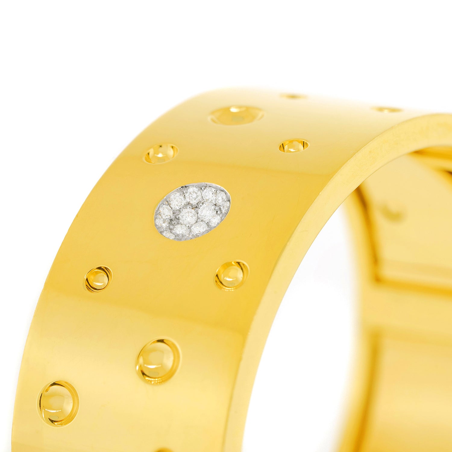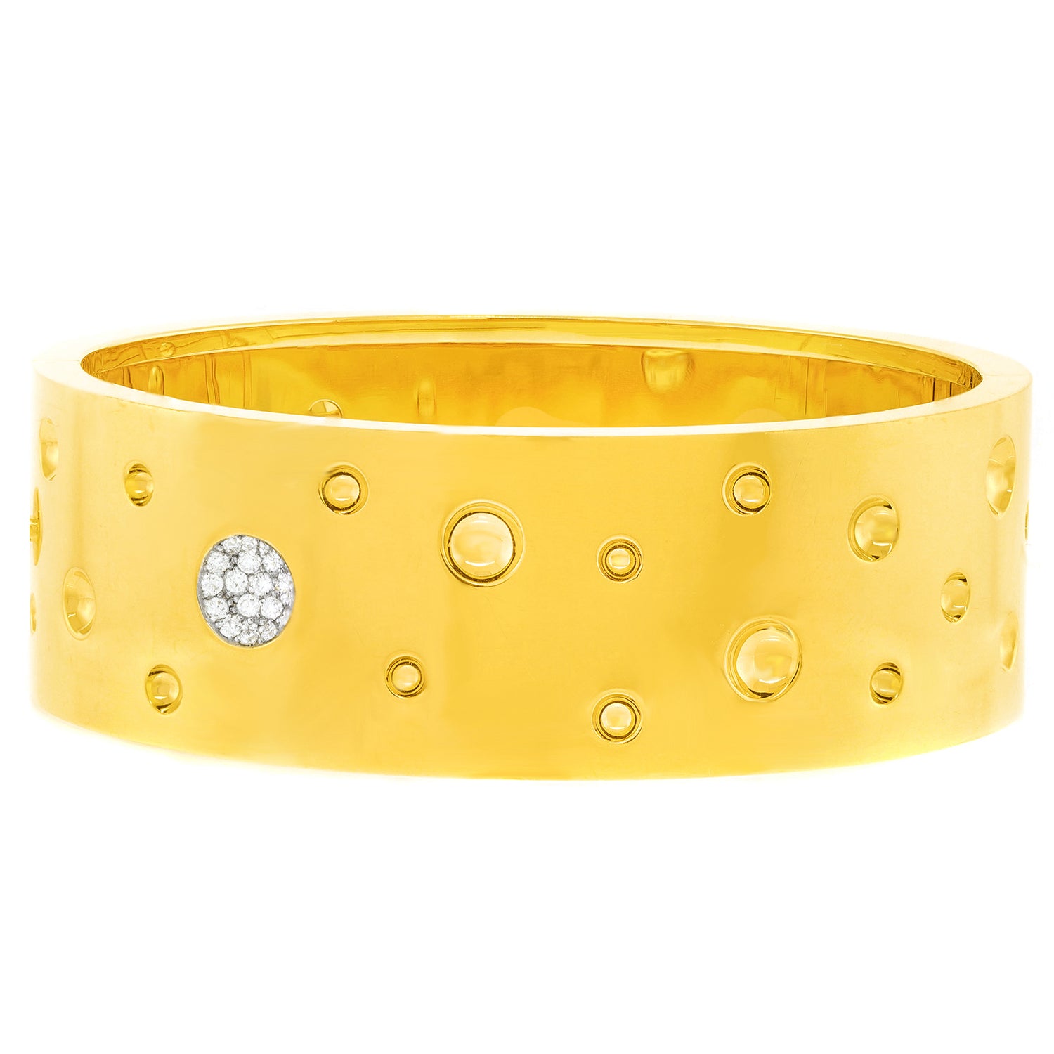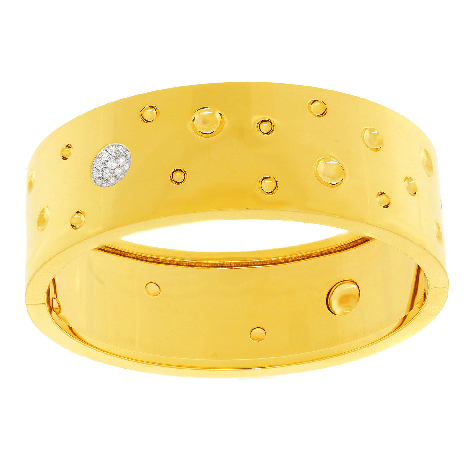 Circa 2020s, 18k, by Roberto Coin, Italy. This Roberto Coin 18k yellow gold bracelet is set with .20 carats of fine white diamonds (G color, VS clarity) and features a reverse bubble motif. Synonymous with quality and style, Roberto Coin started his eponymous jewelry firm in 1996. This contemporary jewel is not current collection, but is recent. Beautifully made, it is in excellent condition.