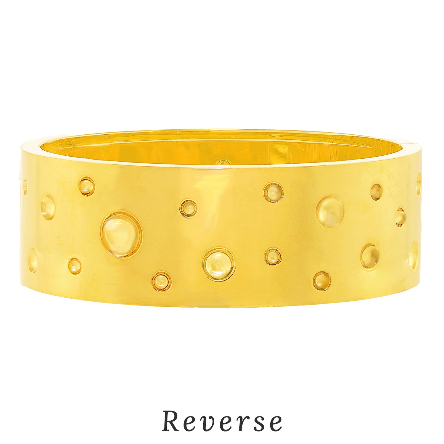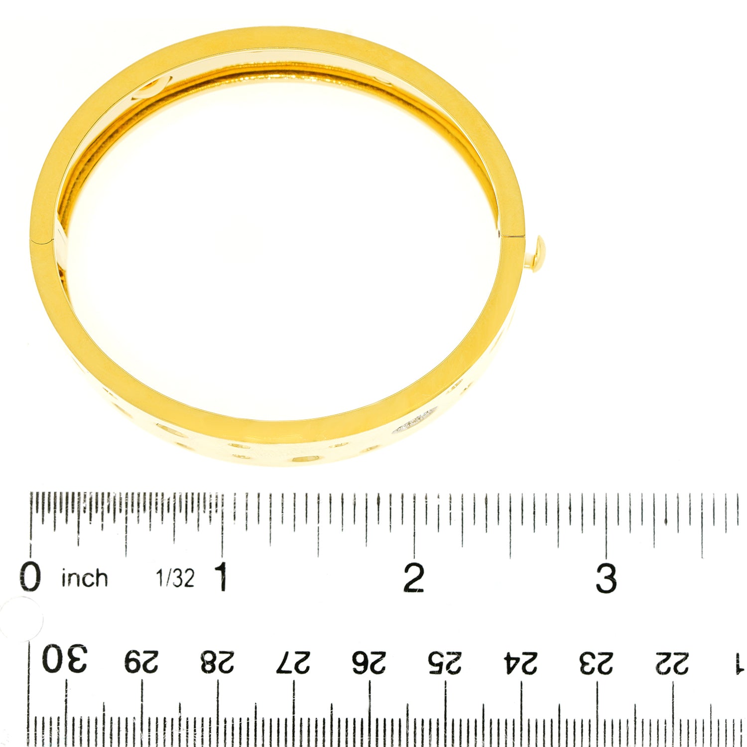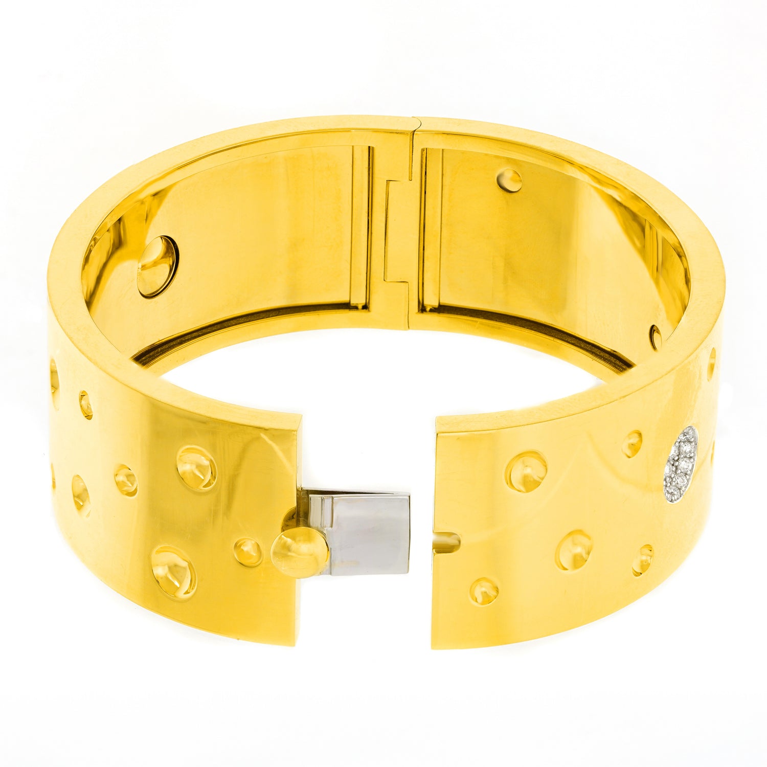 Circa 2020s, 18k, by Roberto Coin, Italy. This Roberto Coin 18k yellow gold bracelet is set with .20 carats of fine white diamonds (G color, VS clarity) and features a reverse bubble motif. Synonymous with quality and style, Roberto Coin started his eponymous jewelry firm in 1996. This contemporary jewel is not current collection, but is recent. Beautifully made, it is in excellent condition.