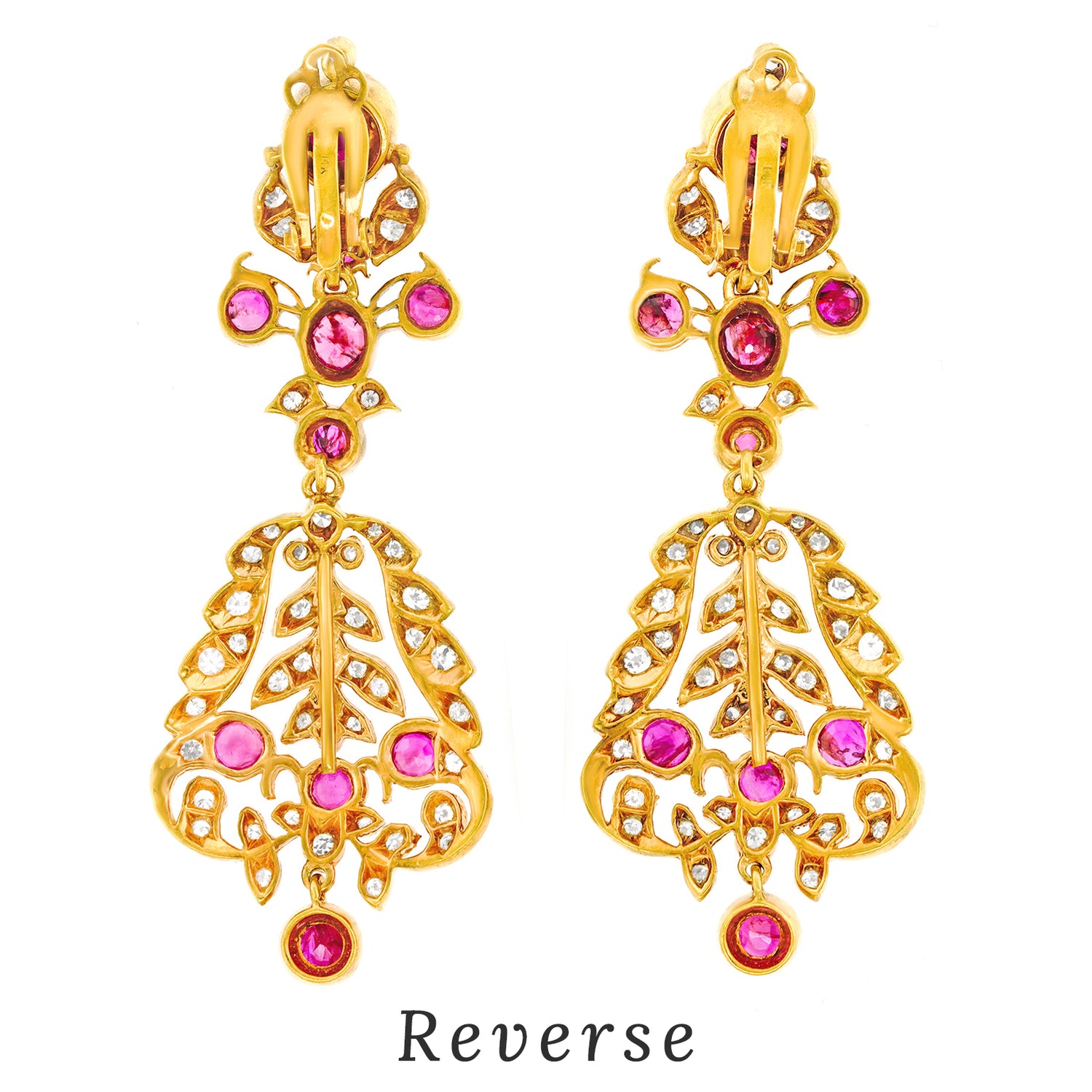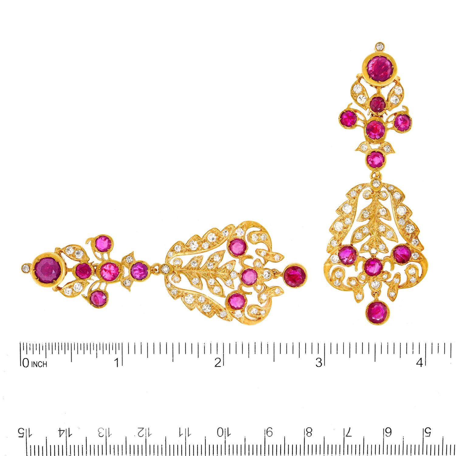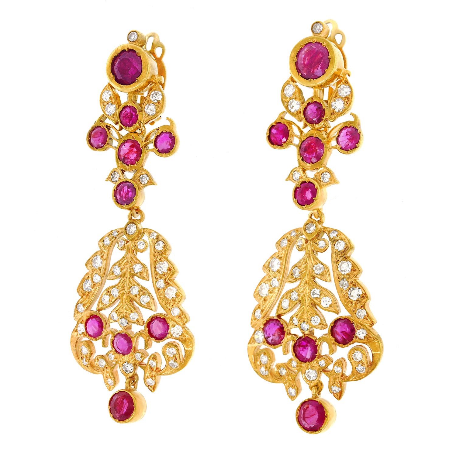 Circa 1920s, 14k, India. These one-of-a-kind Mogul motif earrings are set with 8.0 carats of rubies and 3.0 carats of brilliant white diamonds. Seamlessly mixing old-world style with modern fashion, the look is vintage chic at its antique India best. Finely fashioned, they are comfortable and in excellent condition.