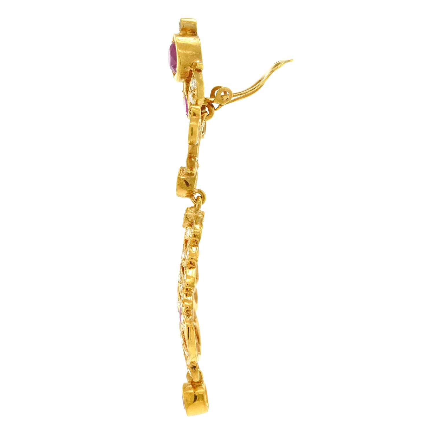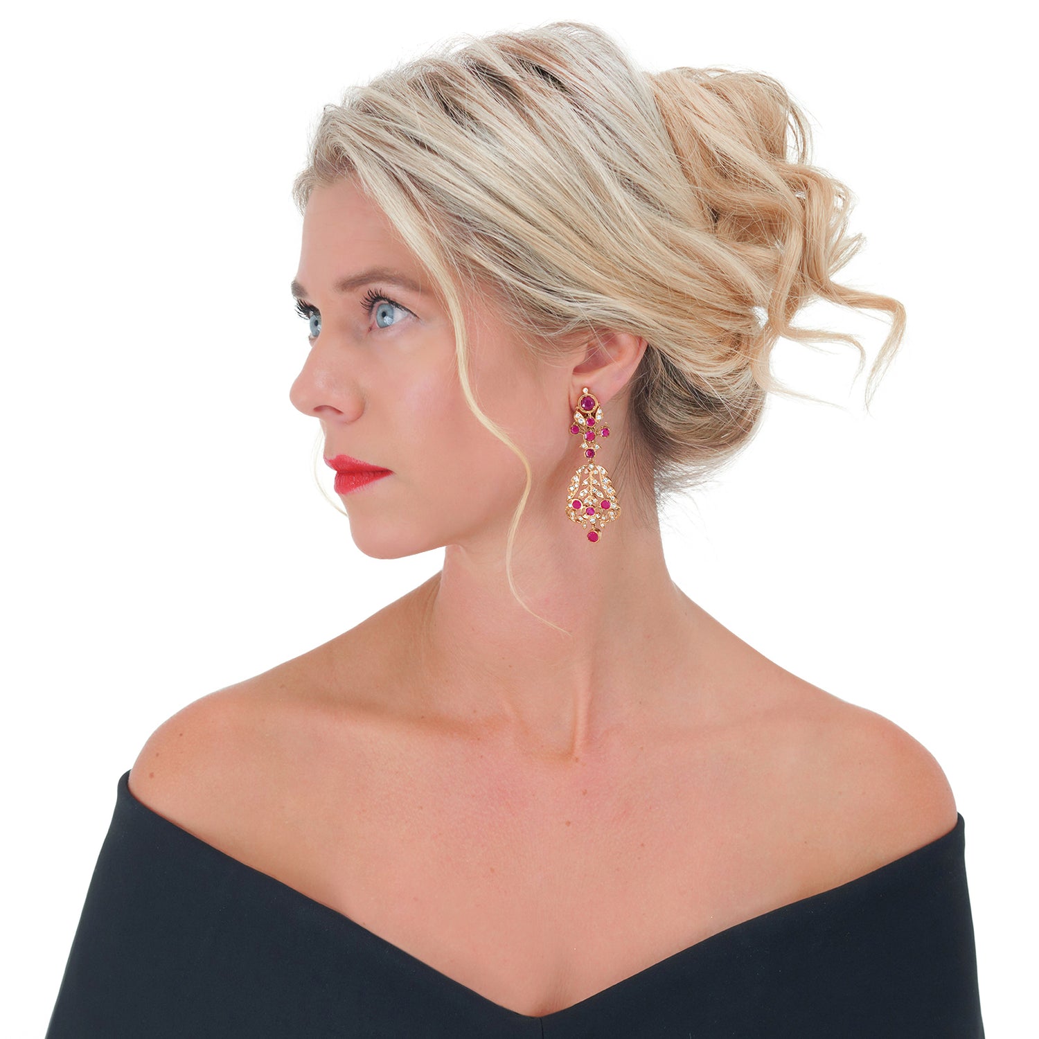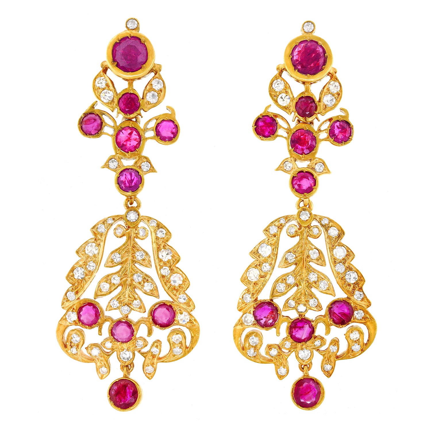 Circa 1920s, 14k, India. These one-of-a-kind Mogul motif earrings are set with 8.0 carats of rubies and 3.0 carats of brilliant white diamonds. Seamlessly mixing old-world style with modern fashion, the look is vintage chic at its antique India best. Finely fashioned, they are comfortable and in excellent condition.