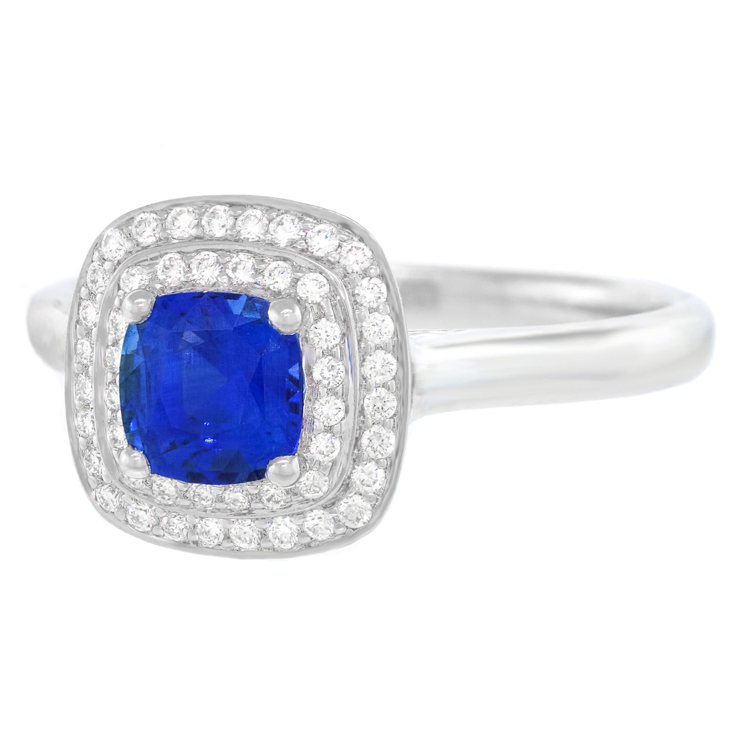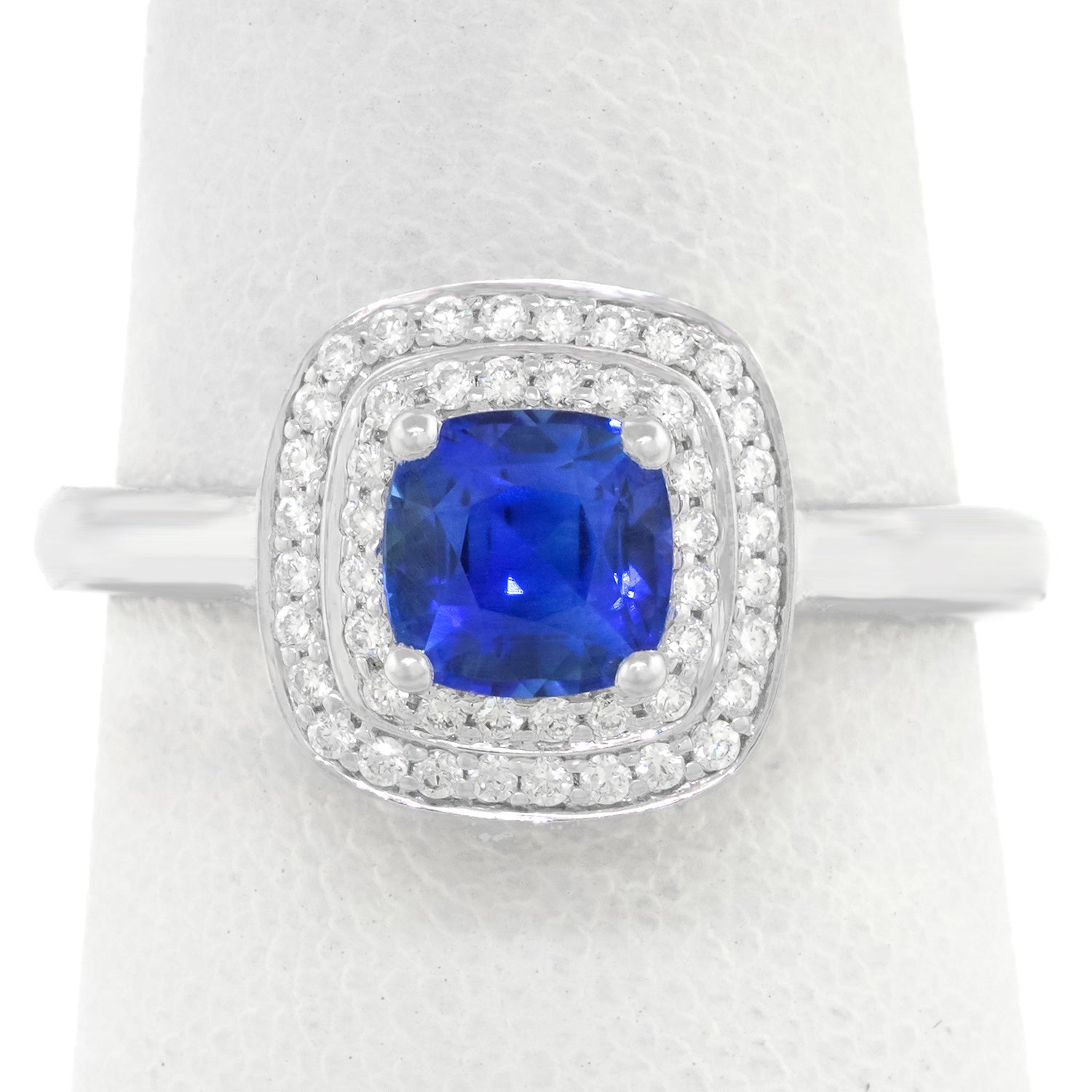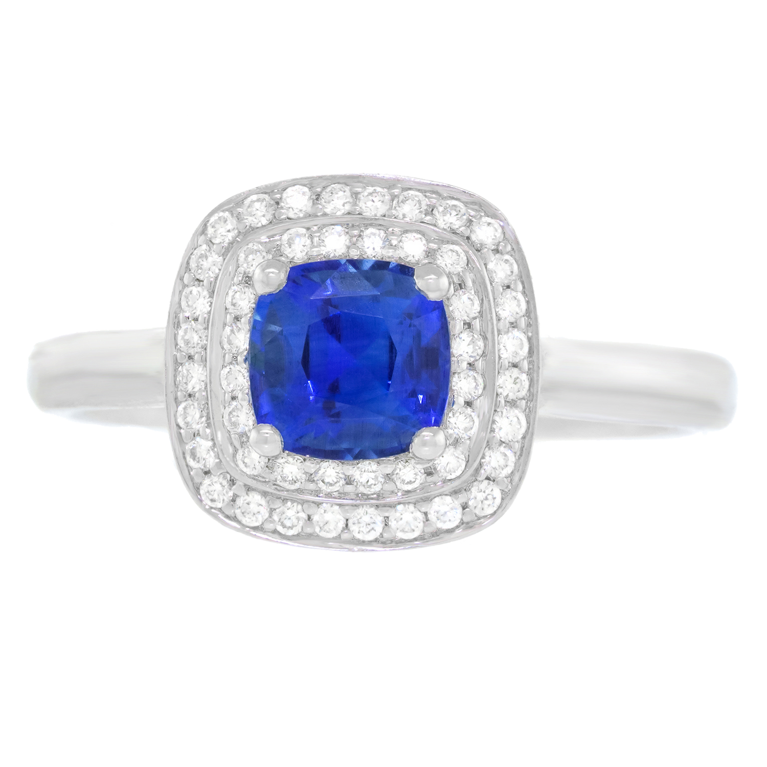 Circa 2000s, 18k, by Spark Creations, New York. The 1.0-carat lush cornflower blue sapphire in this gorgeous 18-karat white gold ring is surrounded by a double row of brilliant white diamonds (.20 carats, G color, VS clarity). Perfect for every day or as an engagement ring, the classic look is underscored by superb fabrication. For over 40 years, Spark Creations, based in New York City, has made spectacular jewelry. Excellent condition.