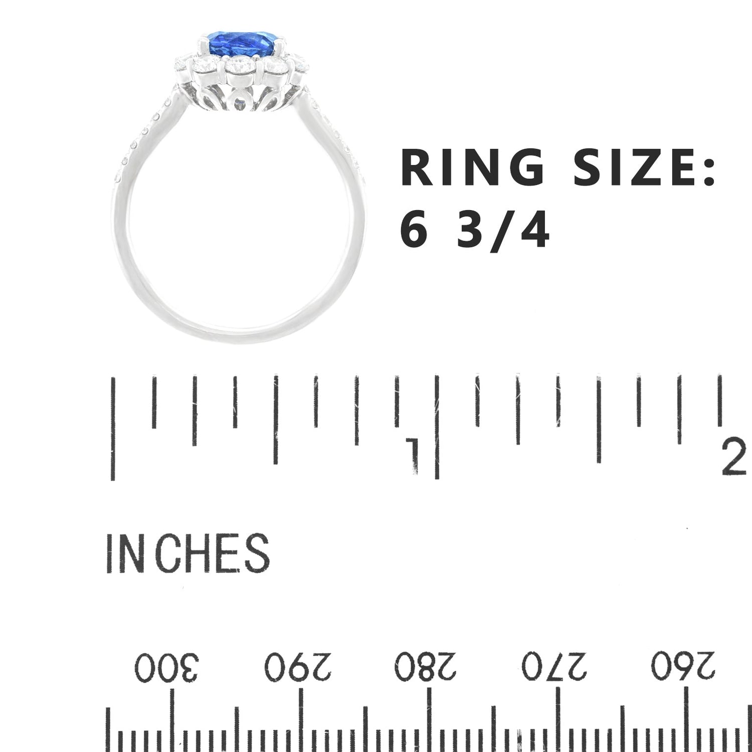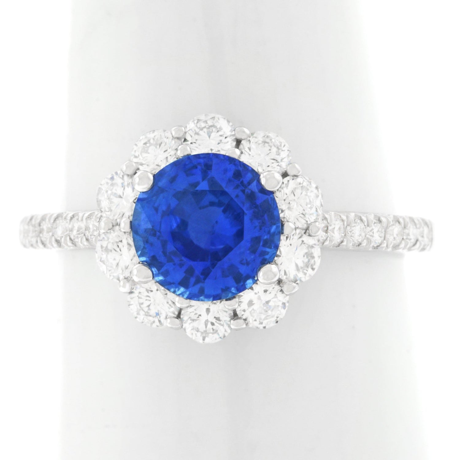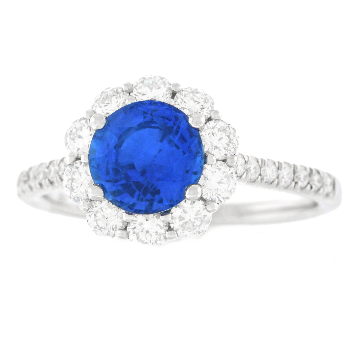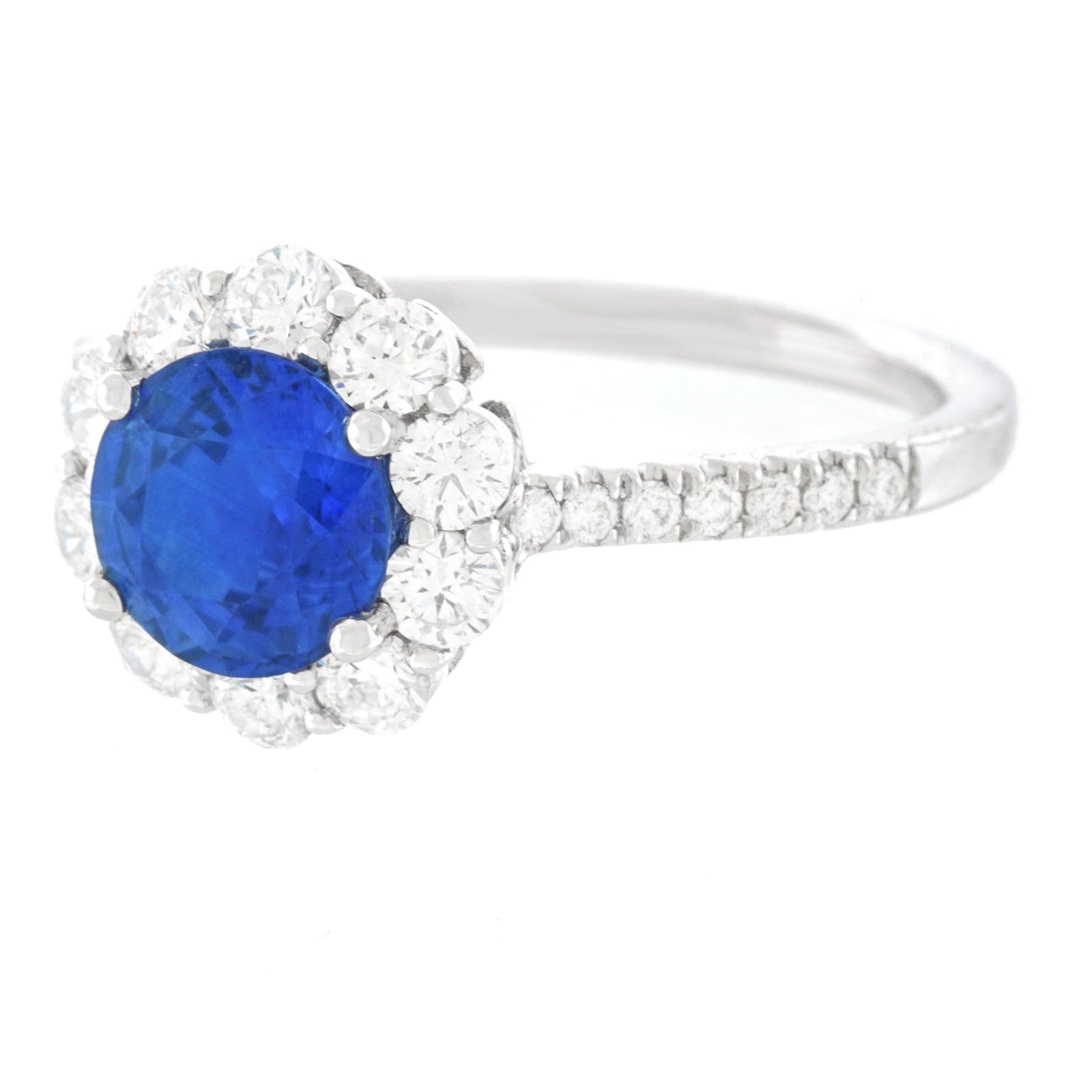 Circa 2000s, 18k, American. Surrounded by 1.0 carats of fine white diamonds, the main drama of this ring is the vivid 1.62-carat cornflower blue sapphire. Stunning from every angle, this ring is a perfect never-take-it-off jewel. Meticulously fabricated, it is in excellent condition.