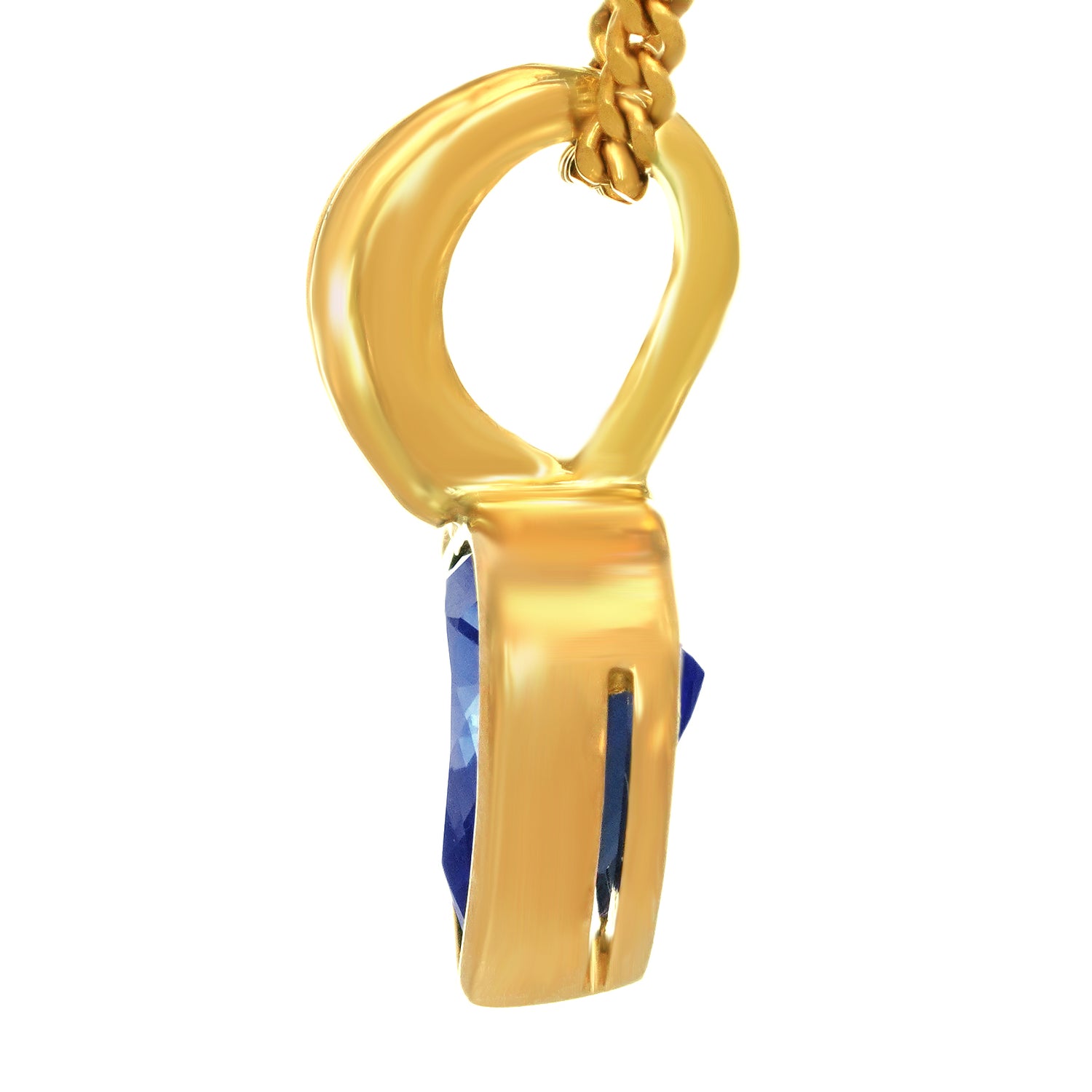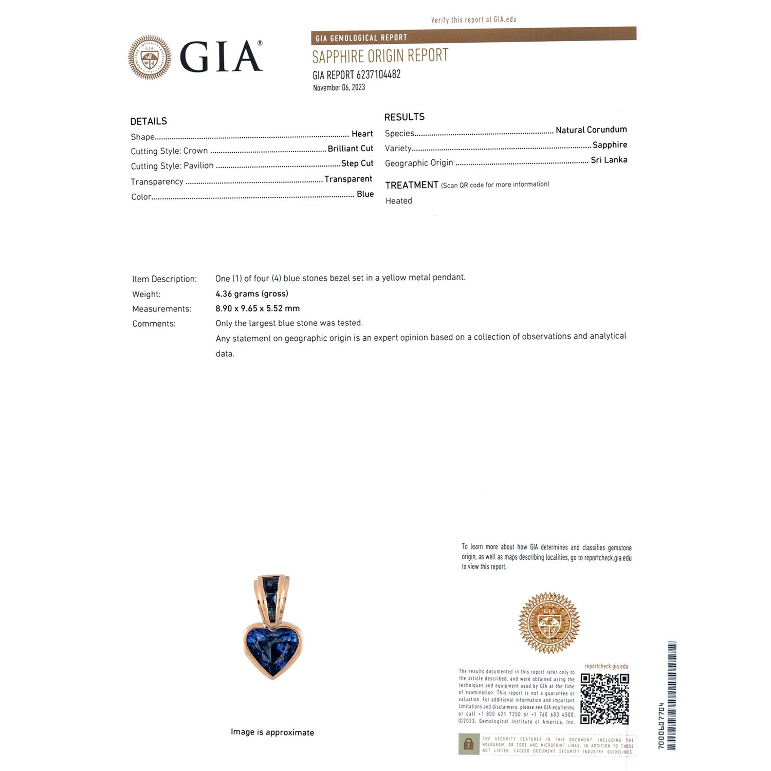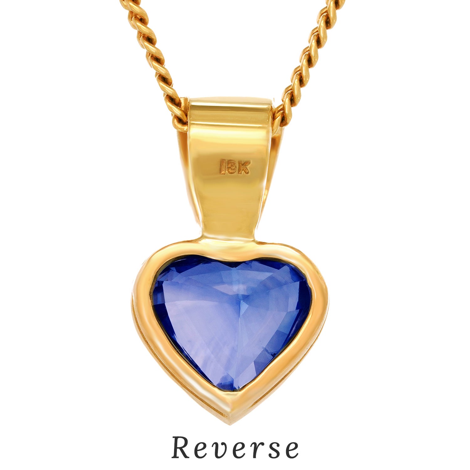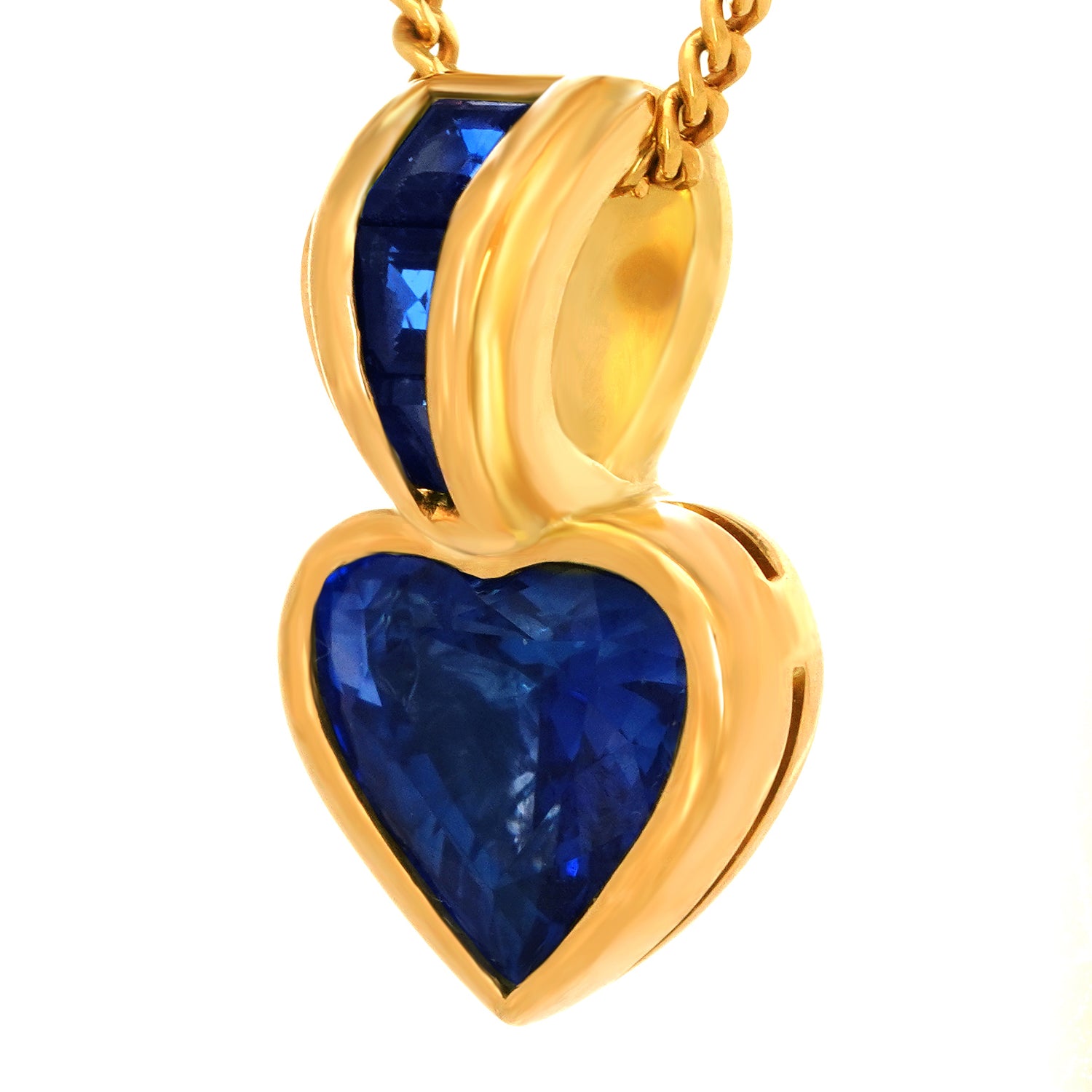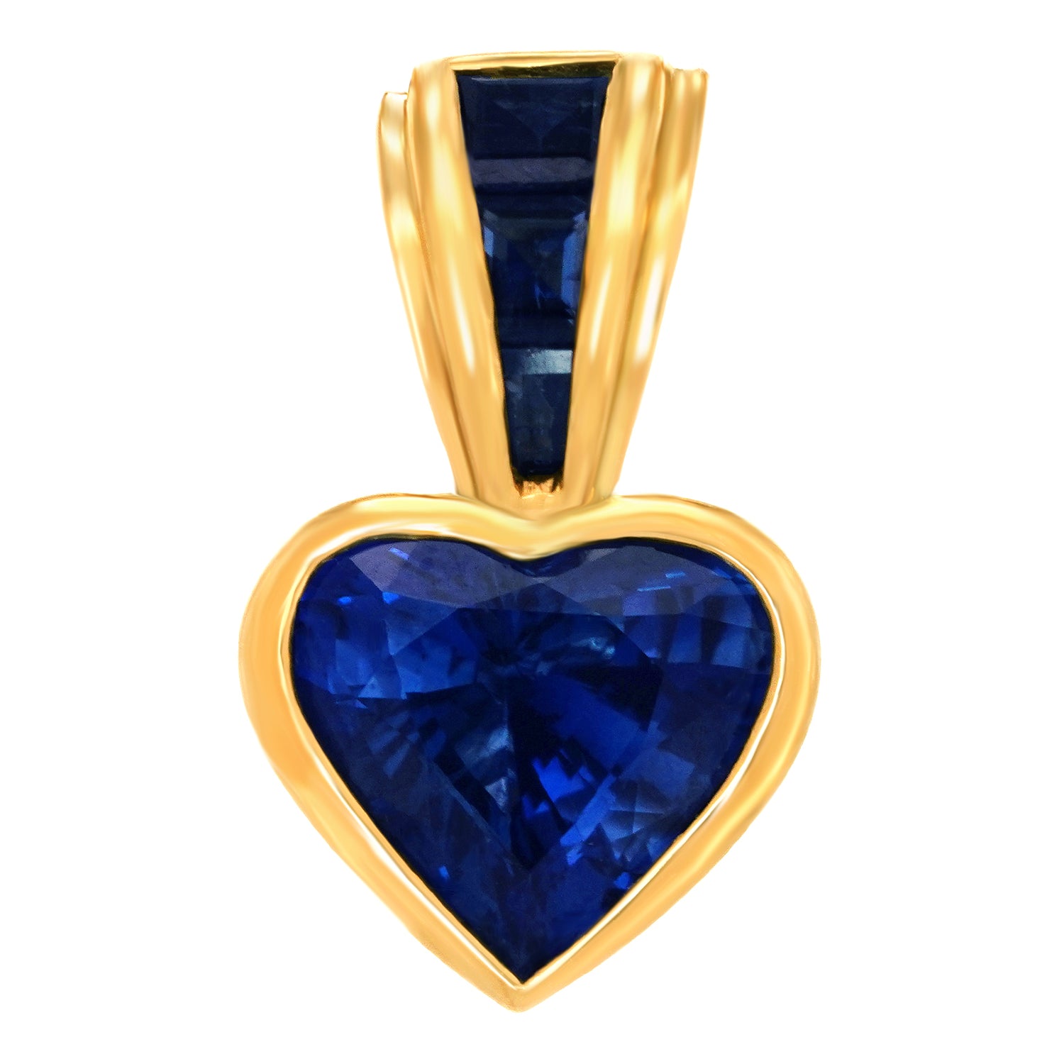 Circa 1980s, 18k. This chic heart-shaped pendant features a stunning four-and-a-half-carat cornflower blue Ceylon sapphire. The look is eighties elegance perfection. Finely constructed in eighteen-karat yellow gold, the bale is set with an additional .50 carats of blue sapphire. Excellent condition.