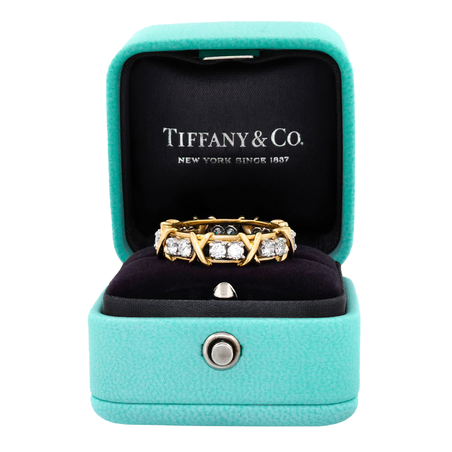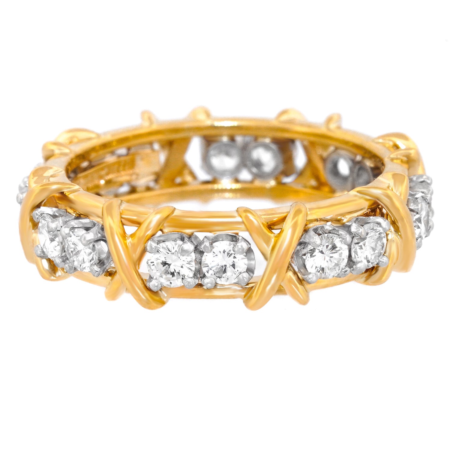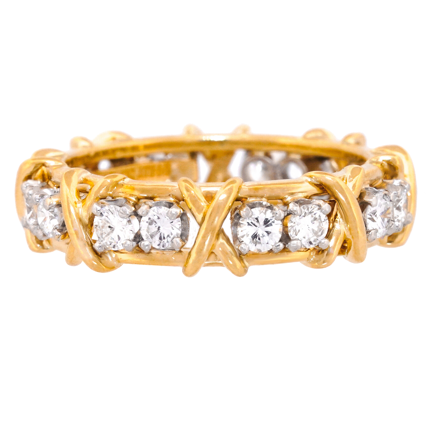 Circa 1980s, 18k, by Jean Schlumberger for Tiffany & Co. Iconic Tiffany style at its Schlumberger best! This 16-stone ring features a traditional ribbon of X's and diamond O's. A rather rare, all yellow gold version, this one is a size 6. Schlumberger's visionary designs honored the Tiffany tradition while creating a dazzling new body of work. This ring is an older version, with a bit more diamond weight (1.50 carats of F color and VS clarity) than the new ones. Beautifully made, it is in excellent condition.