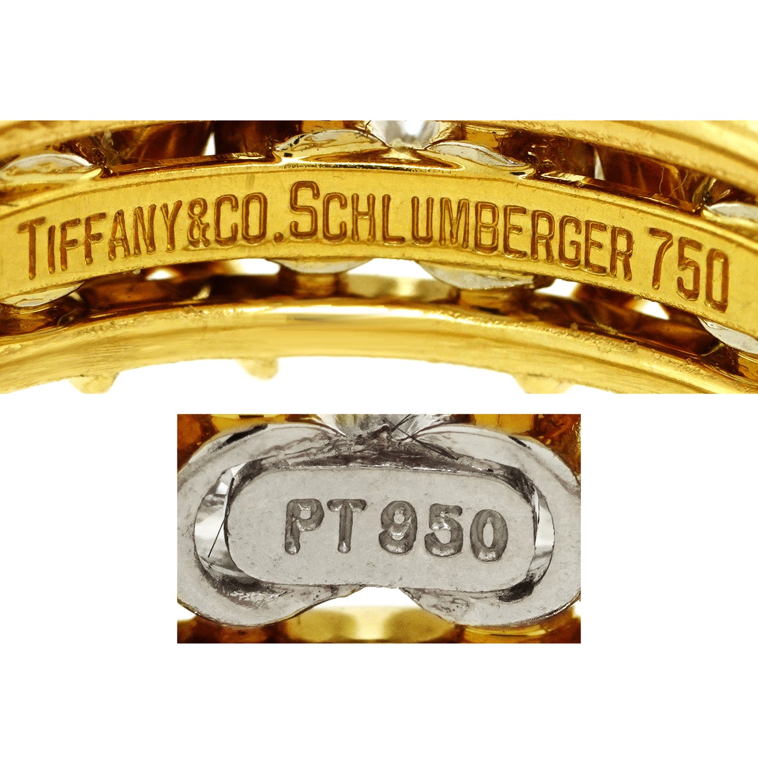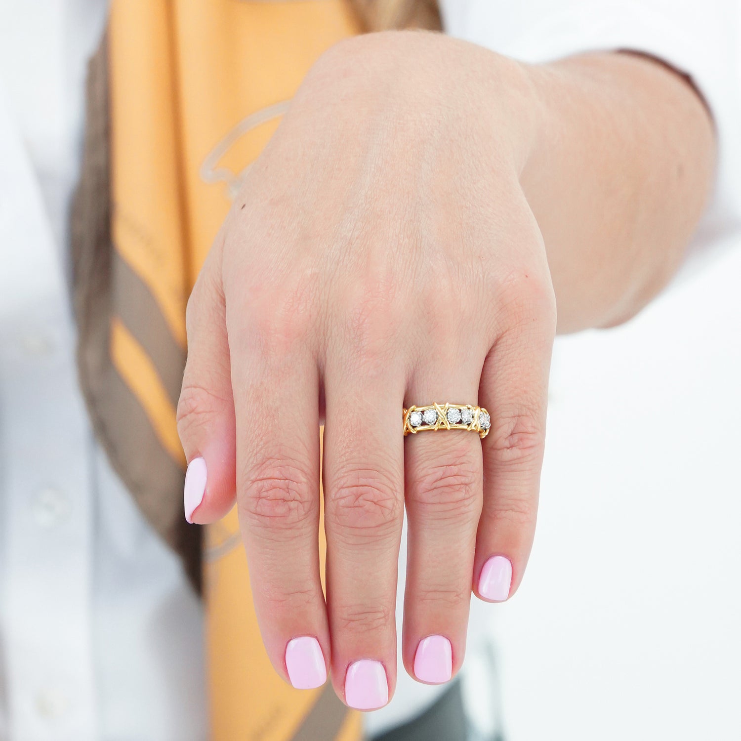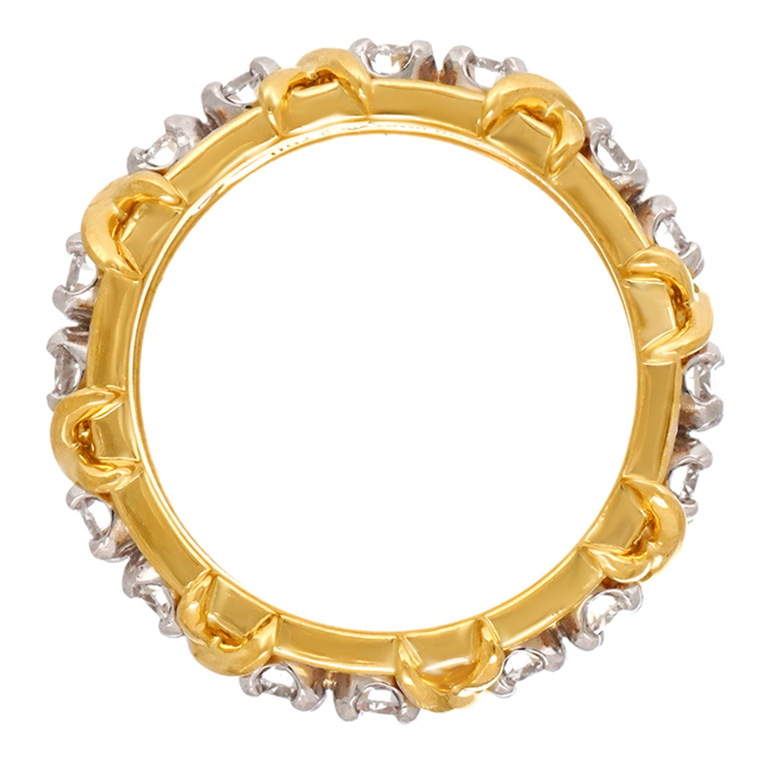 Circa 1980s, 18k, by Jean Schlumberger for Tiffany & Co. Iconic Tiffany style at its Schlumberger best! This 16-stone ring features a traditional ribbon of X's and diamond O's. A rather rare, all yellow gold version, this one is a size 6. Schlumberger's visionary designs honored the Tiffany tradition while creating a dazzling new body of work. This ring is an older version, with a bit more diamond weight (1.50 carats of F color and VS clarity) than the new ones. Beautifully made, it is in excellent condition.