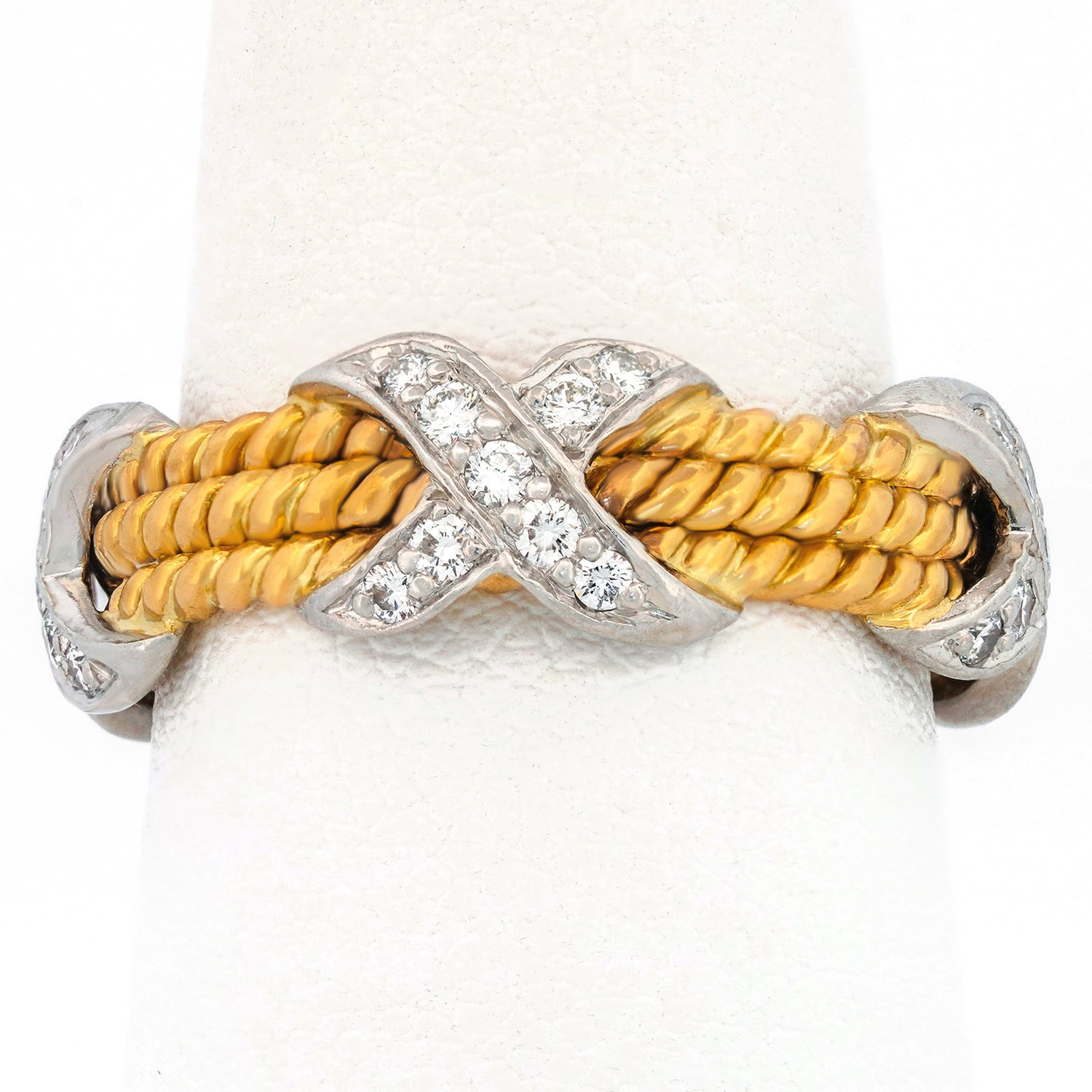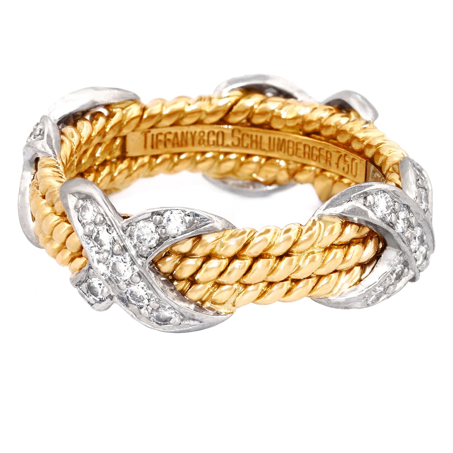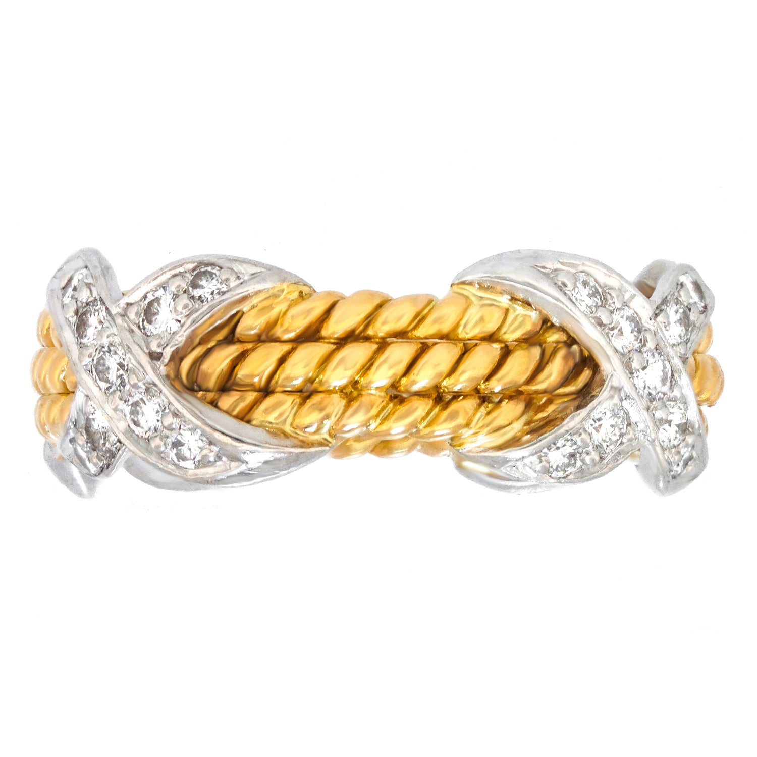 Circa 1980s, 18k and Platinum, by Jean Schlumberger for Tiffany & Co., New York.  Long associated with high luxury and classic fashion, Tiffany's Schlumberger collection is exquisitely tasteful. This  "Rope Three Row with Diamonds" ring in 18k and platinum is delightful on its own or "tres chic" stacked with other bands. Size 4 1/4.  Excellent condition.