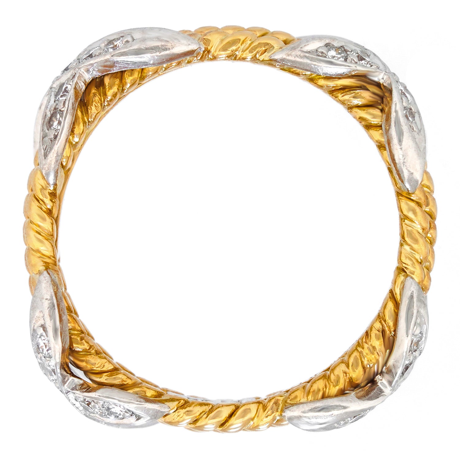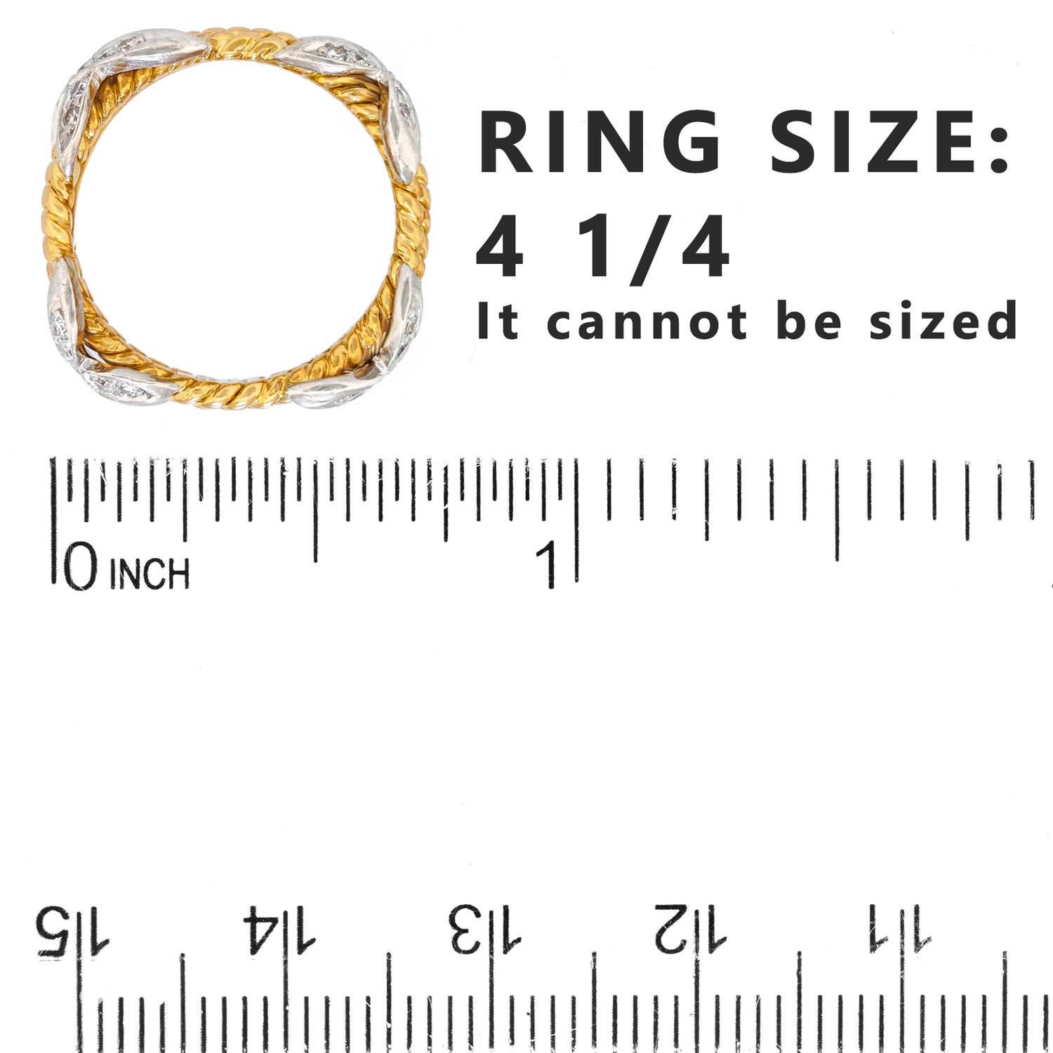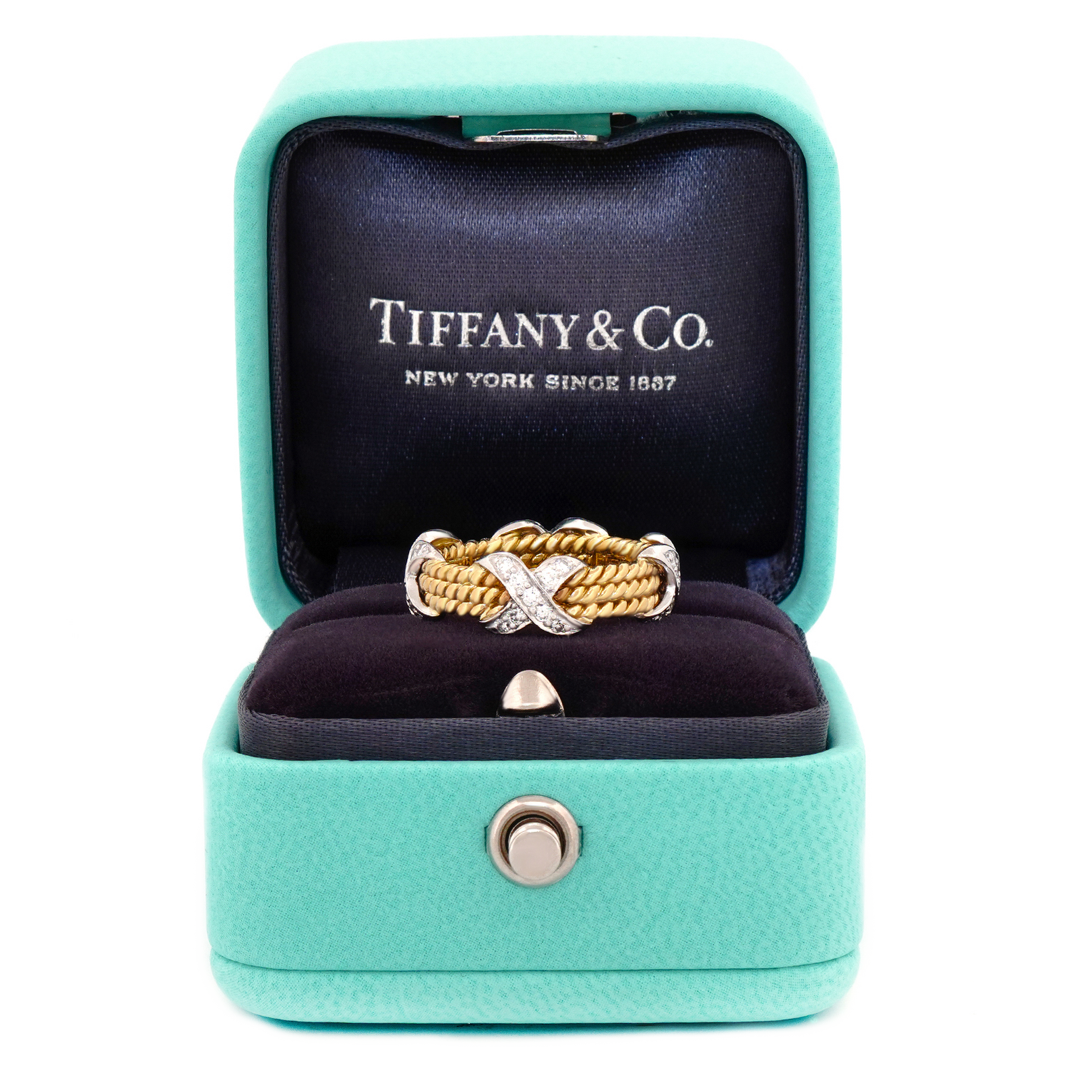 Circa 1980s, 18k and Platinum, by Jean Schlumberger for Tiffany & Co., New York.  Long associated with high luxury and classic fashion, Tiffany's Schlumberger collection is exquisitely tasteful. This  "Rope Three Row with Diamonds" ring in 18k and platinum is delightful on its own or "tres chic" stacked with other bands. Size 4 1/4.  Excellent condition.