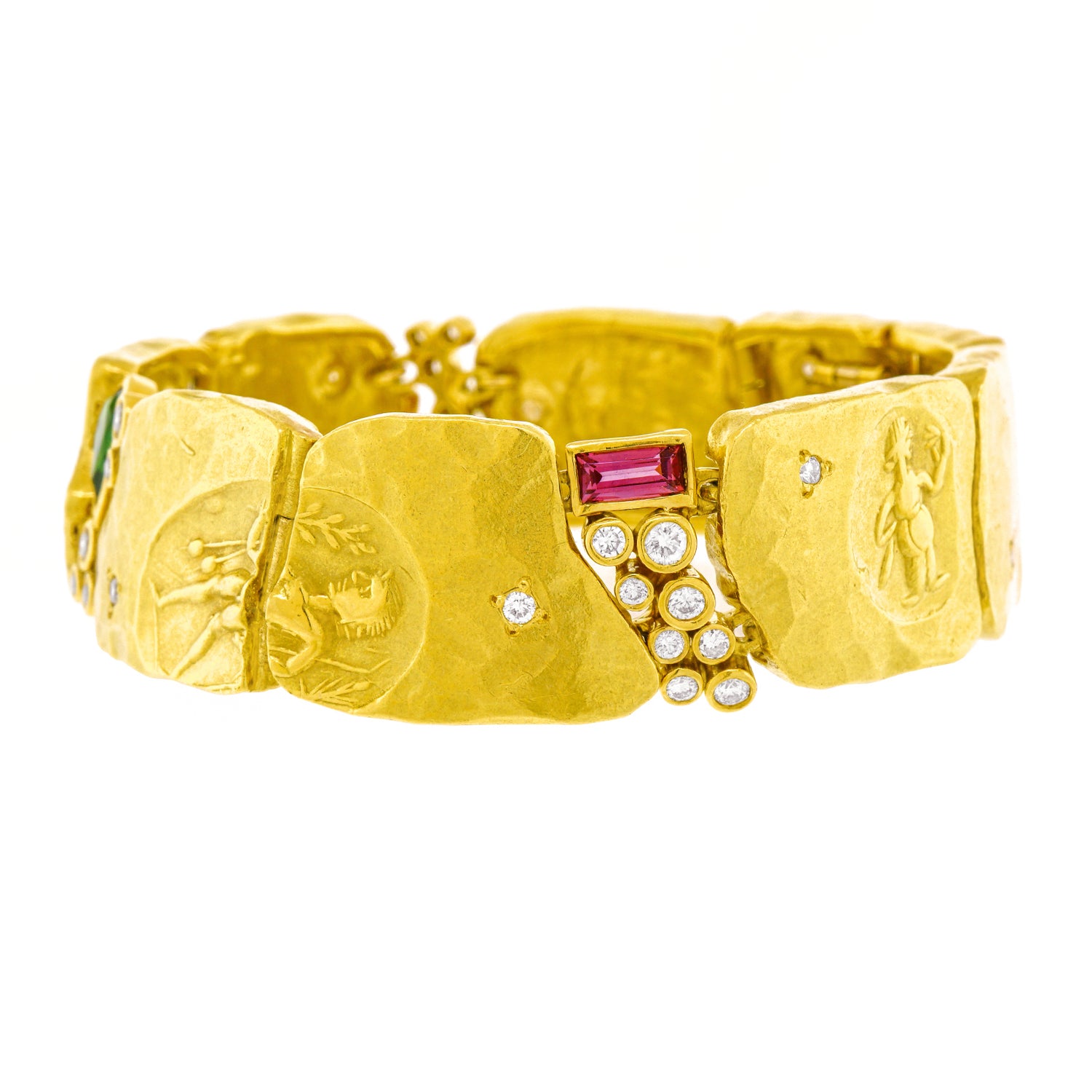 Circa 1980s, 18k, by Seidengang, New York City. This 18k yellow gold bracelet by Carolyn Seiden and Carol Gang features the mythos of the ancient world. Its rough-hewn and die-stamped motif links are set with vibrant tourmalines, citrine, and brilliant white diamonds. Known for their revival of archeological style, quality workmanship, and fashion-forward designs, Seidengang pieces seamlessly mix the old and the new worlds. Finely fashioned and one-of-a-kind, this is a perfect everyday bracelet. Excellent condition.