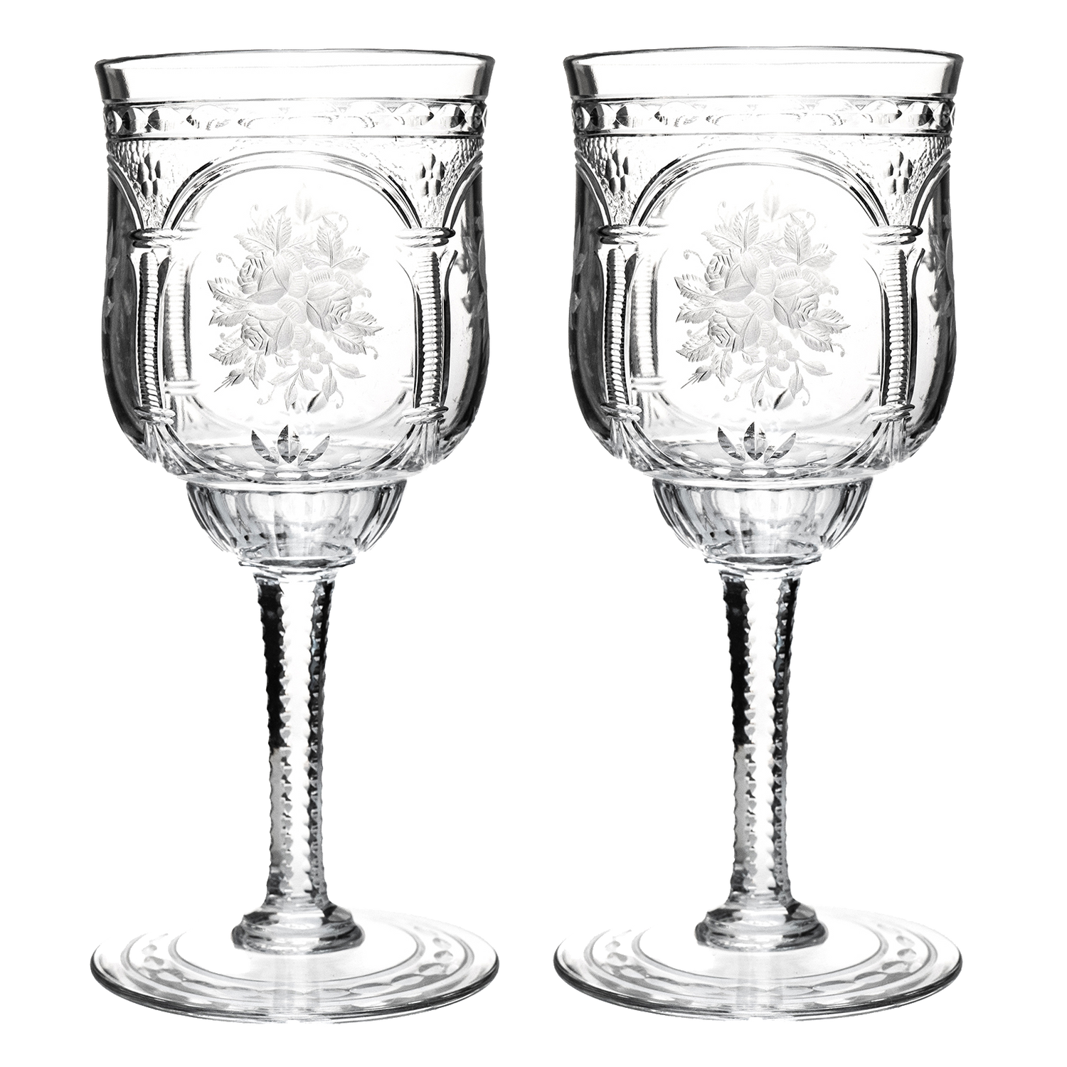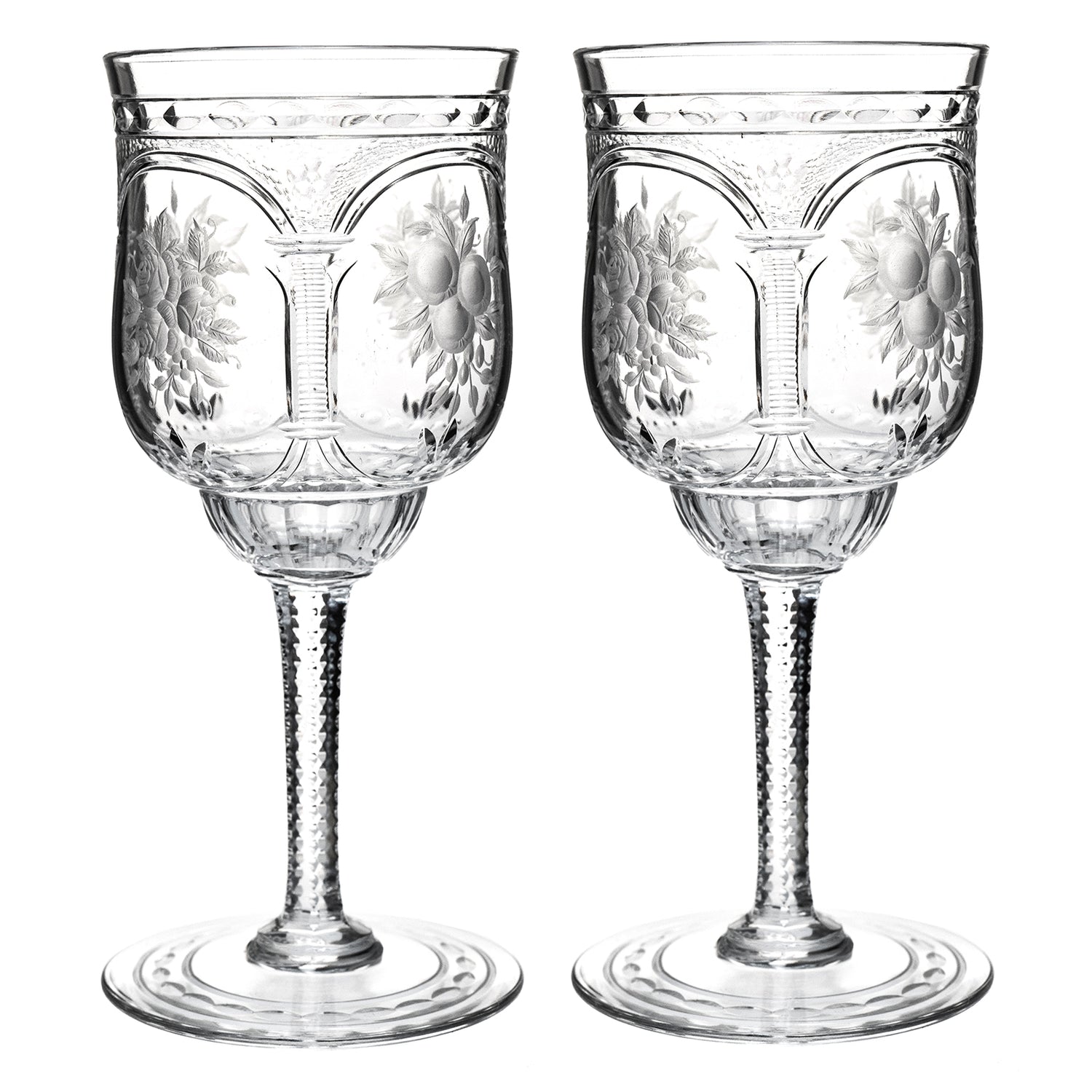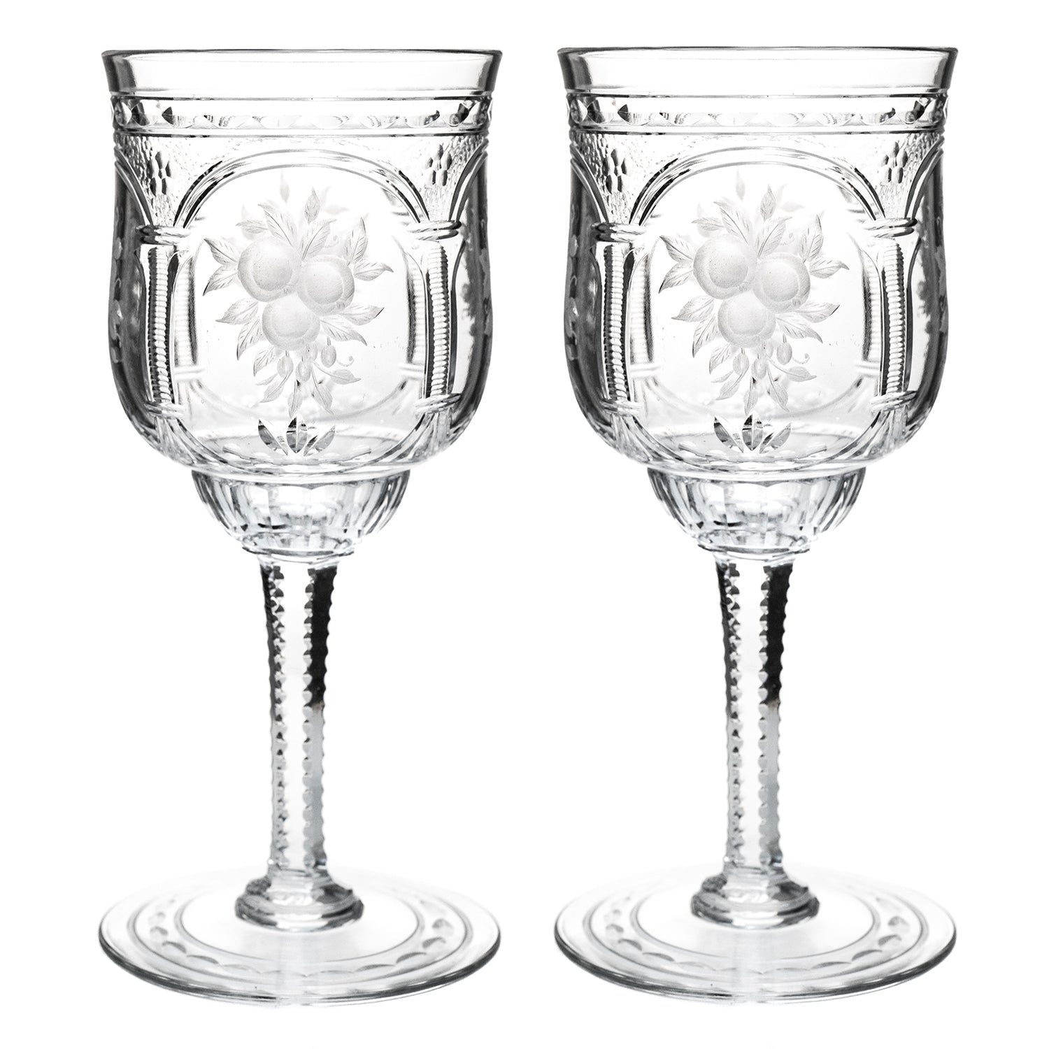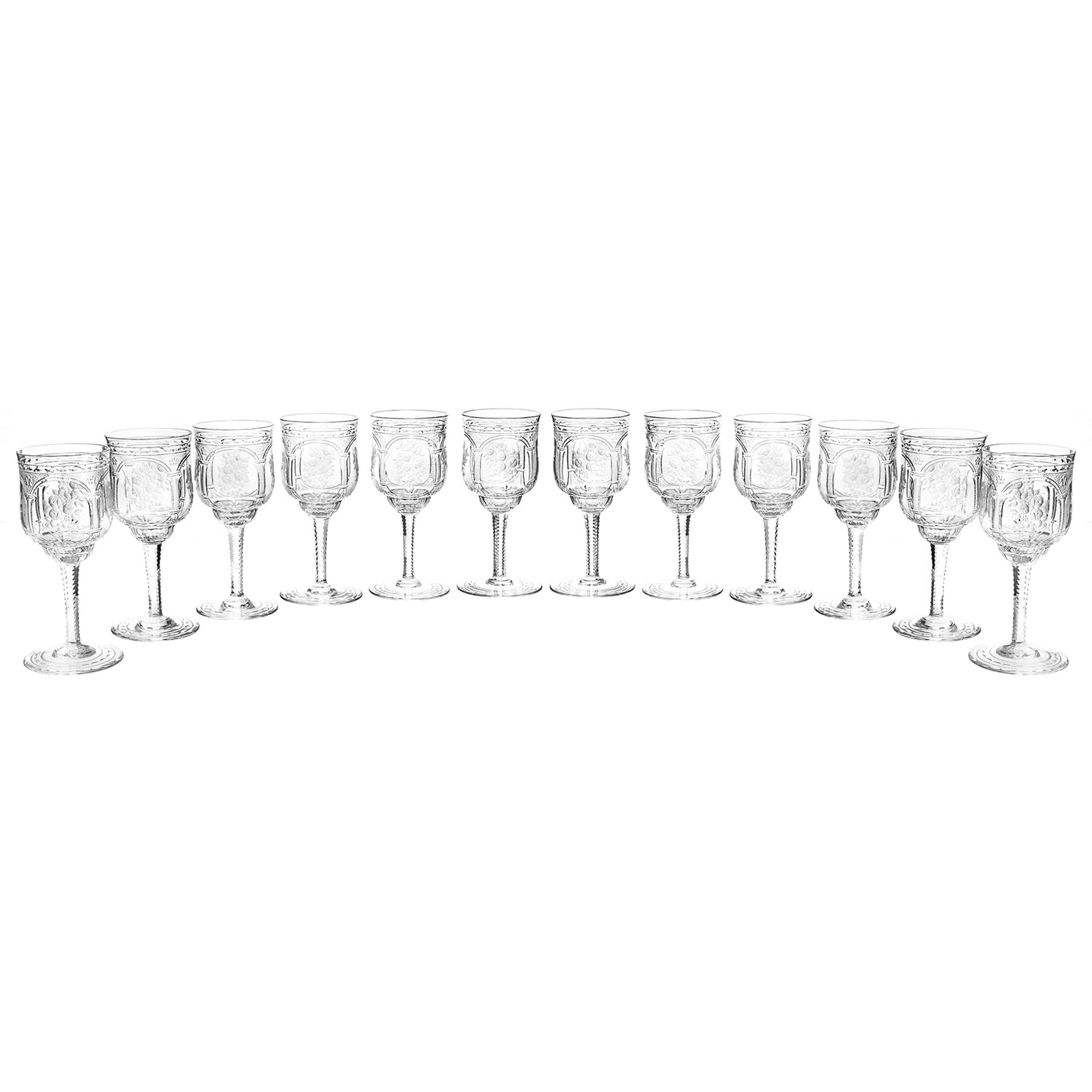 Circa 1890-1900, by Baccarat, France. This set of 12 magnificent late-nineteenth-century crystal wine goblets by Baccarat is perfect for any décor or table. Demonstrative of the sublime design work and superb craftsmanship of France's finest glass house, they are exquisitely detailed with neoclassical columns and graceful arches that frame delicate vignettes of fruited bounty. Excellent condition.