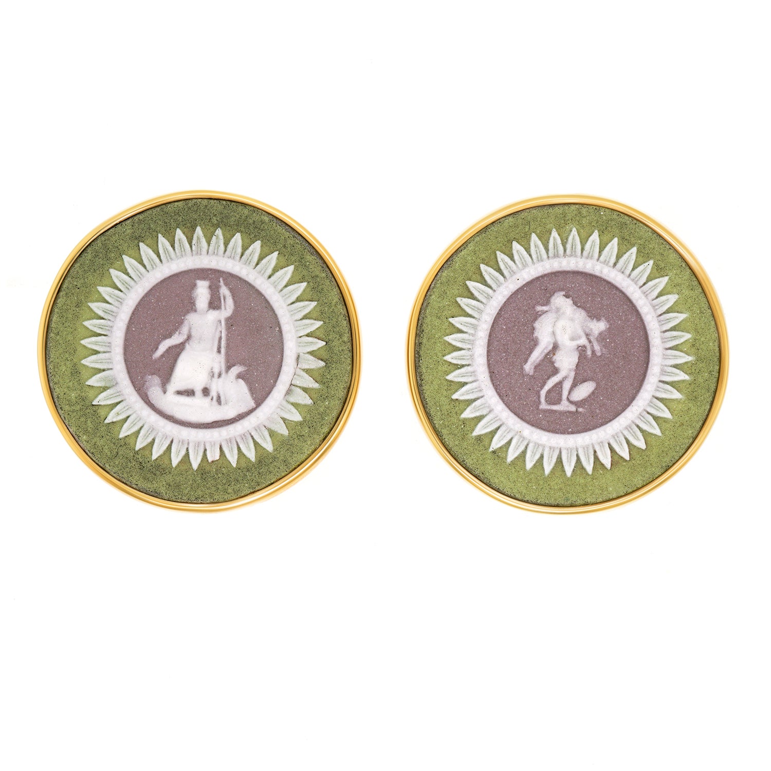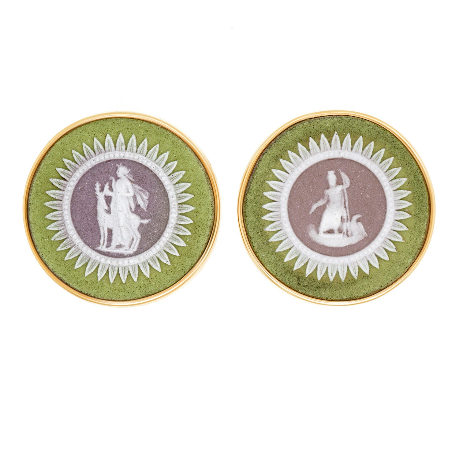 Circa 1860s, 14k, by Wedgewood, England.  These exceptionally-hued 19th-century Parian buttons by Wedgwood are beautifully mounted in heavy 14k gold (most likely in the 1950s). Very good condition.  A tiny loss on one petal was noted, hard to see.