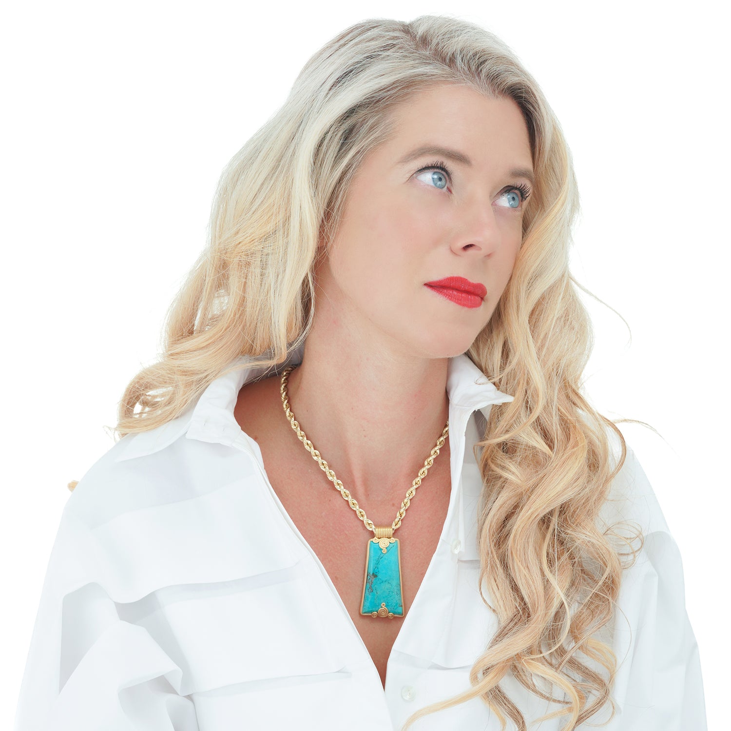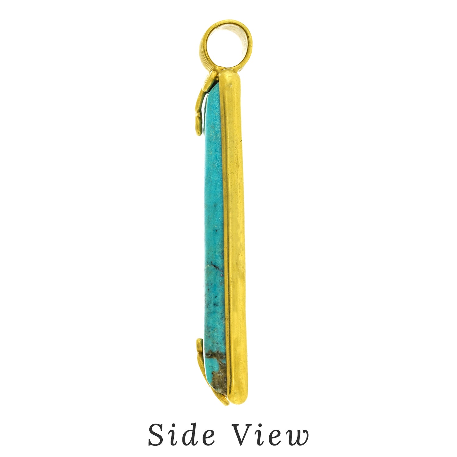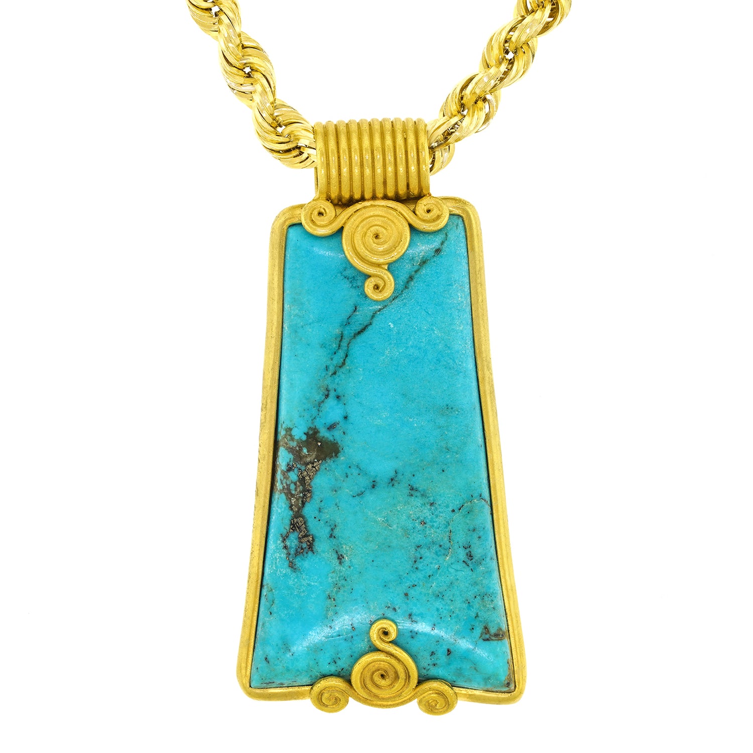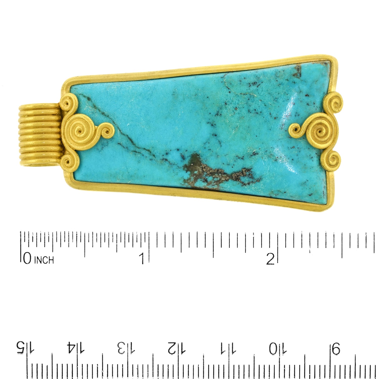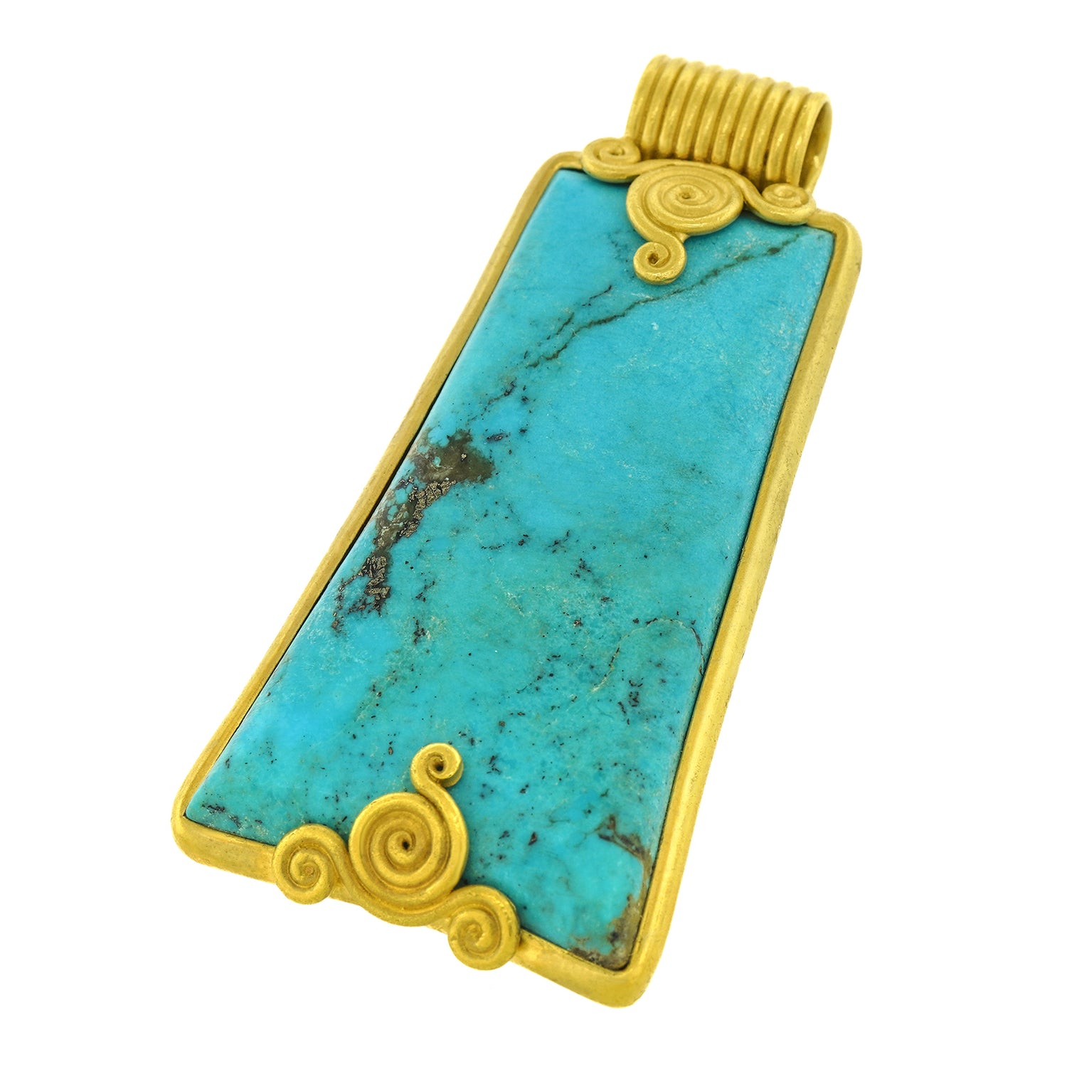 Circa 1970s, 18k, Swiss. This boldly stylish turquoise pendant is set in eighteen-karat yellow gold. Hand-made, the archaic look with its mythic petroglyph spirals nods to the ancients. Beautifully hand-made in a Swiss atelier, it is in excellent condition.
