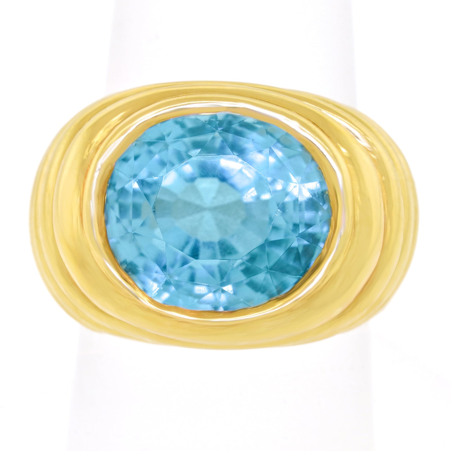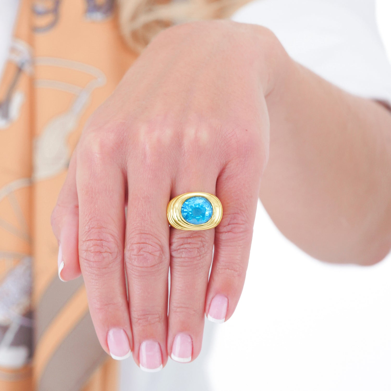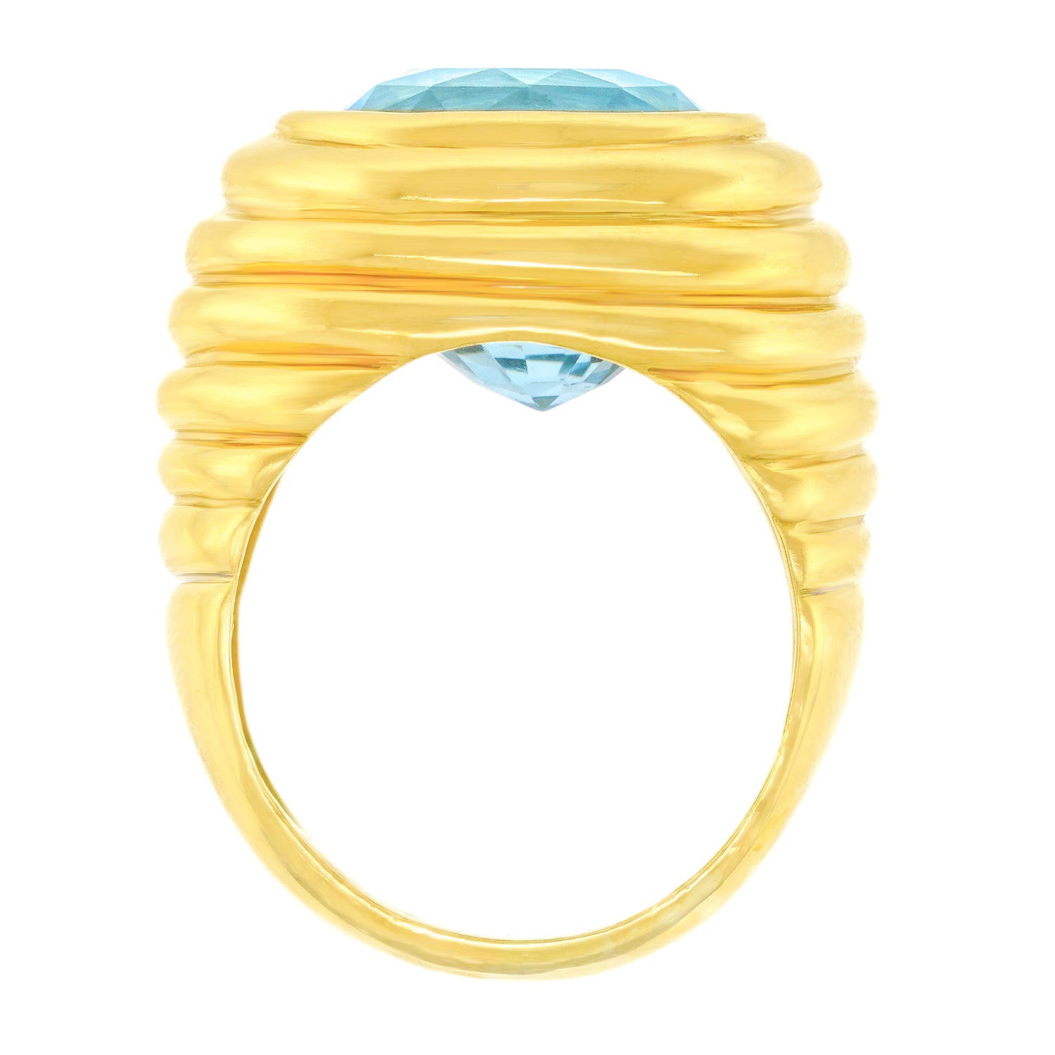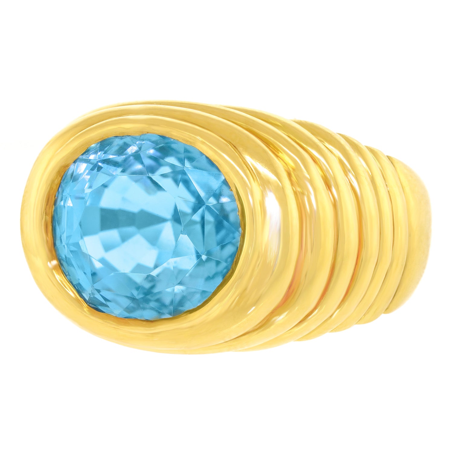 Circa 1970s, 18k.   Set with a lively, deep blue 10.0-carat aquamarine, this ring is colorfully stylish,  perfect for any moment of fashion. Seventies bold is iconic joie-de-vivre, powerfully present and visually ready to take a chance. This well-made ring does it all.  Excellent condition.