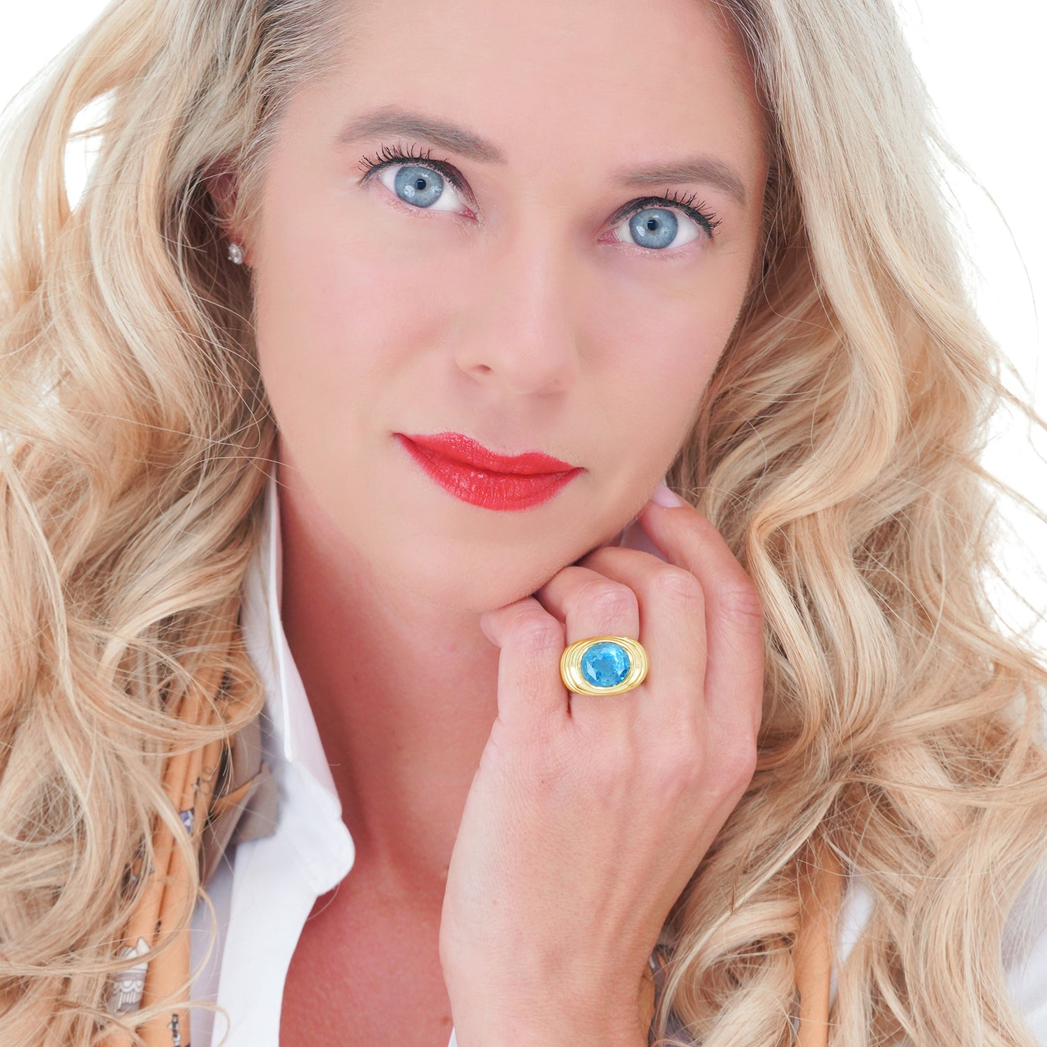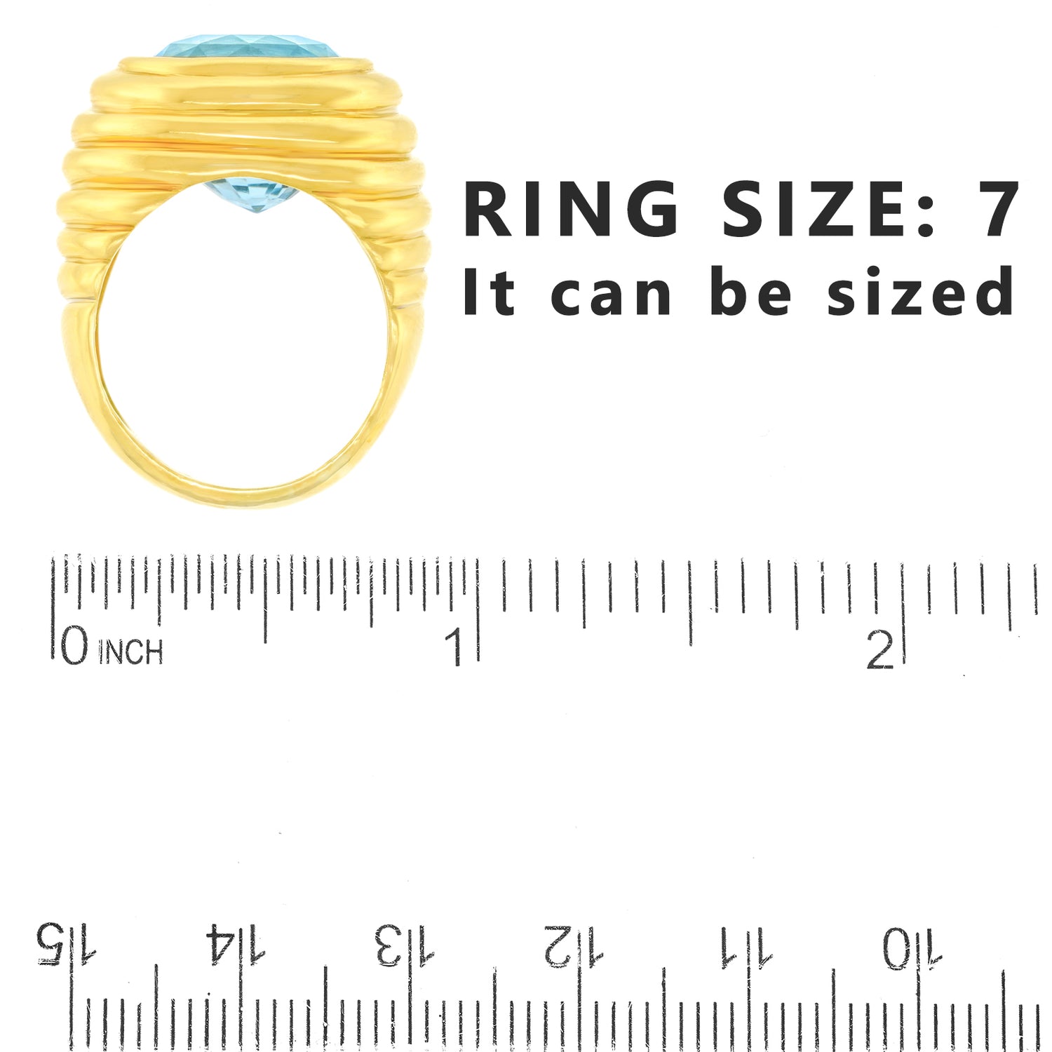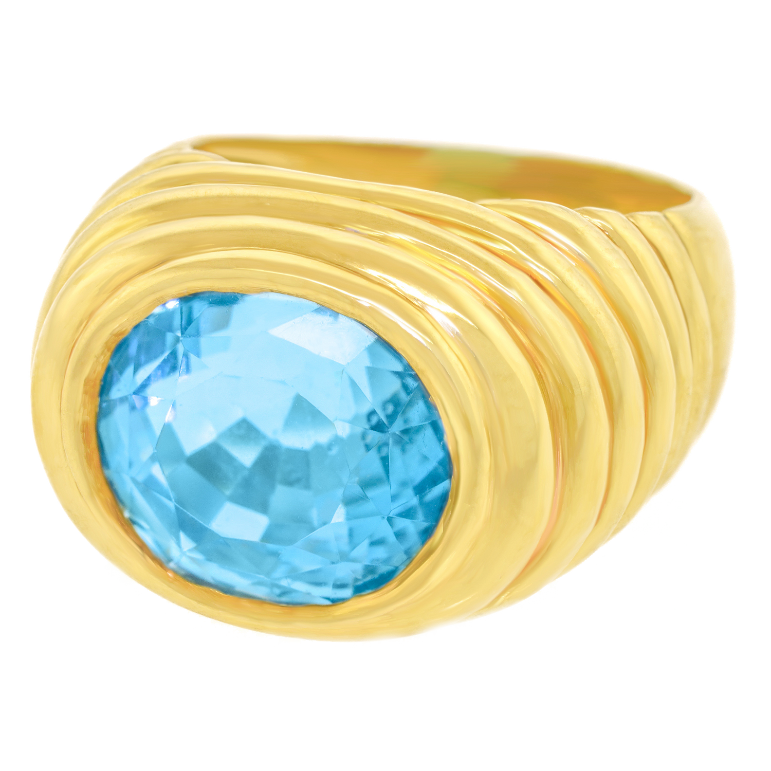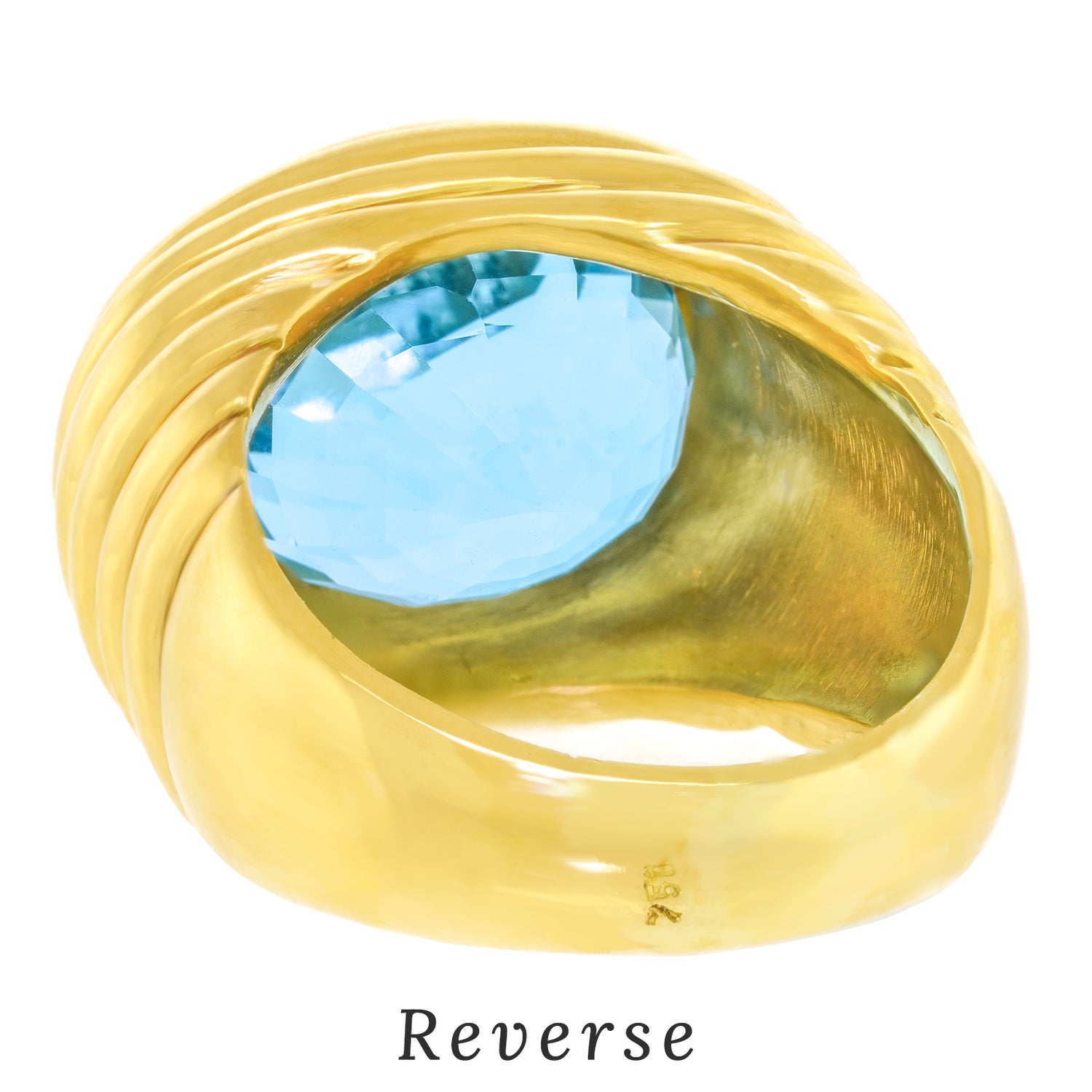 Circa 1970s, 18k.   Set with a lively, deep blue 10.0-carat aquamarine, this ring is colorfully stylish,  perfect for any moment of fashion. Seventies bold is iconic joie-de-vivre, powerfully present and visually ready to take a chance. This well-made ring does it all.  Excellent condition.
