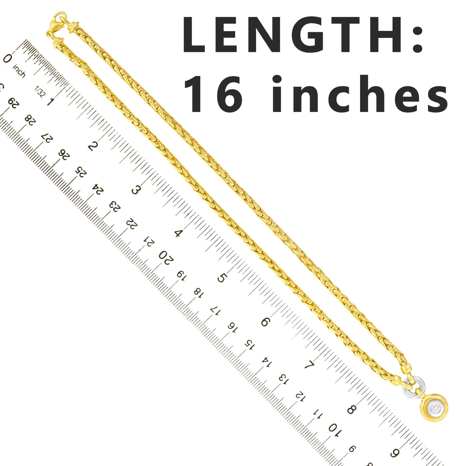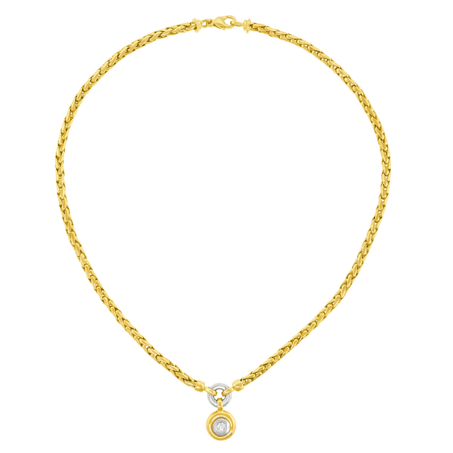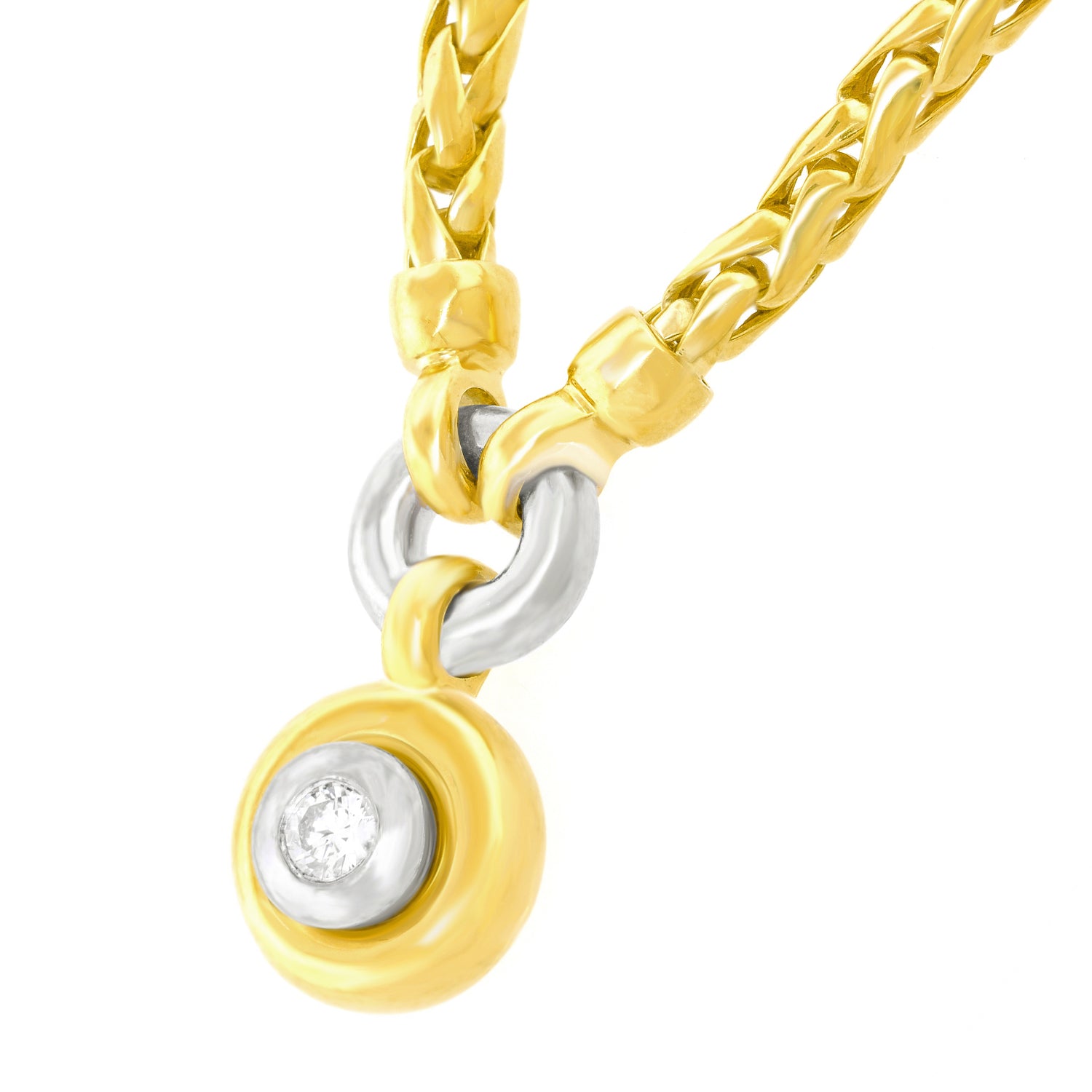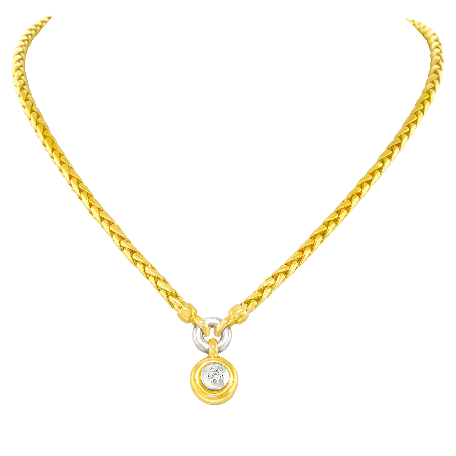 Circa 1970s, 18k and Platinum. This sleekly seventies necklace is all about chic style underscored by a sparkly white 0.17-carat diamond (G color, VS clarity) set in yellow gold with platinum accents. The weight of the necklace is perfectly balanced, it will not flip or roll. This is an anywhere, anytime, dress it up, dress it down necklace. Make it your signature piece! Excellent condition.