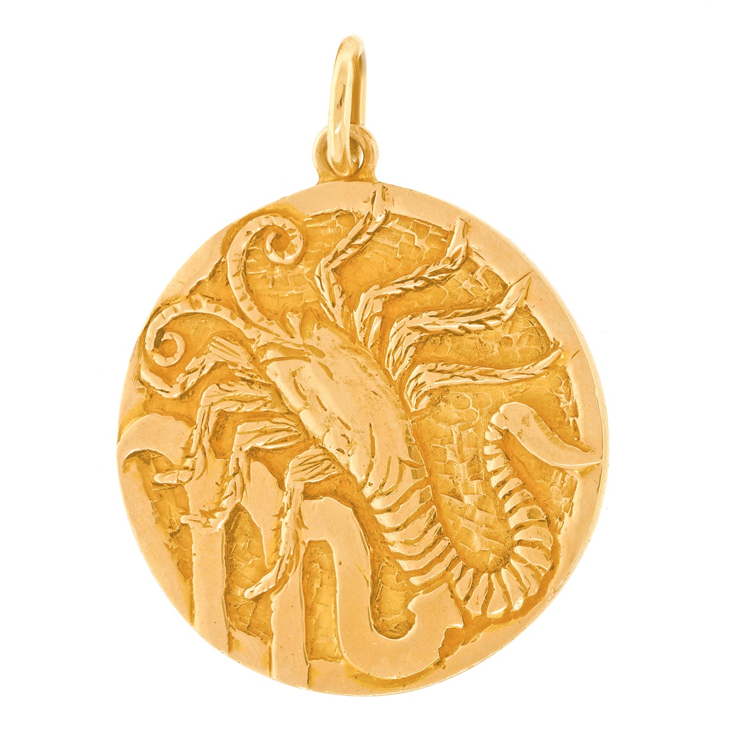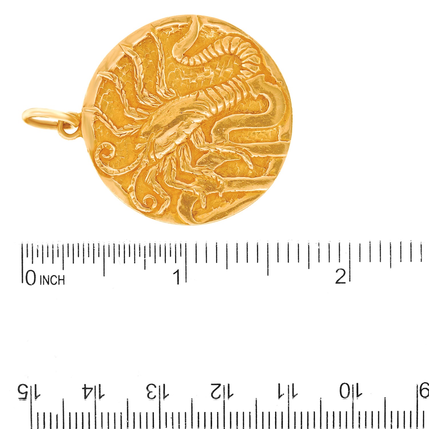 Circa 1970s, 14k, American. This fabulous seventies pendant features the Scorpio zodiac symbol and namesake scorpion in heavy fourteen-karat gold. Beautifully executed, this well-made talisman will accompany you wherever your journey leads. Excellent condition.