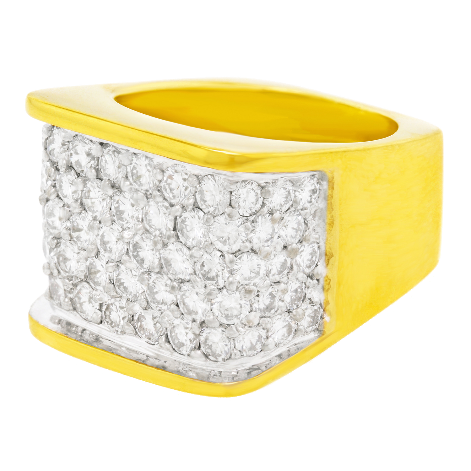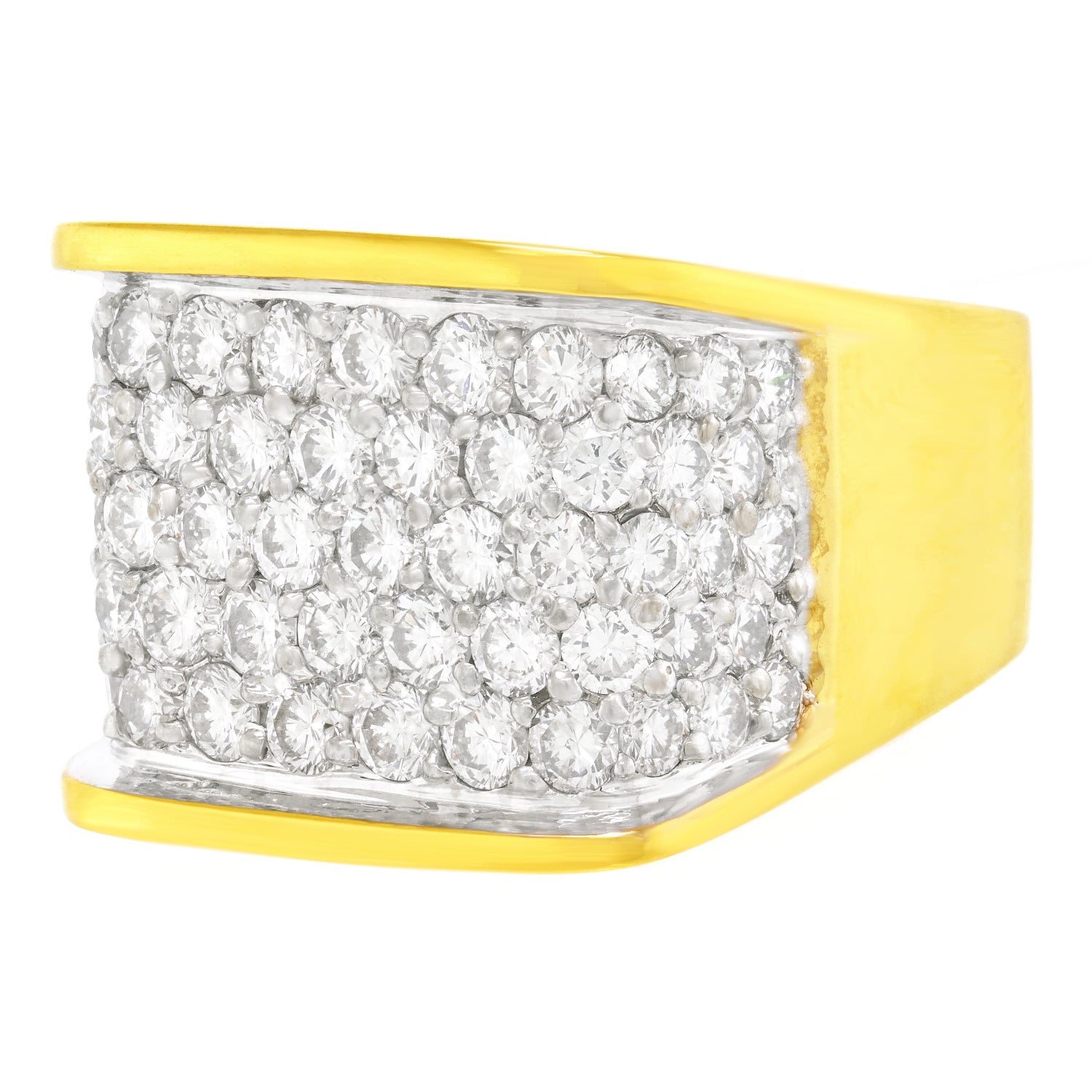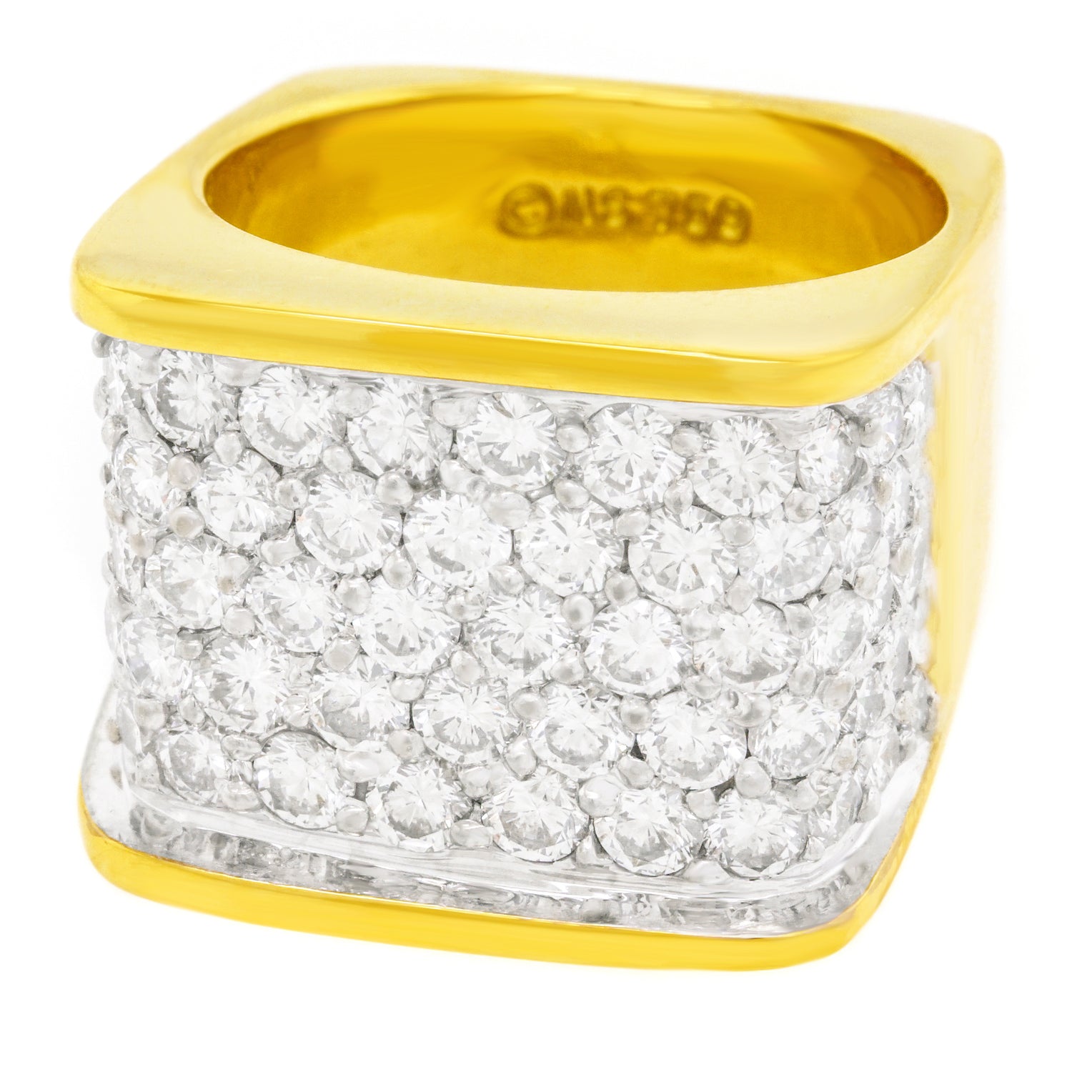 Circa 1970s, 18k, American.  This bold seventies ring is all sparkle, style, and verve! Its chic design is underscored by four carats of brilliant white diamonds (G color, VS clarity). Effortlessly transitioning from day to night, the look is glamorously American.  Excellent condition.