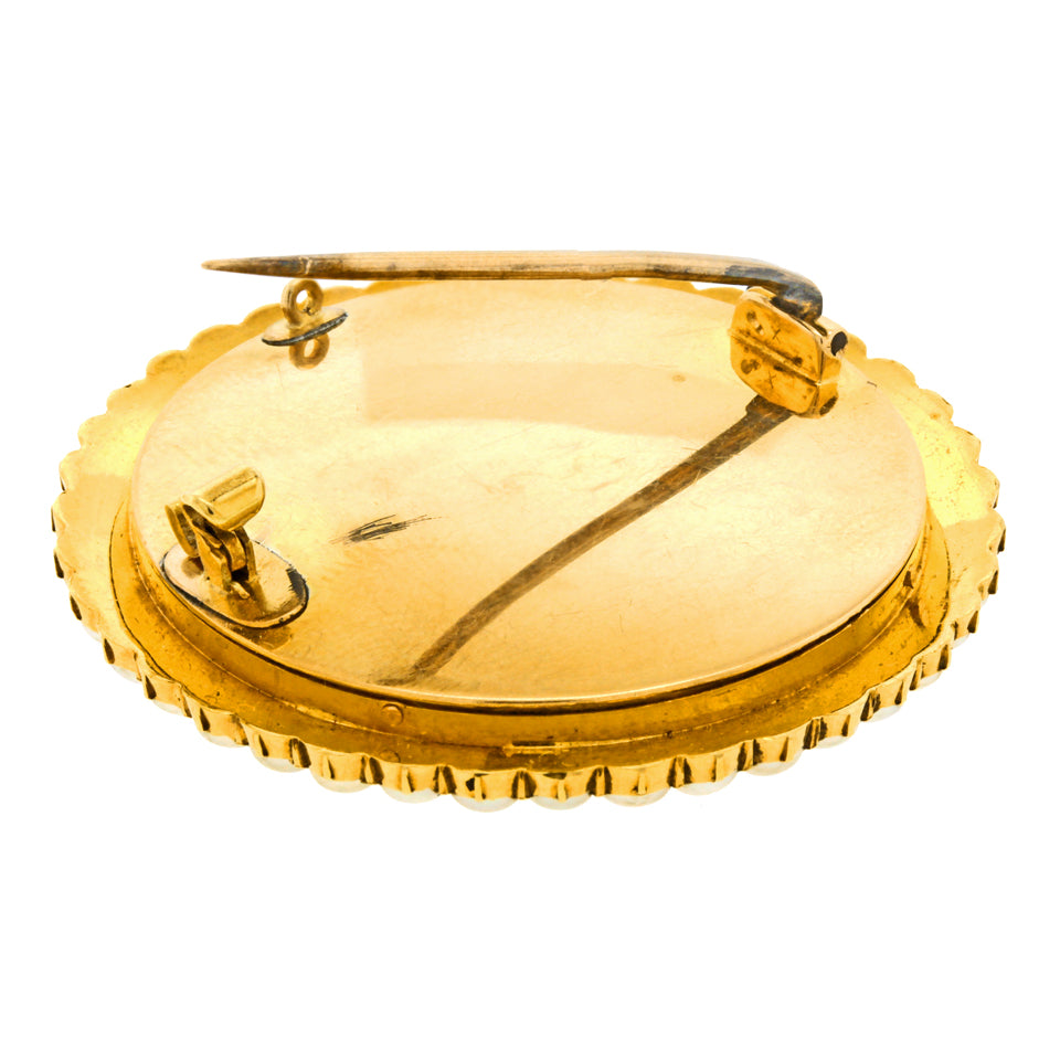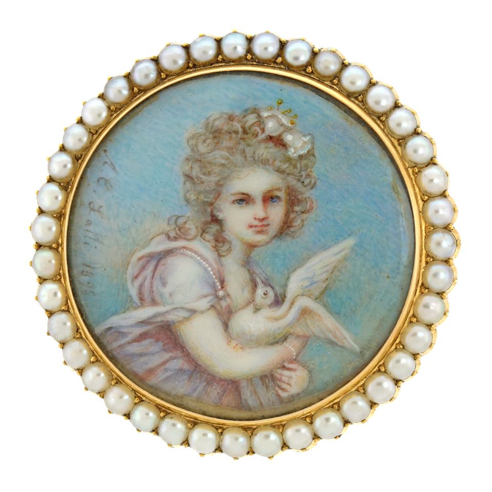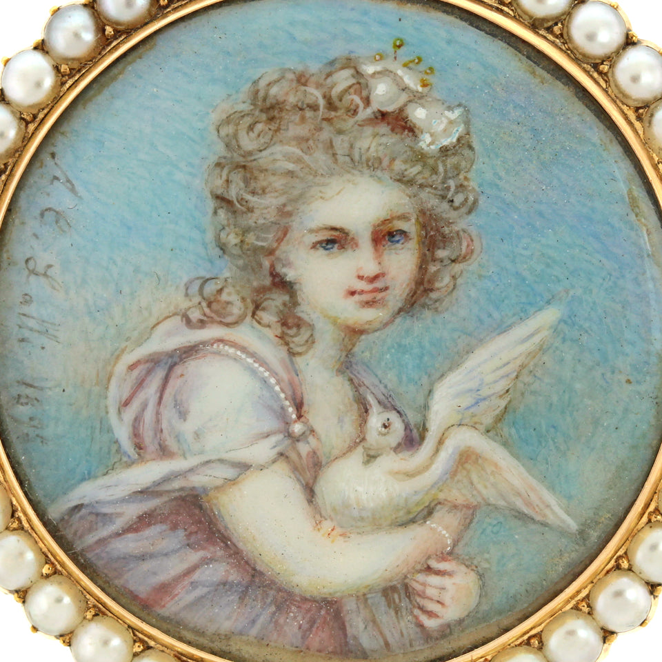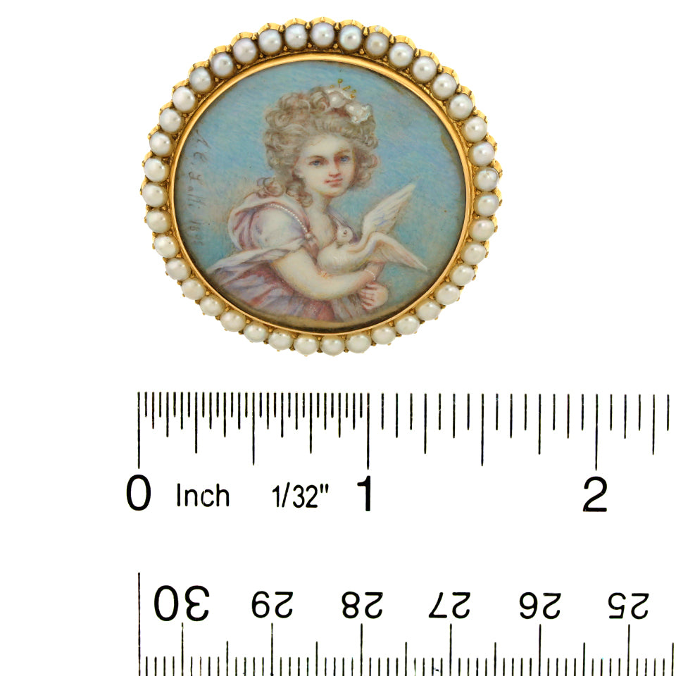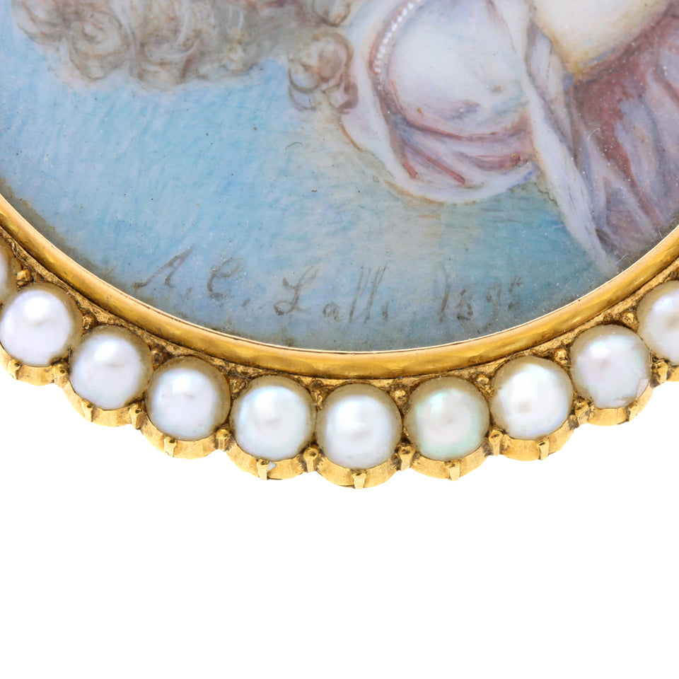 Circa 1890s, 18k, signed "A.C. Lalli  1895" on portrait, Italy.  Lalli was known for splendidly painted miniatures. The expressive face of the girl and the inclusion of fine details like jewelry, tassels, and flowers in her hair are typical of his work.  The pearls surrounding the image make this piece a lovely brooch. Each example of his work is one of a kind.  Very good condition.  NOTE:  pin stem and catch have been replaced.