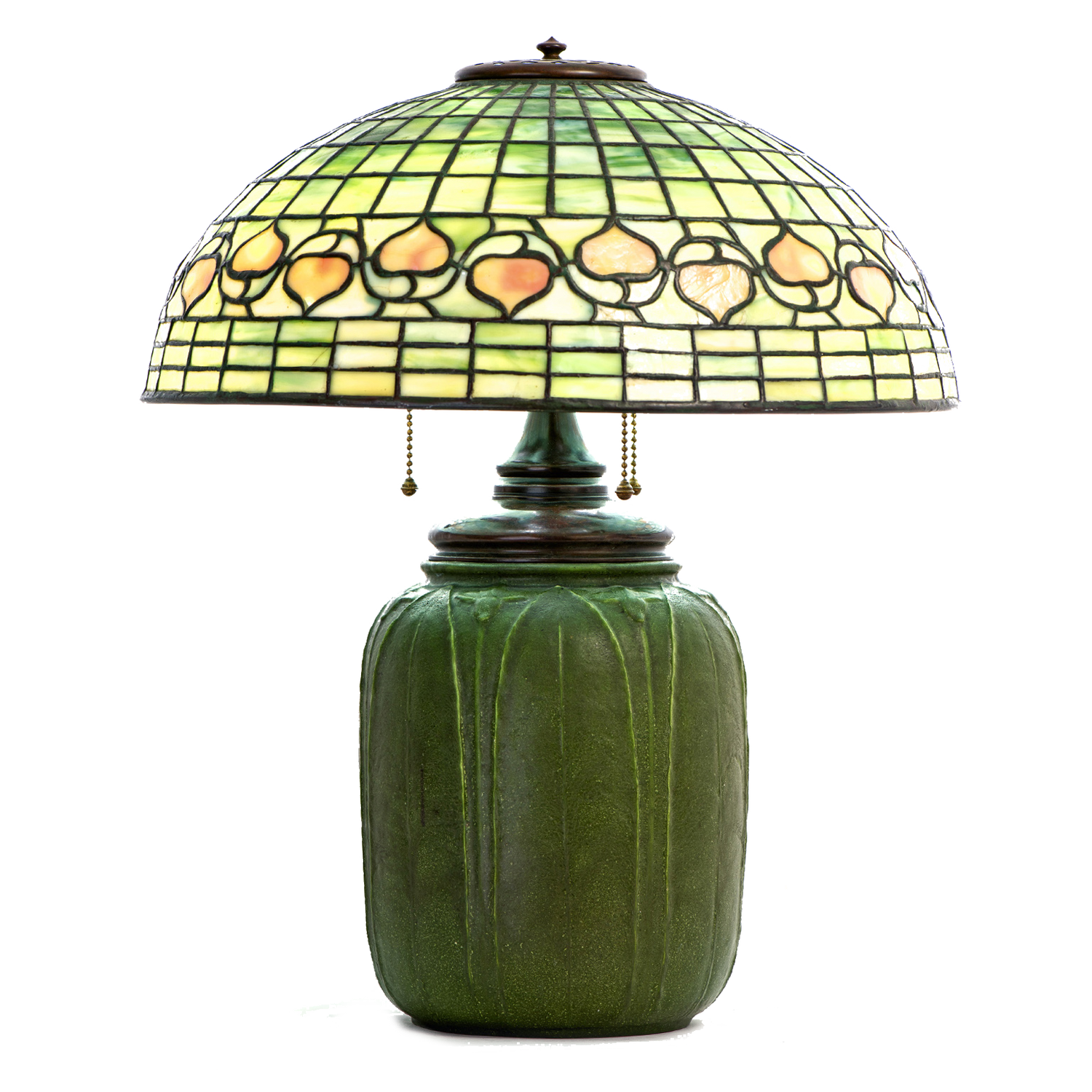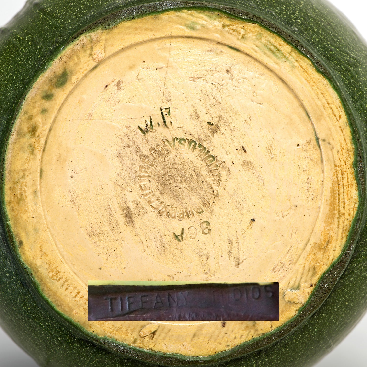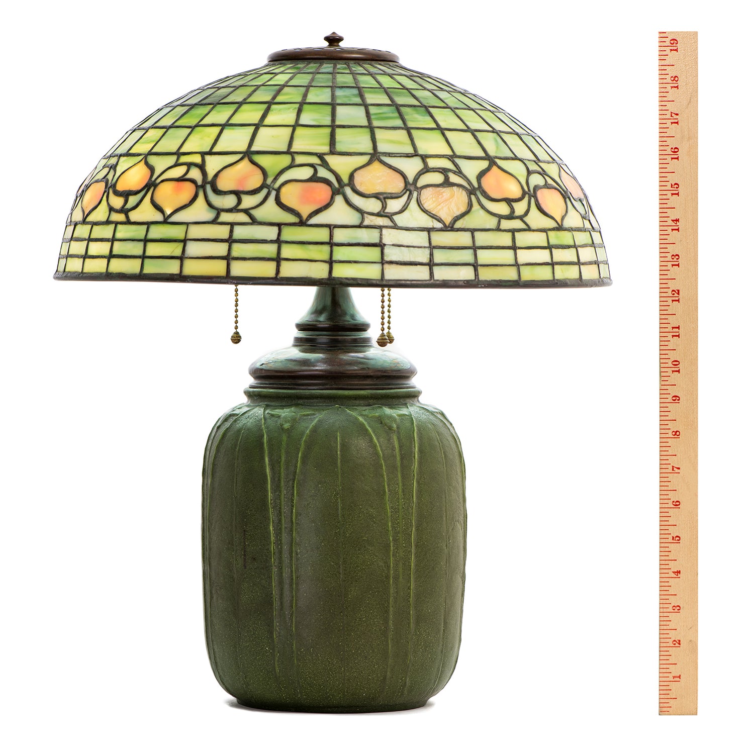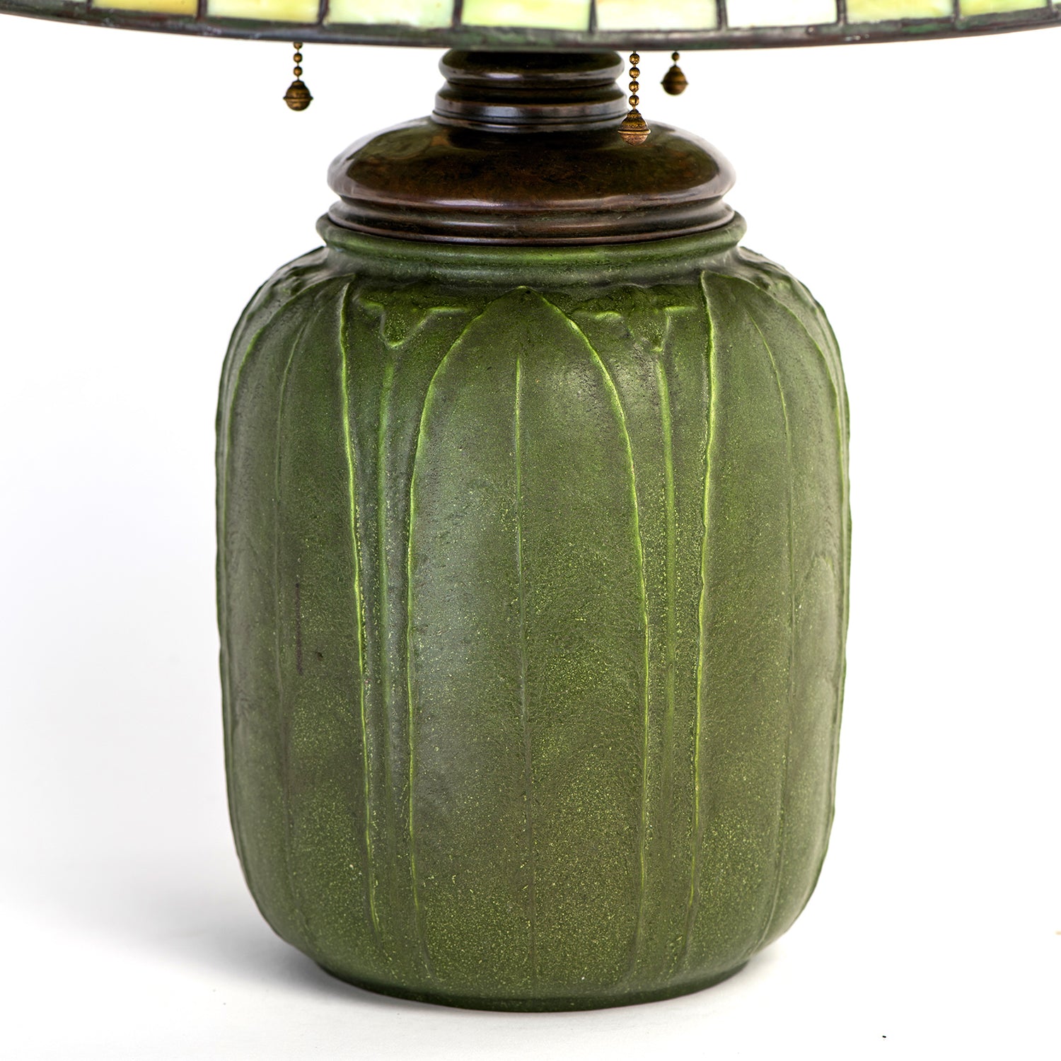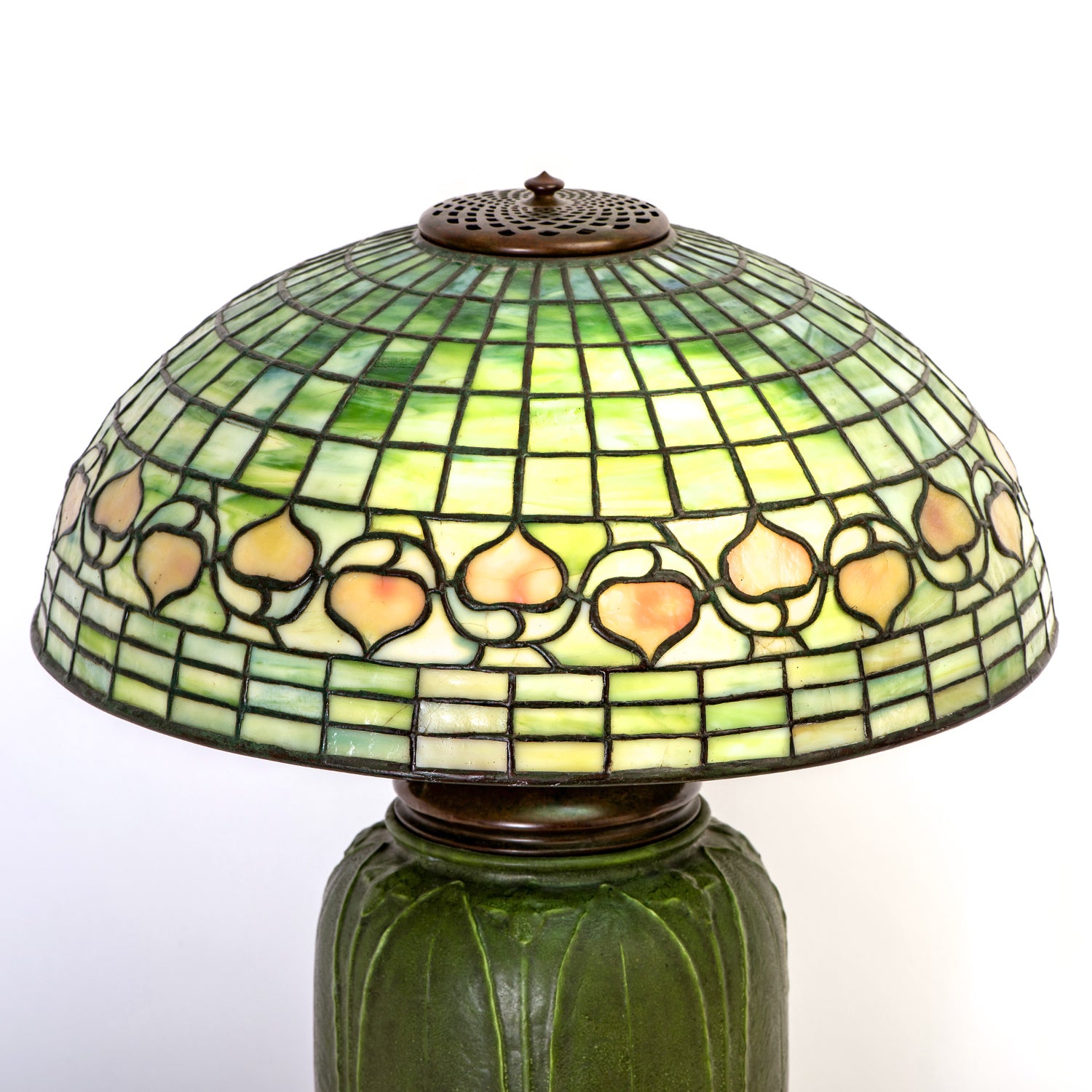 Shade is signed Tiffany Studios. The mechanical portion of the lamp is signed Tiffany Studios New York. The original Grueby vase base is labeled Grueby Faience Co. #36A, and artist-signed WP for Wilhelmina Post.