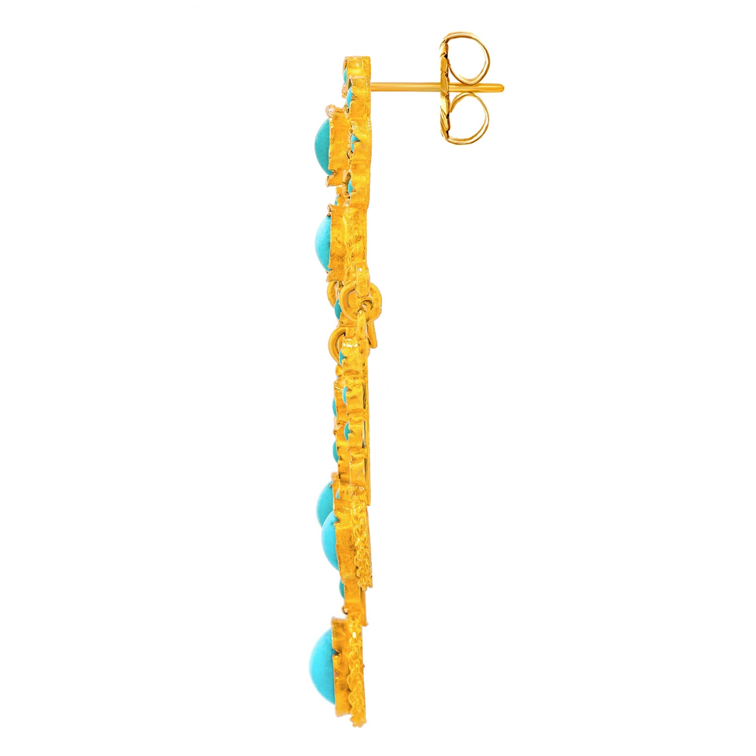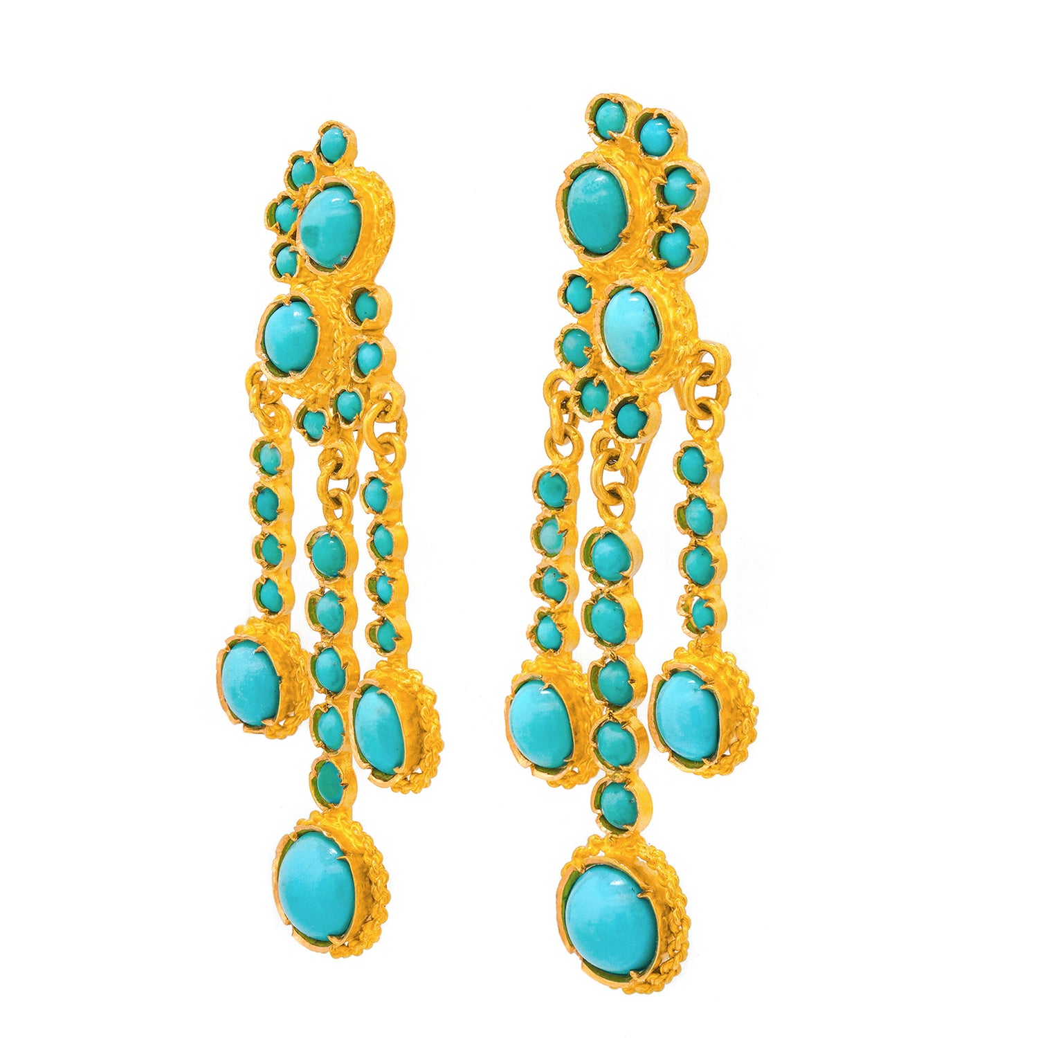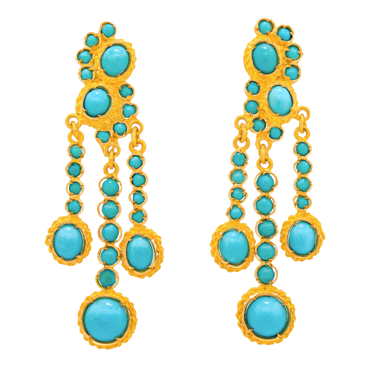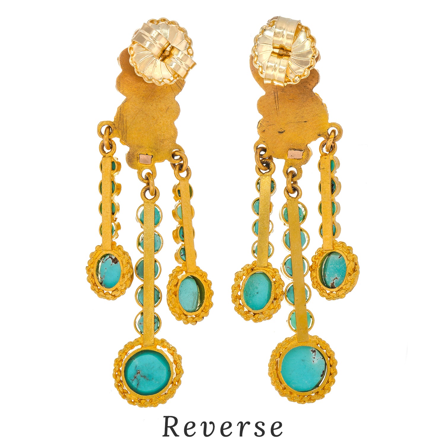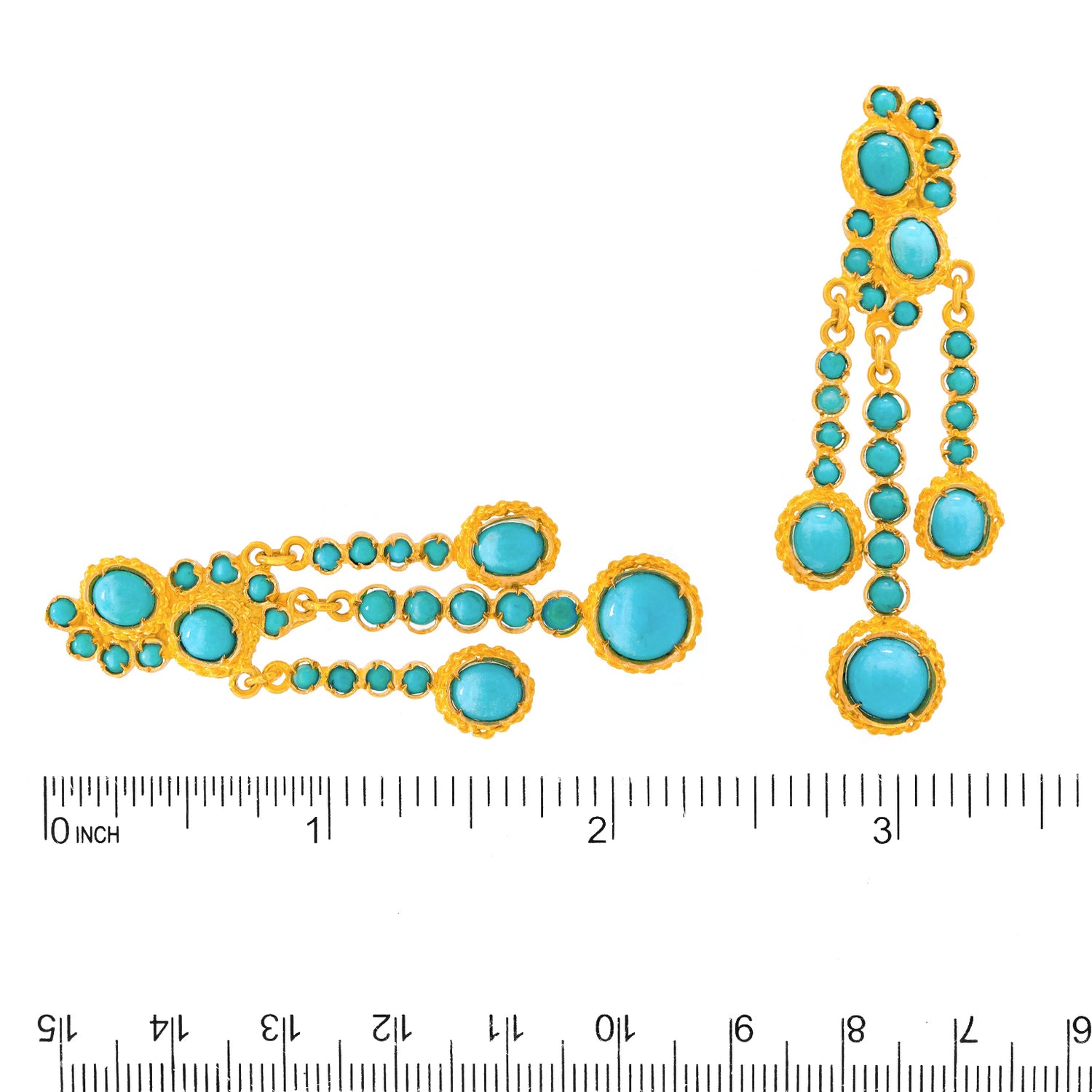 Circa 1960s, 18k, Eastern Europe. Fabulously sixties, these dangle earrings feature gorgeous Persian turquoise and playful movement. The look breezily goes from the boardwalk to the cover of Vogue. These 18k yellow gold earrings are finely made and in excellent condition.