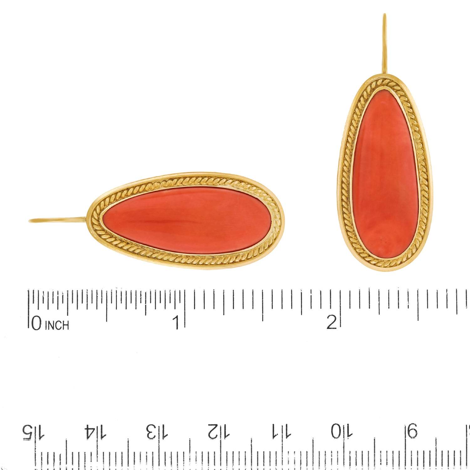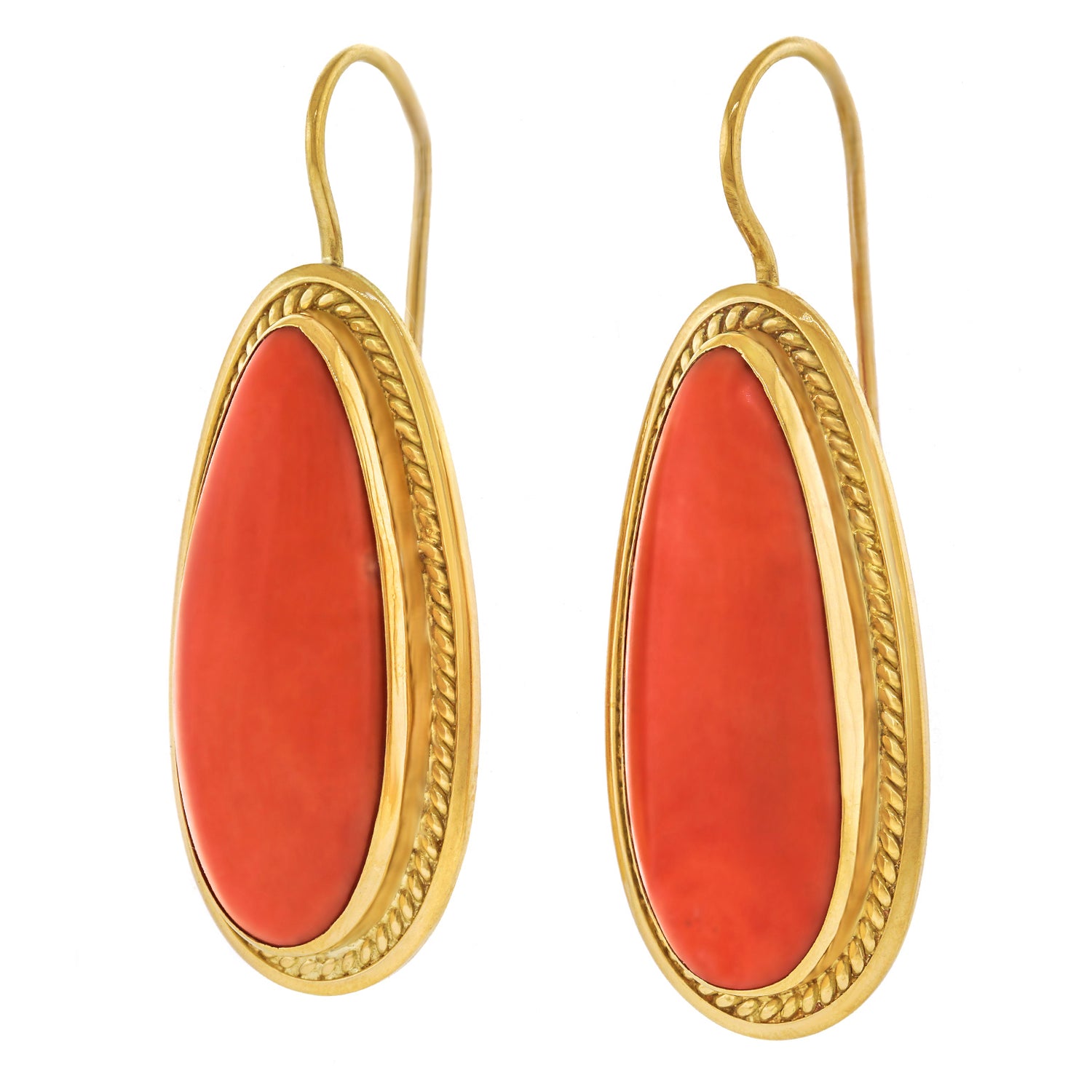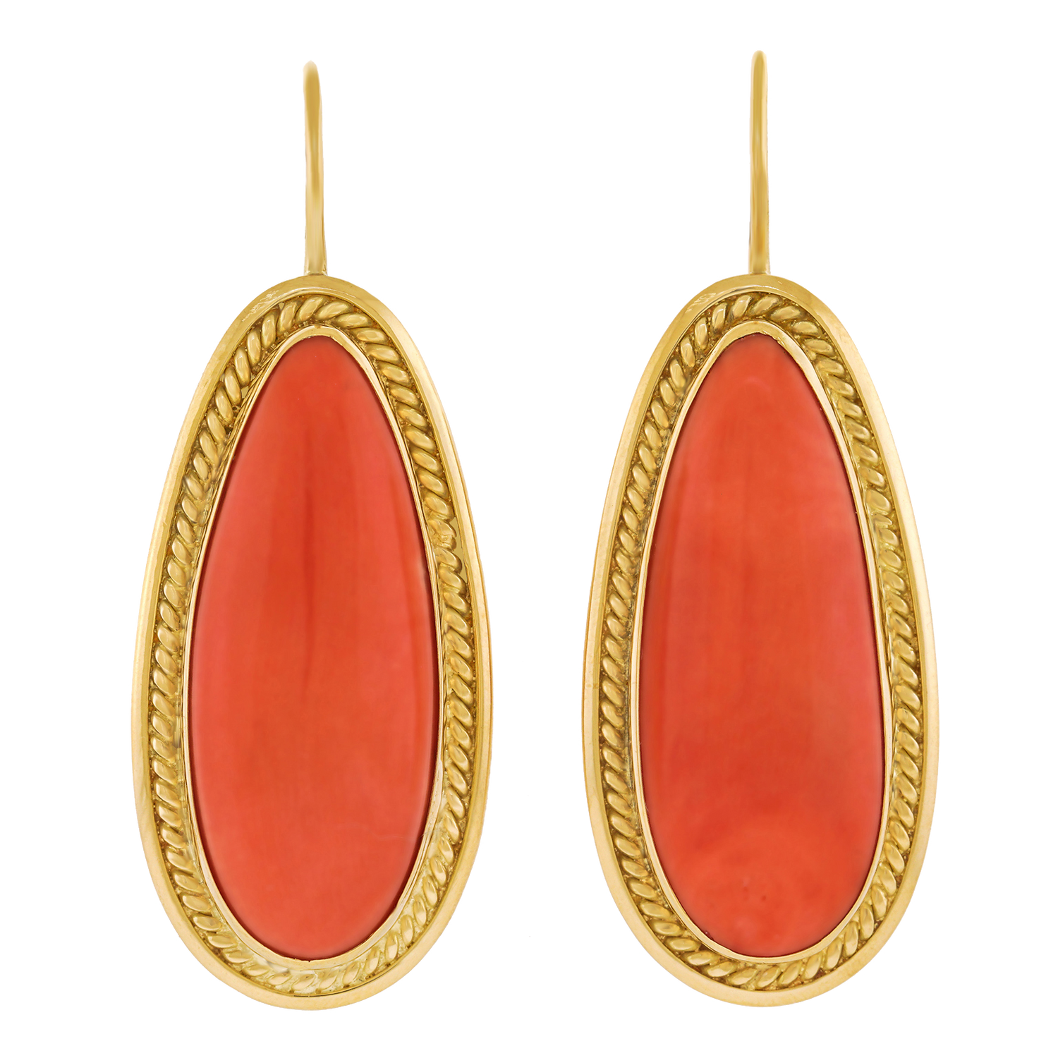 Circa 1960s, 18k, attributed Italy. Set in 18k gold cable-twist frames, these gorgeous coral earrings are classic sixties style. Simplicity, color, and movement are the essence of their look. Finely fabricated, they are in excellent condition.