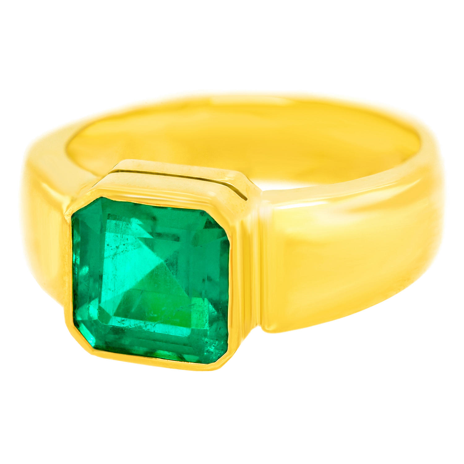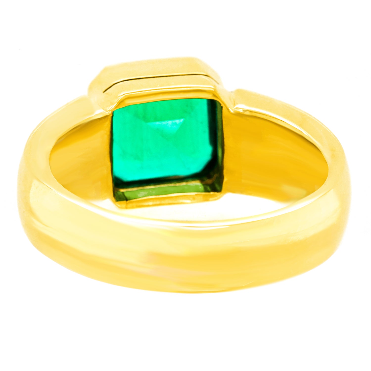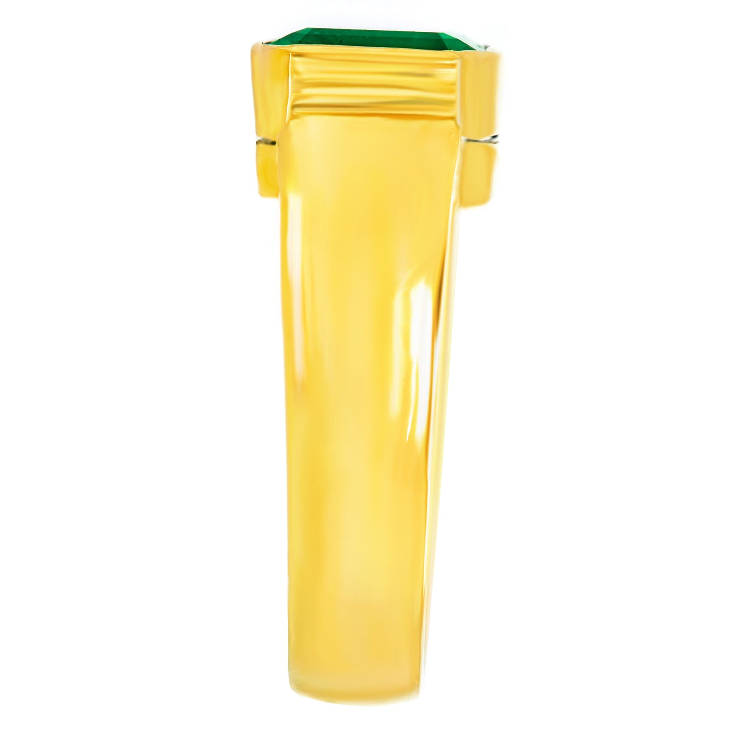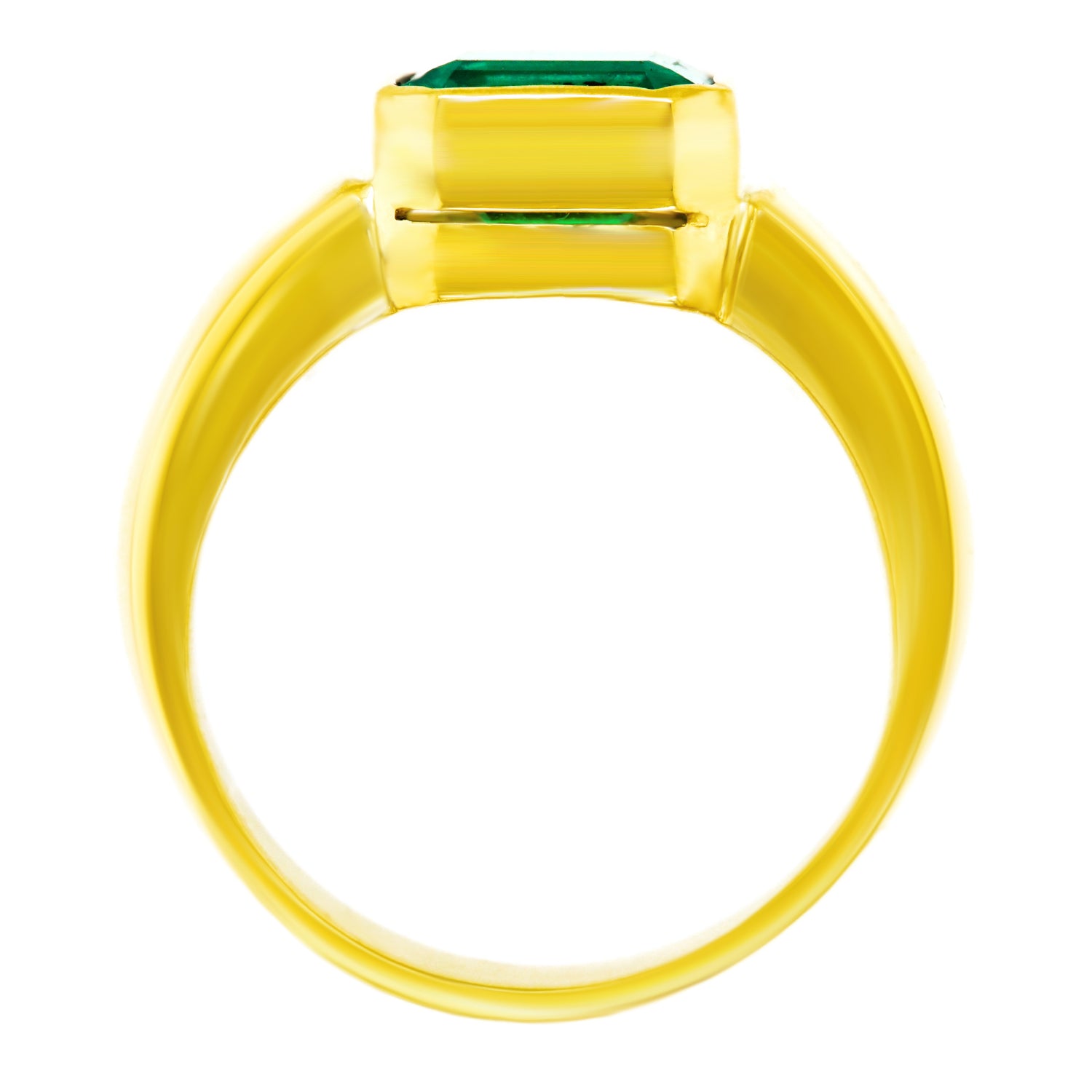 Circa 1960s, 18k, American.   The 3.0-carat emerald in this fabulous sixties ring has gorgeous color and lively passage of light. Its postmodern design is perfect for today's understated off-hand chic. Meticulously made in 18k yellow gold, it is in excellent condition.