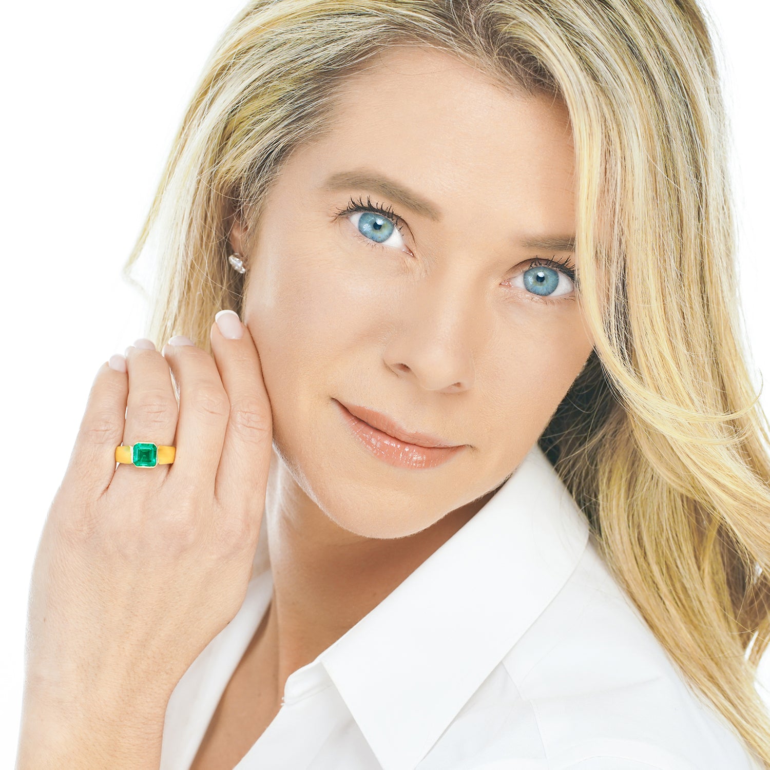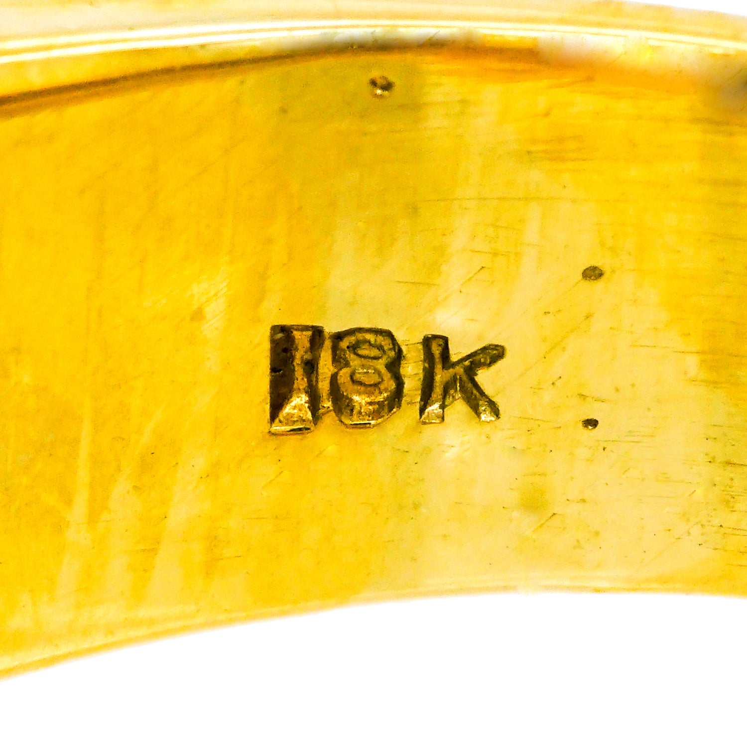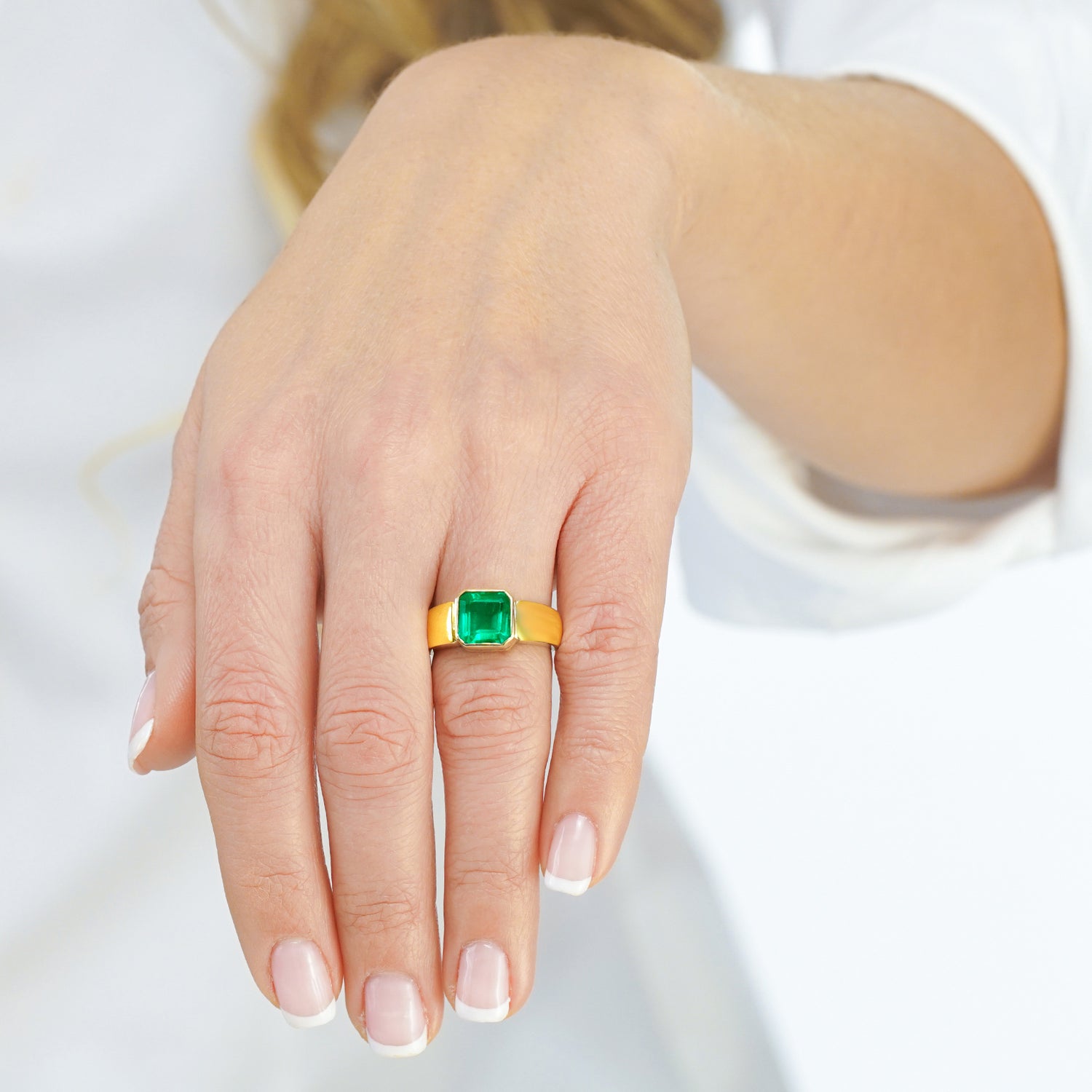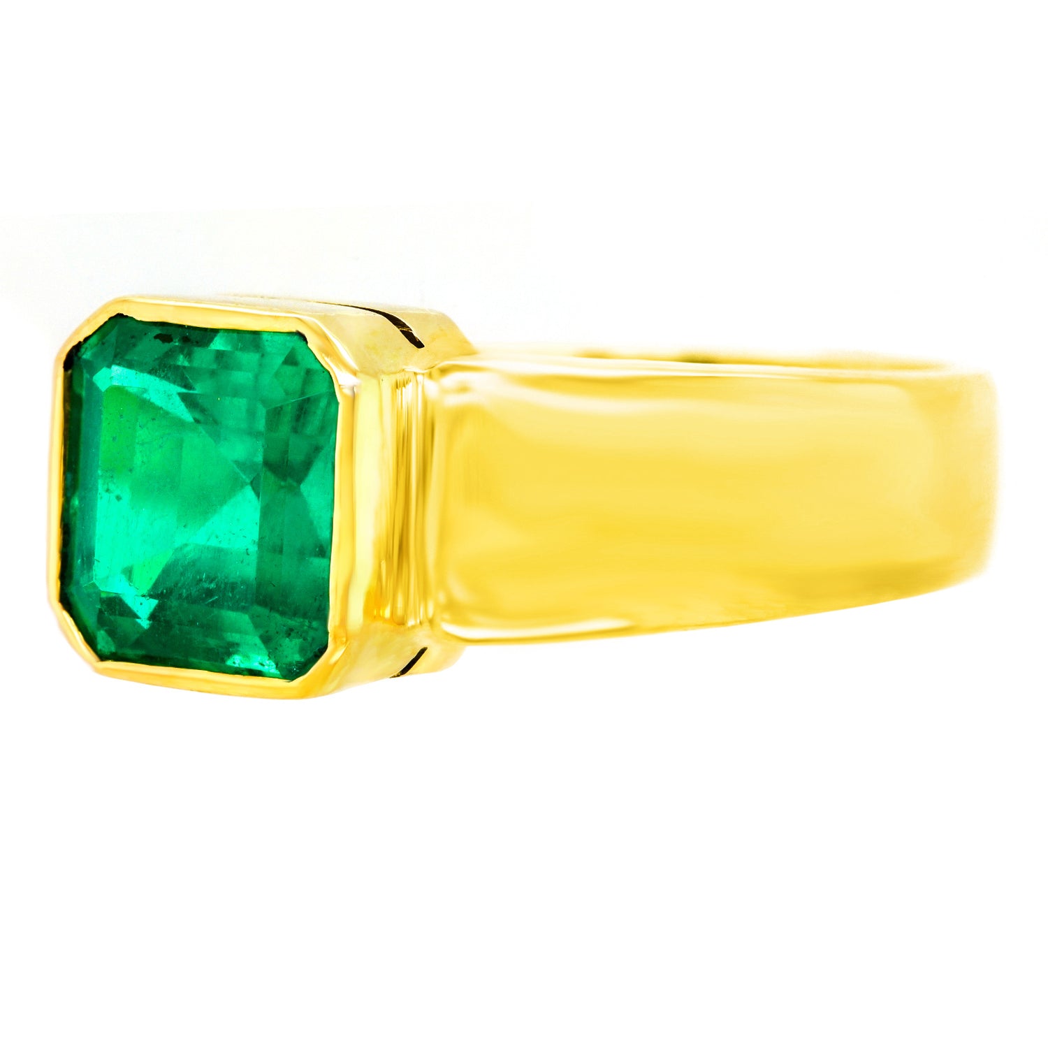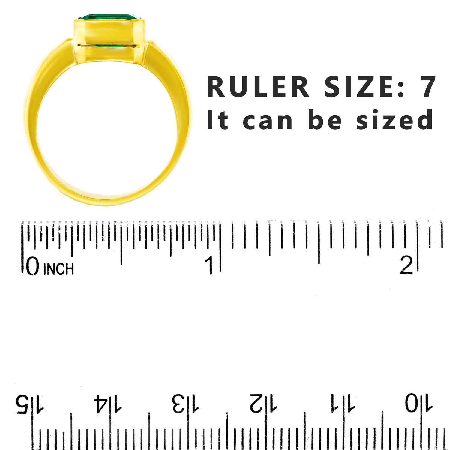 Circa 1960s, 18k, American.   The 3.0-carat emerald in this fabulous sixties ring has gorgeous color and lively passage of light. Its postmodern design is perfect for today's understated off-hand chic. Meticulously made in 18k yellow gold, it is in excellent condition.