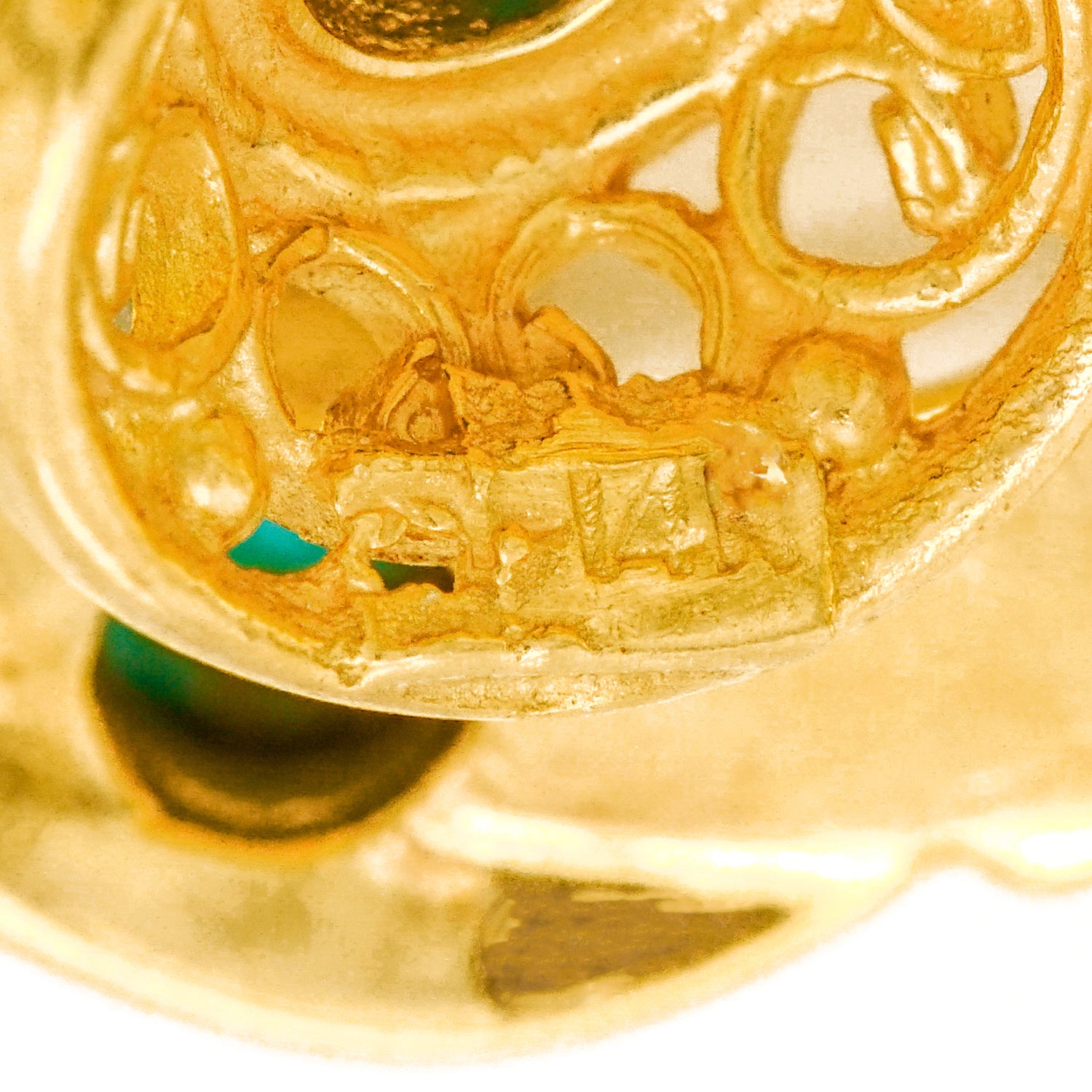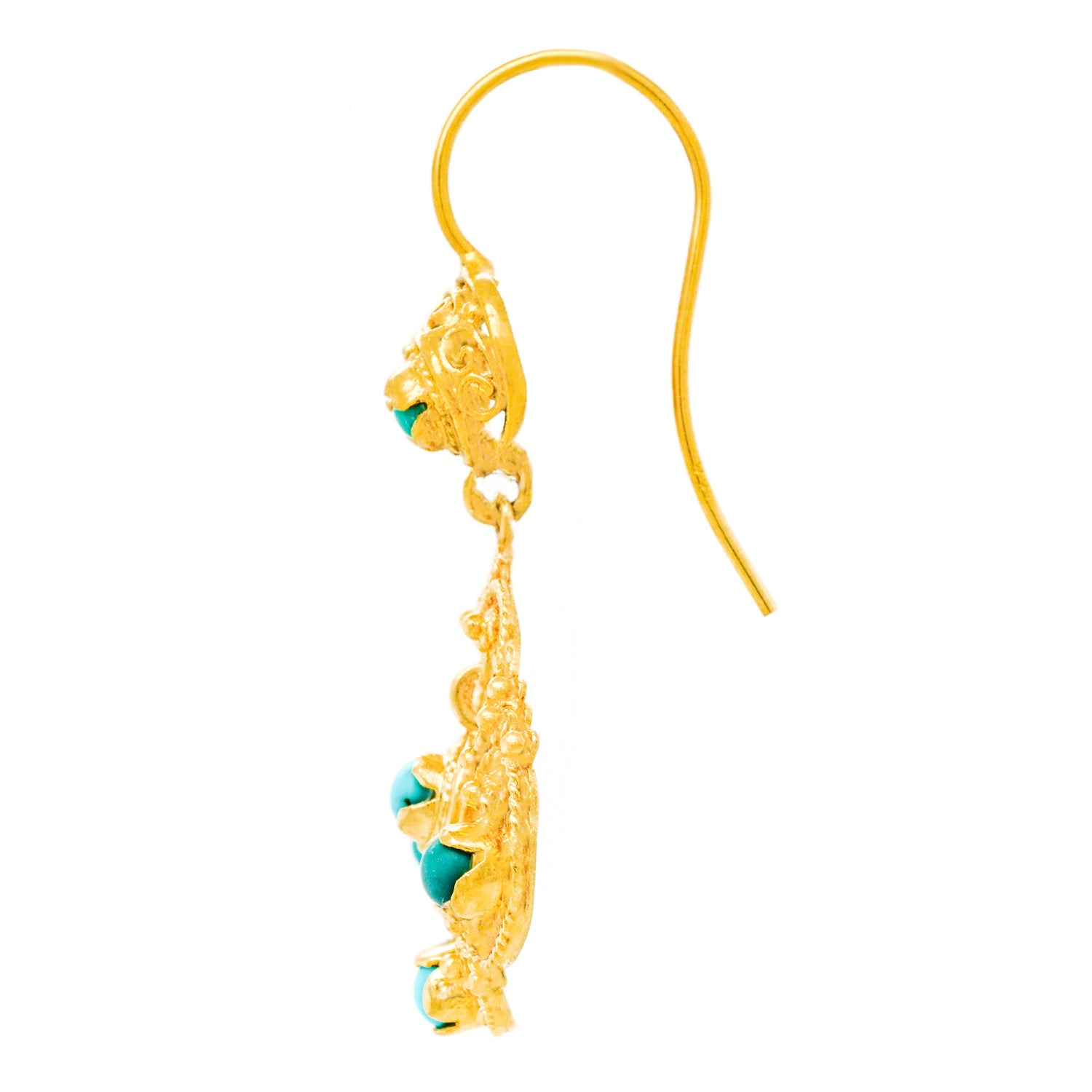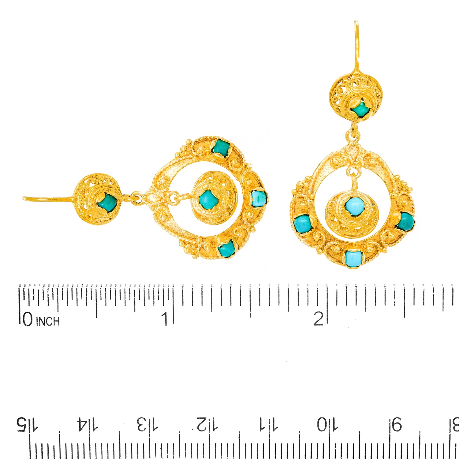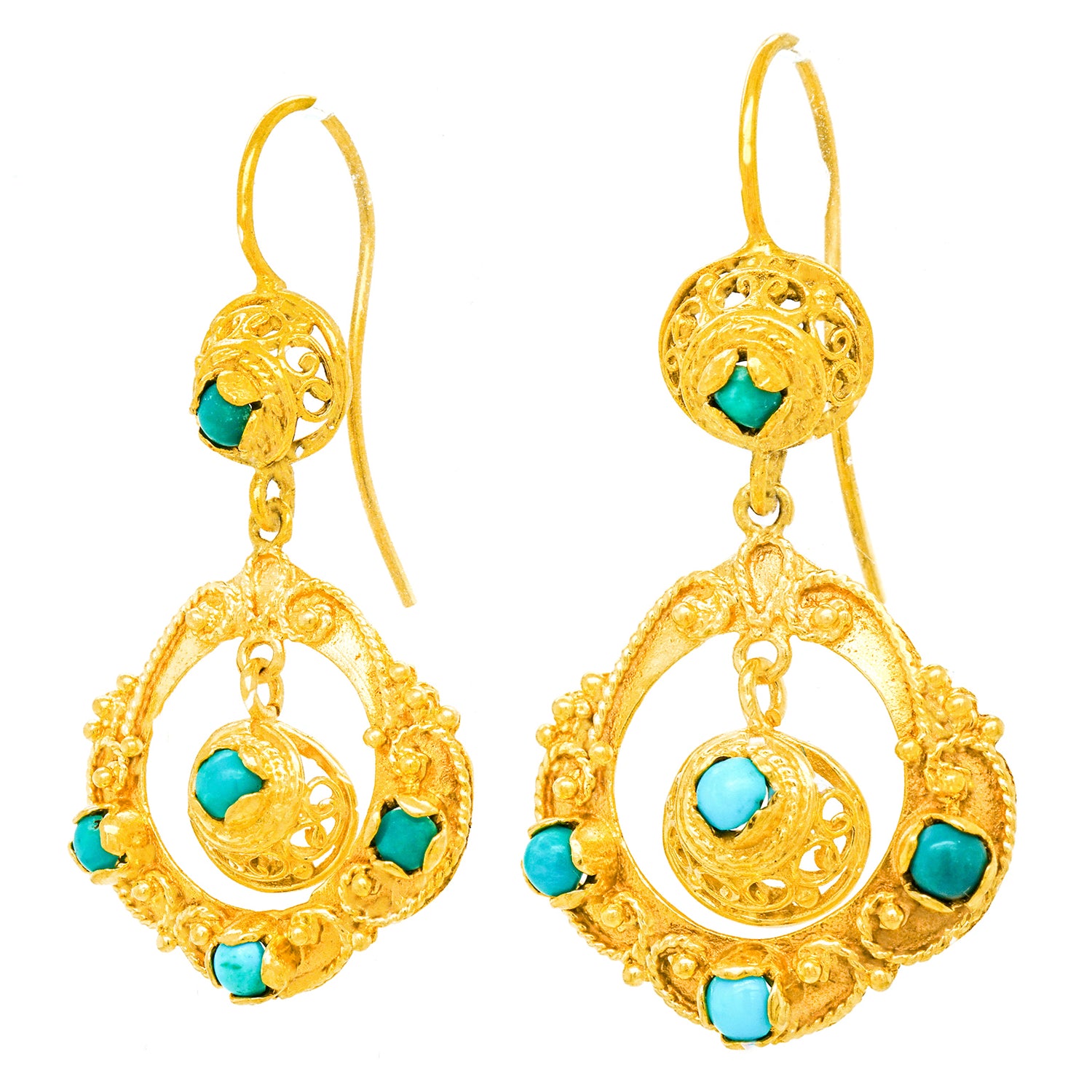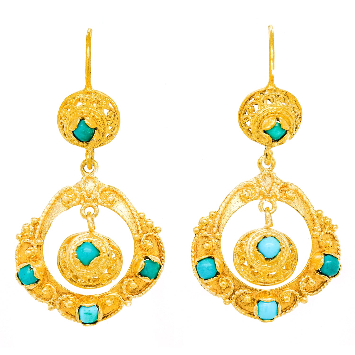 Circa 1960s, 14k.  Fabulously sixties, these Hippie earrings feature an Artisan-meets-Boho style. Their look breezily goes from the sidewalk to the coffee house. Set with turquoise in 14k yellow gold, these earrings are well-made and in excellent condition.