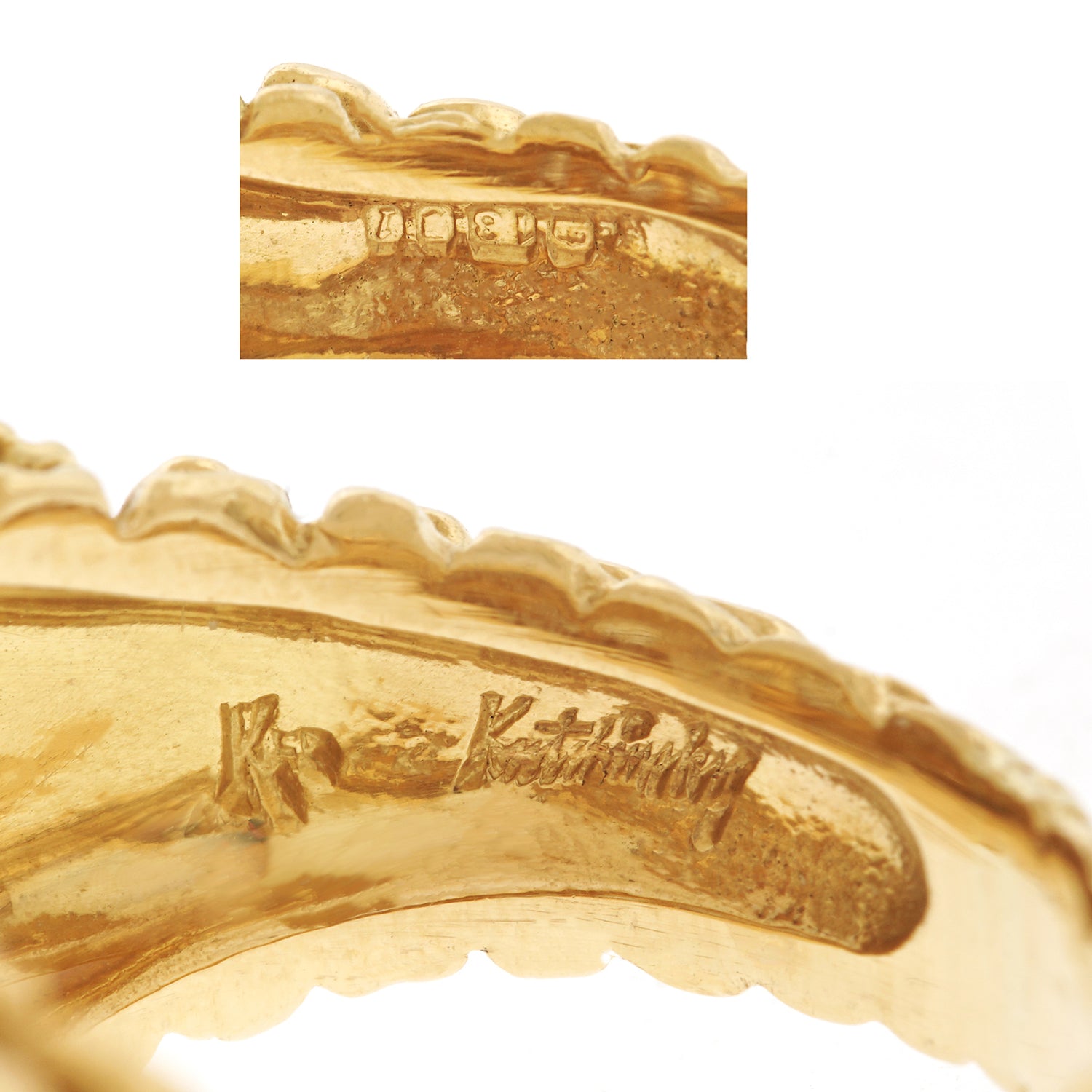 Hallmarks: Kutchinsky, crown indicating gold object, 18, leopards head for London, and datemark for 1964.