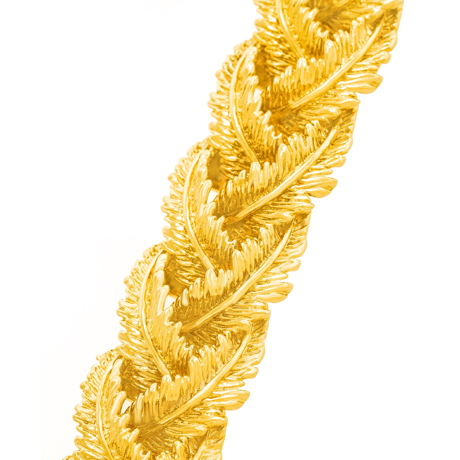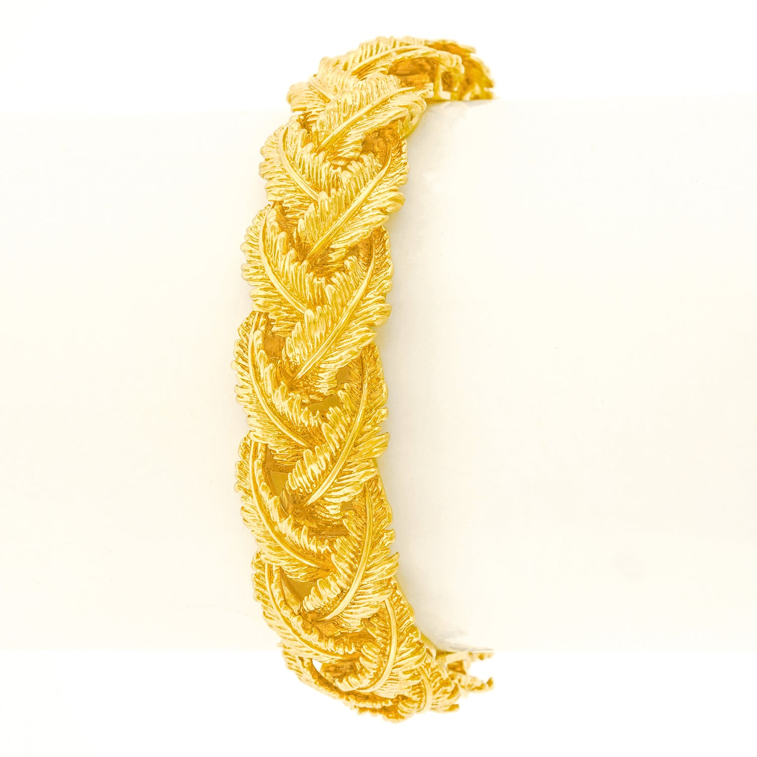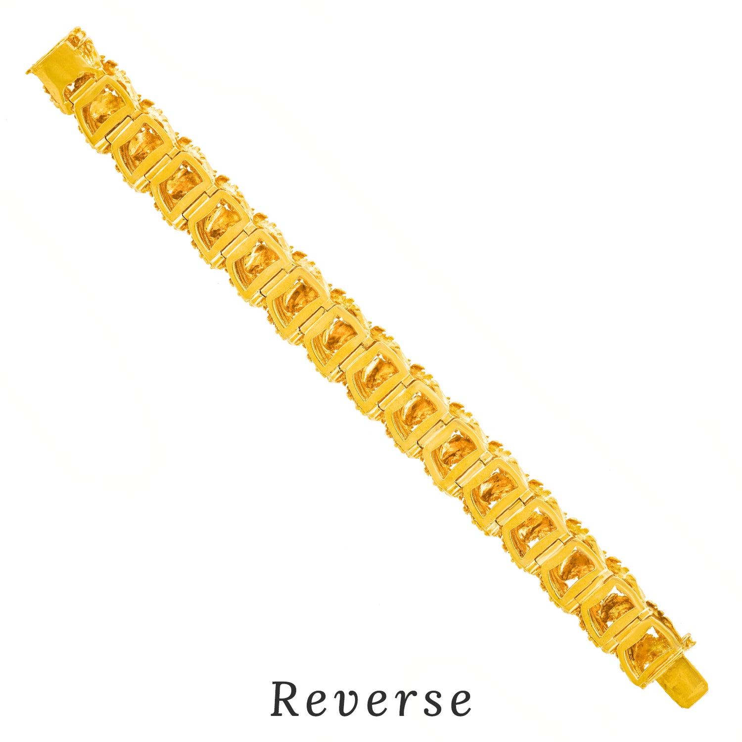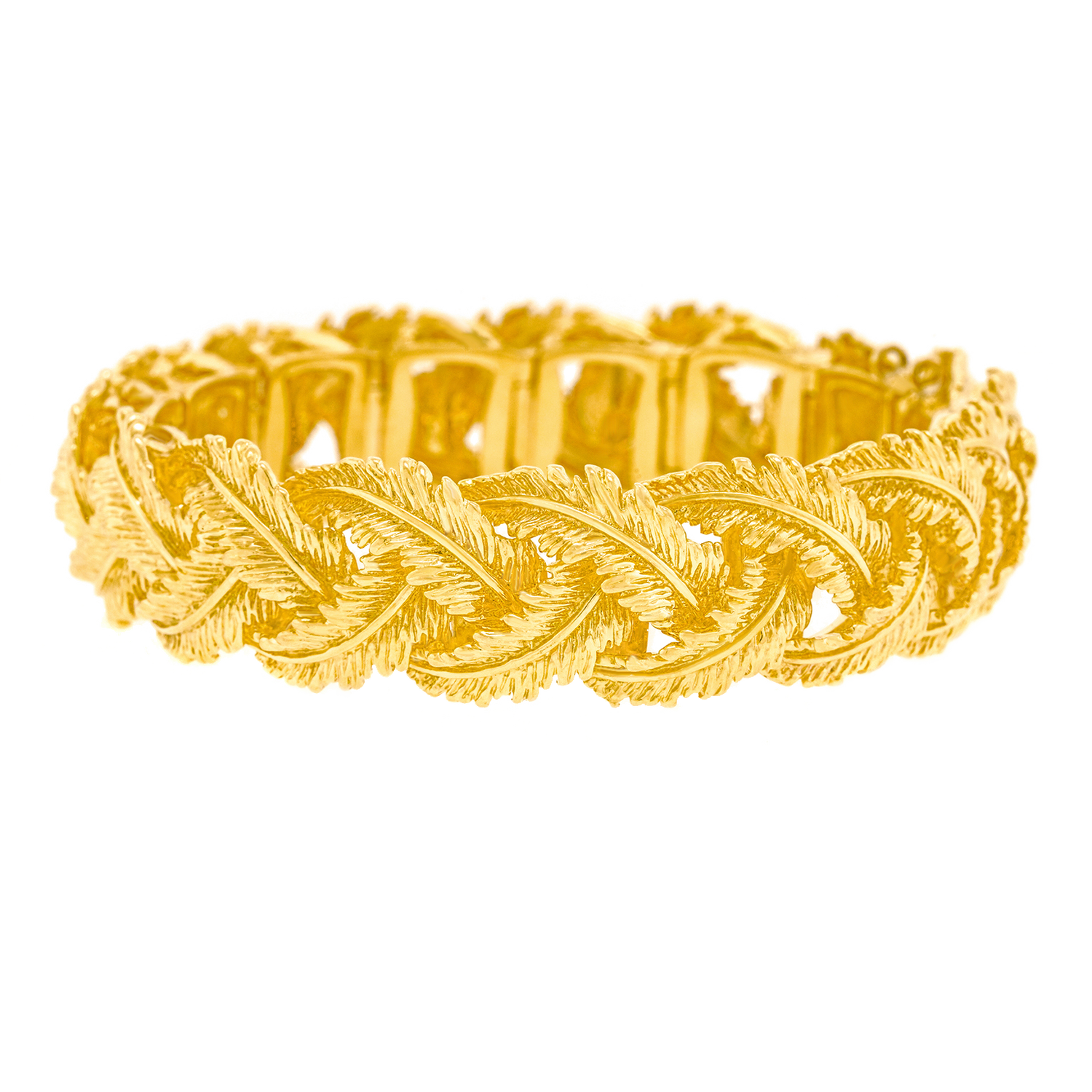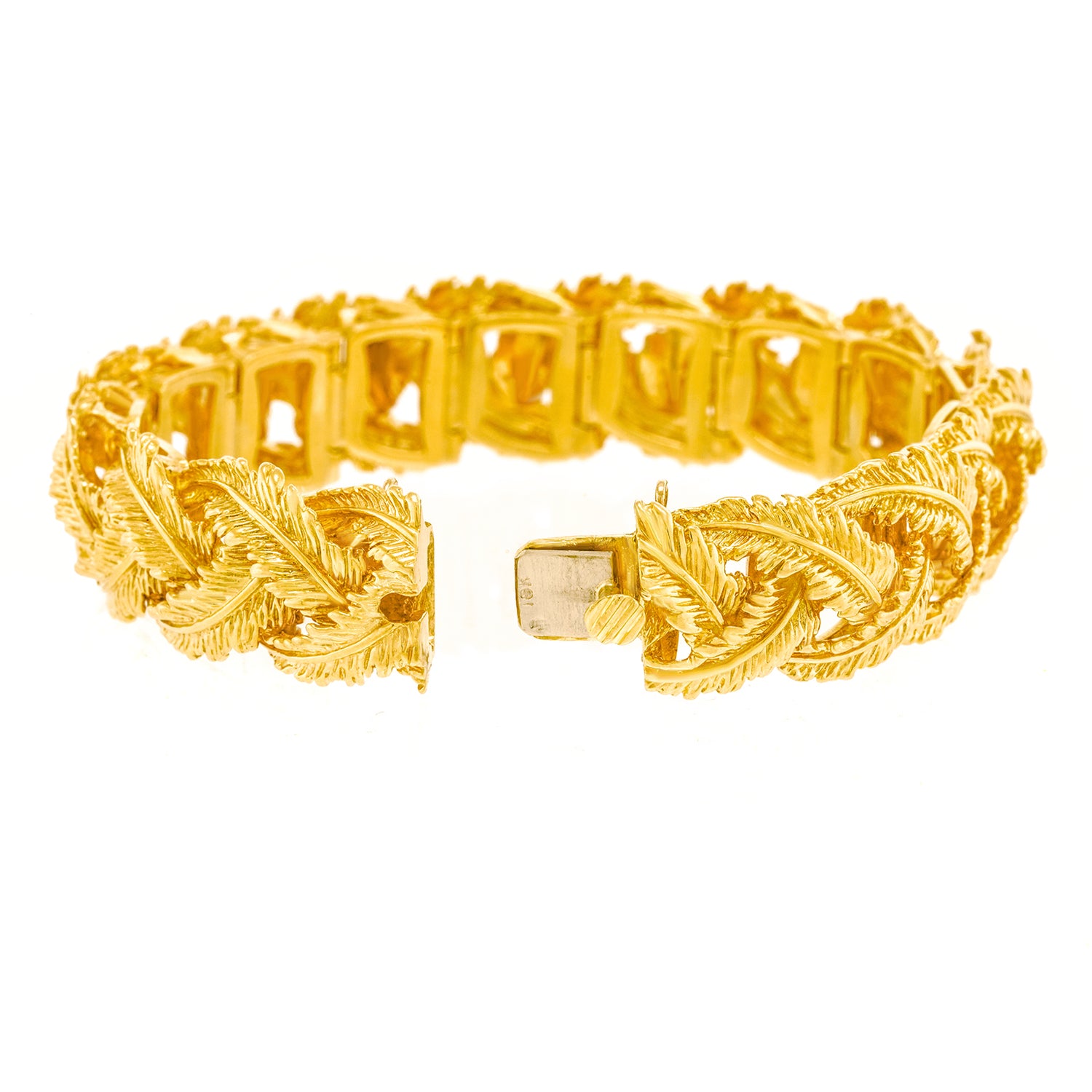 Circa 1960s, 18k, American. This 18k yellow gold bracelet is brilliant sixties fashion. Perfect for everyday wear, it easily transitions from heels and jeans to cocktail dresses. Uniquely designed and meticulously fabricated, this bracelet is in excellent condition.