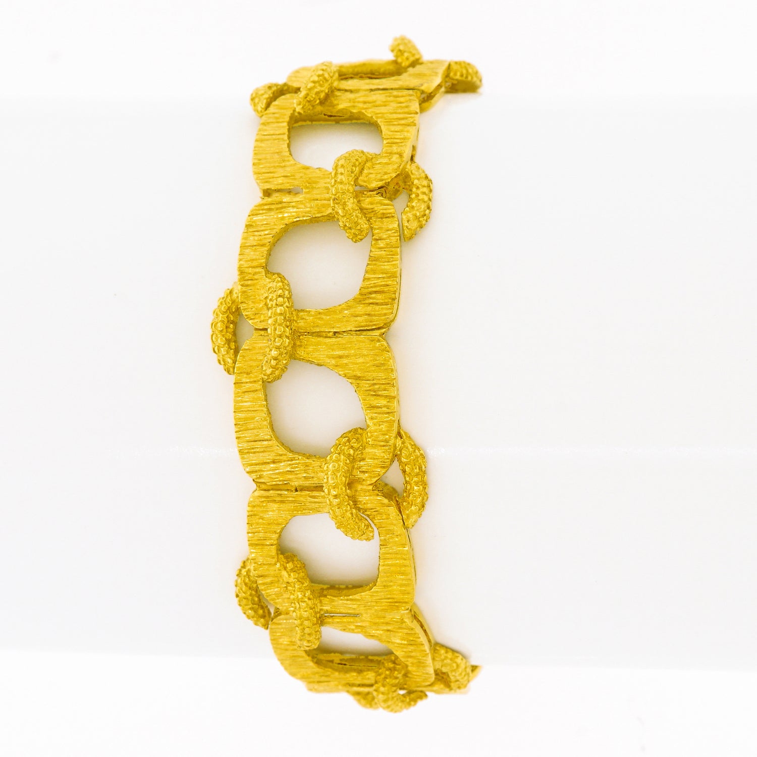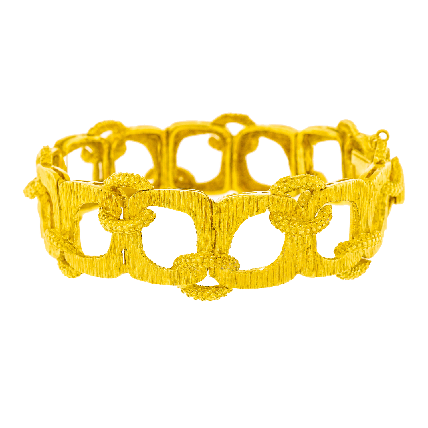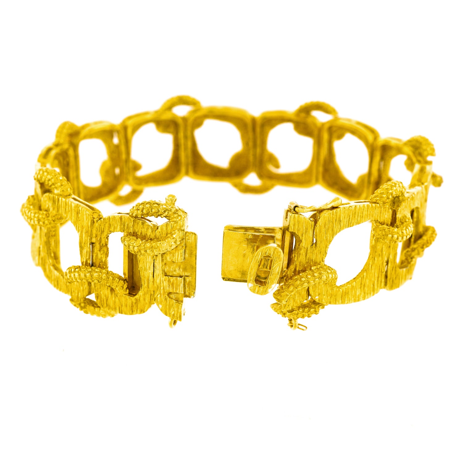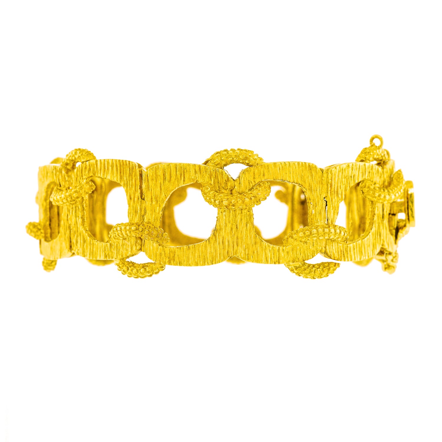 Circa 1960s, 18k, American.   Made in 18k gold, this Mod sixties American bracelet features bold texture, organic shapes, and a fabulous interlocking motif. This cool example of post-modern style would be perfectly at home in a Slim Aarons poolside photograph! Excellent condition.