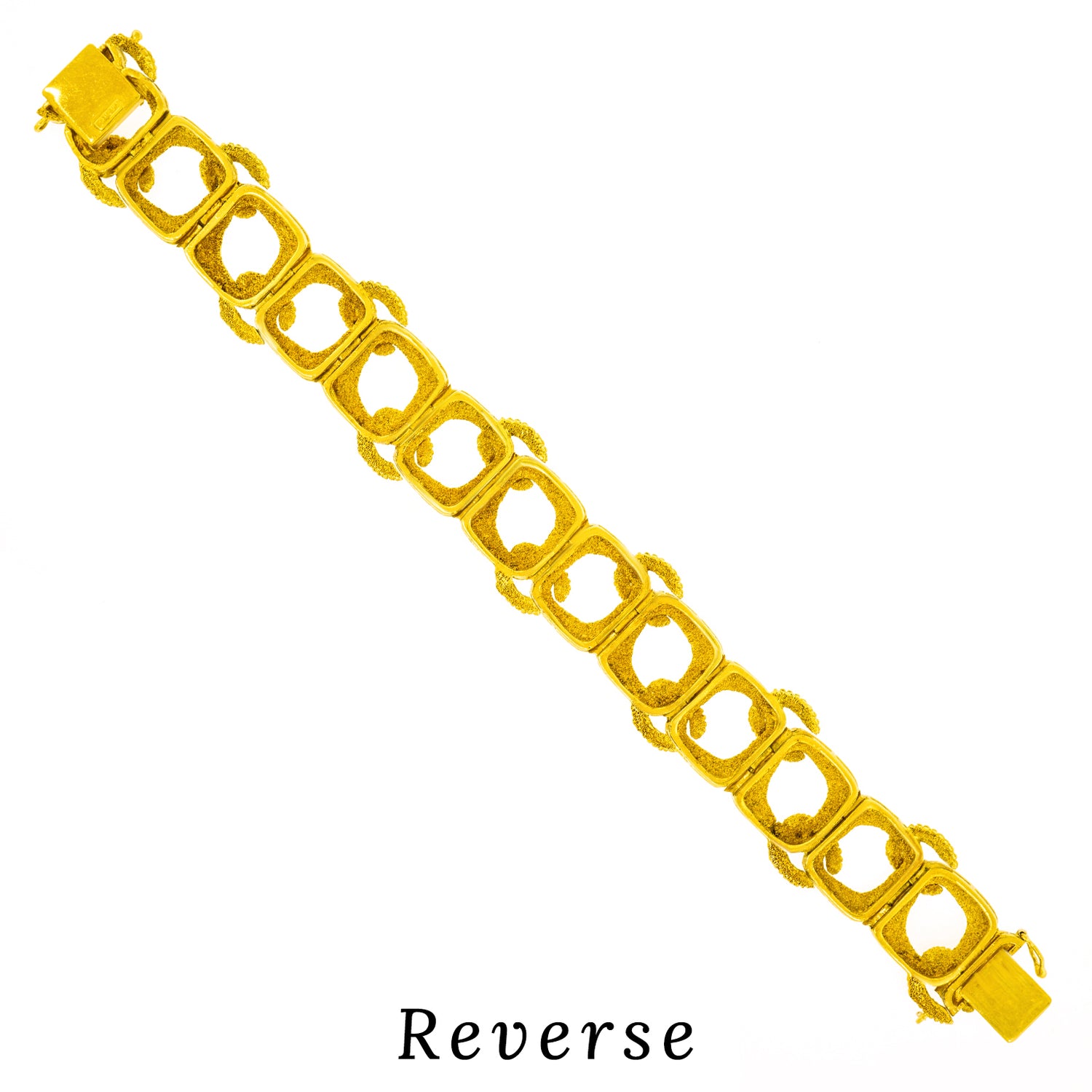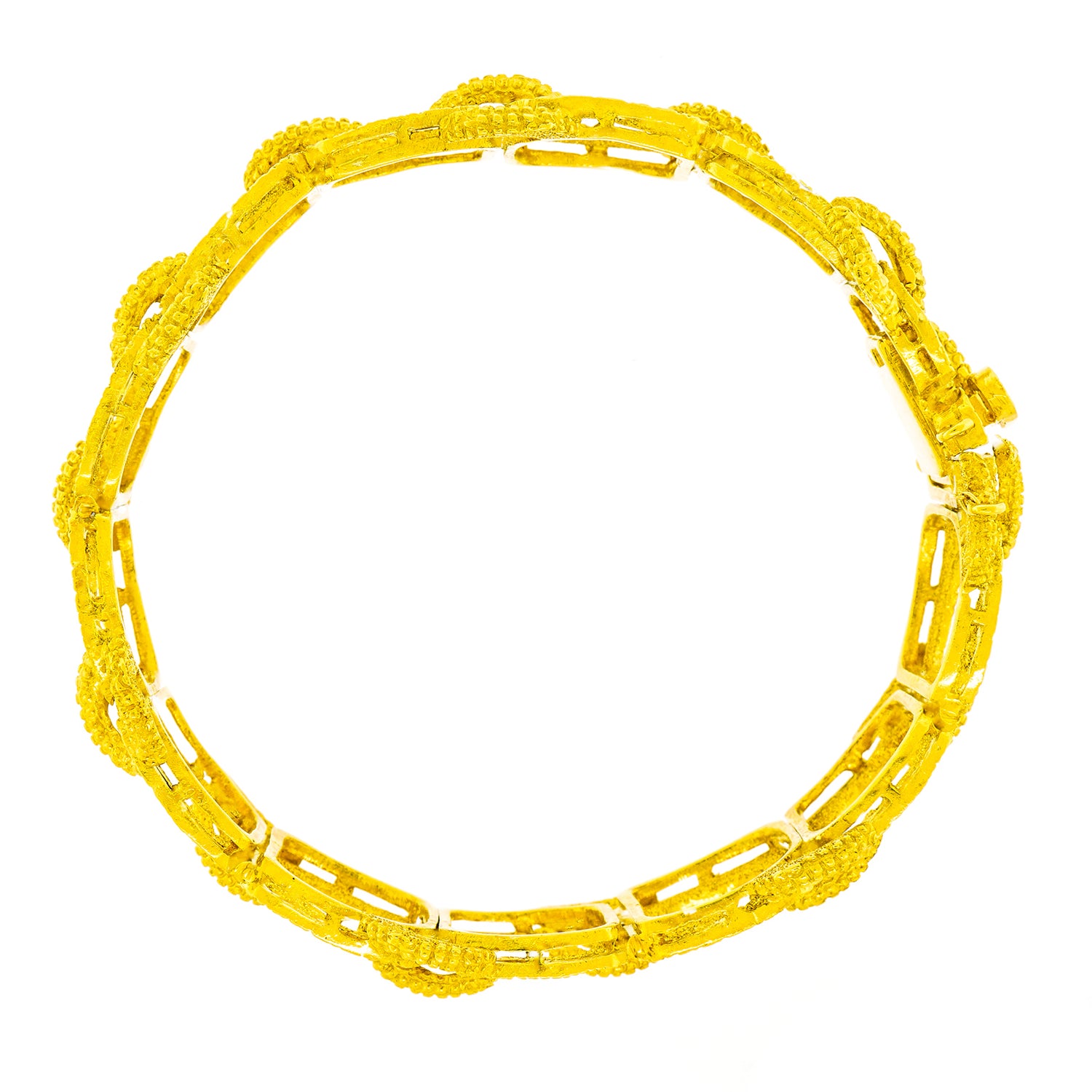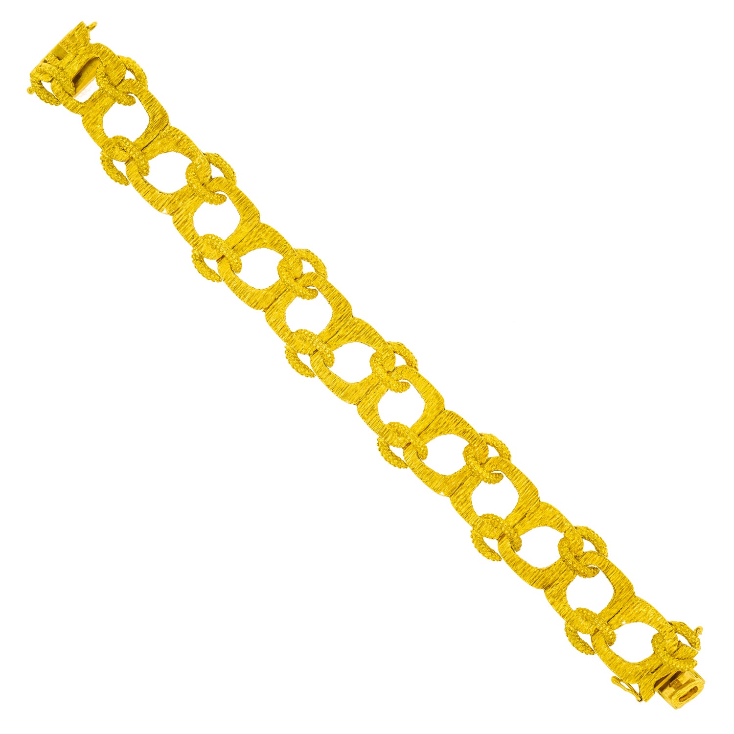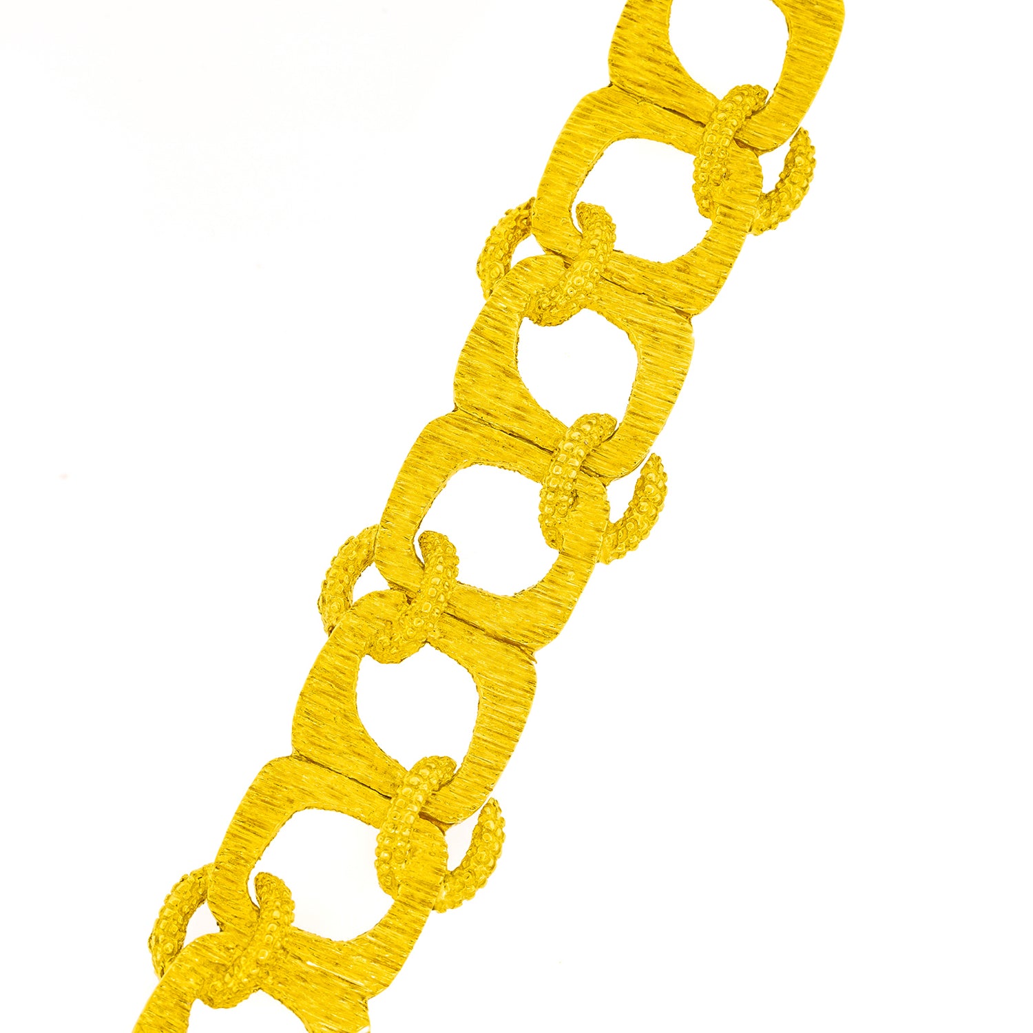 Circa 1960s, 18k, American.   Made in 18k gold, this Mod sixties American bracelet features bold texture, organic shapes, and a fabulous interlocking motif. This cool example of post-modern style would be perfectly at home in a Slim Aarons poolside photograph! Excellent condition.