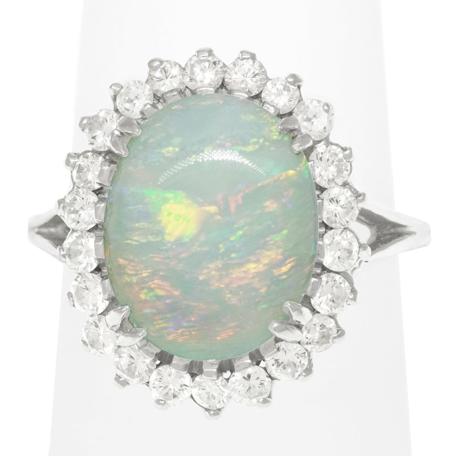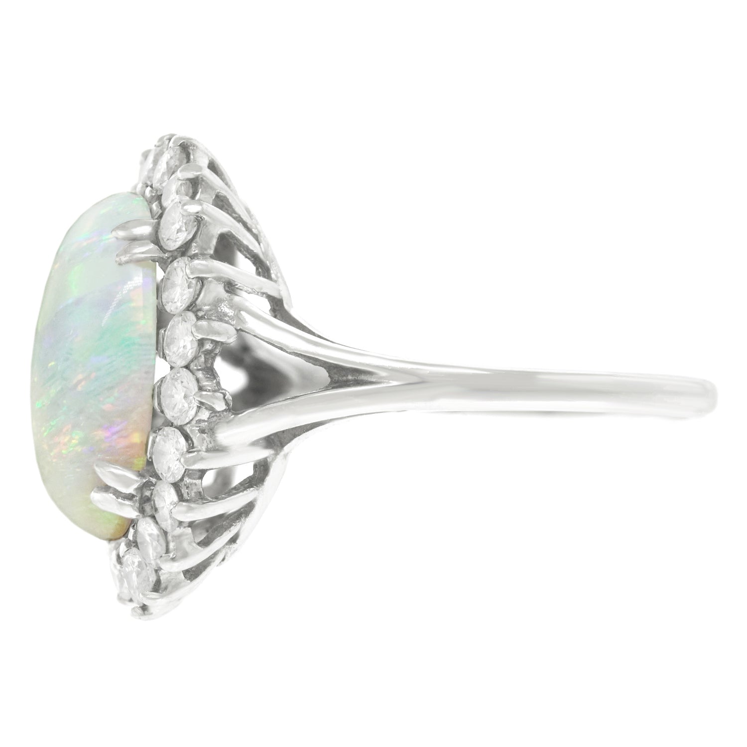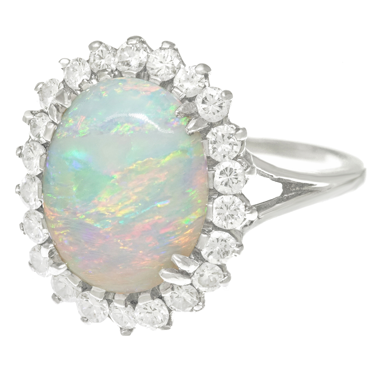 Circa 1960s, 18k, American.   This chic sixties ring is all about the scintillating 2.5-carat opal. Displaying green, blue, purple, and red in varying hues, this stone has excellent fire and sublime play of light! One carat of sparkly diamonds (H color, VS clarity) surrounds the main stone, completing the picture. Handmade, this ring is in excellent condition.