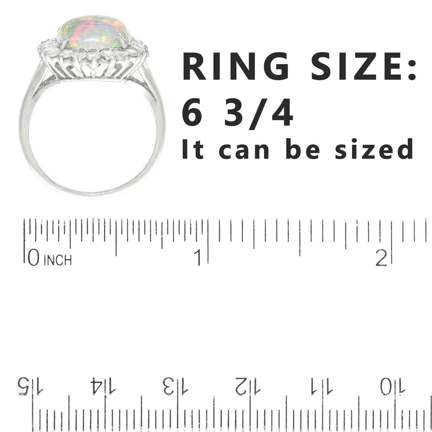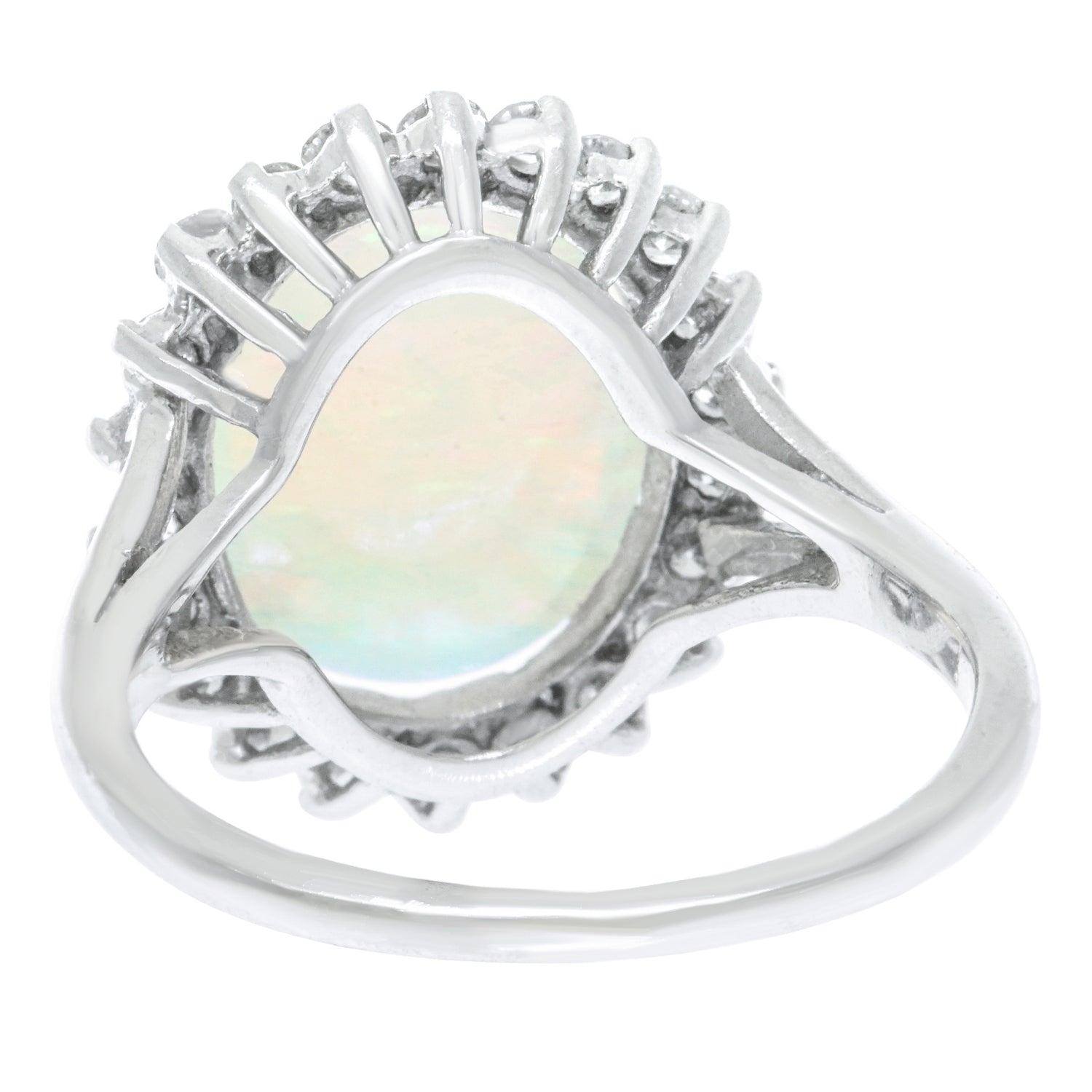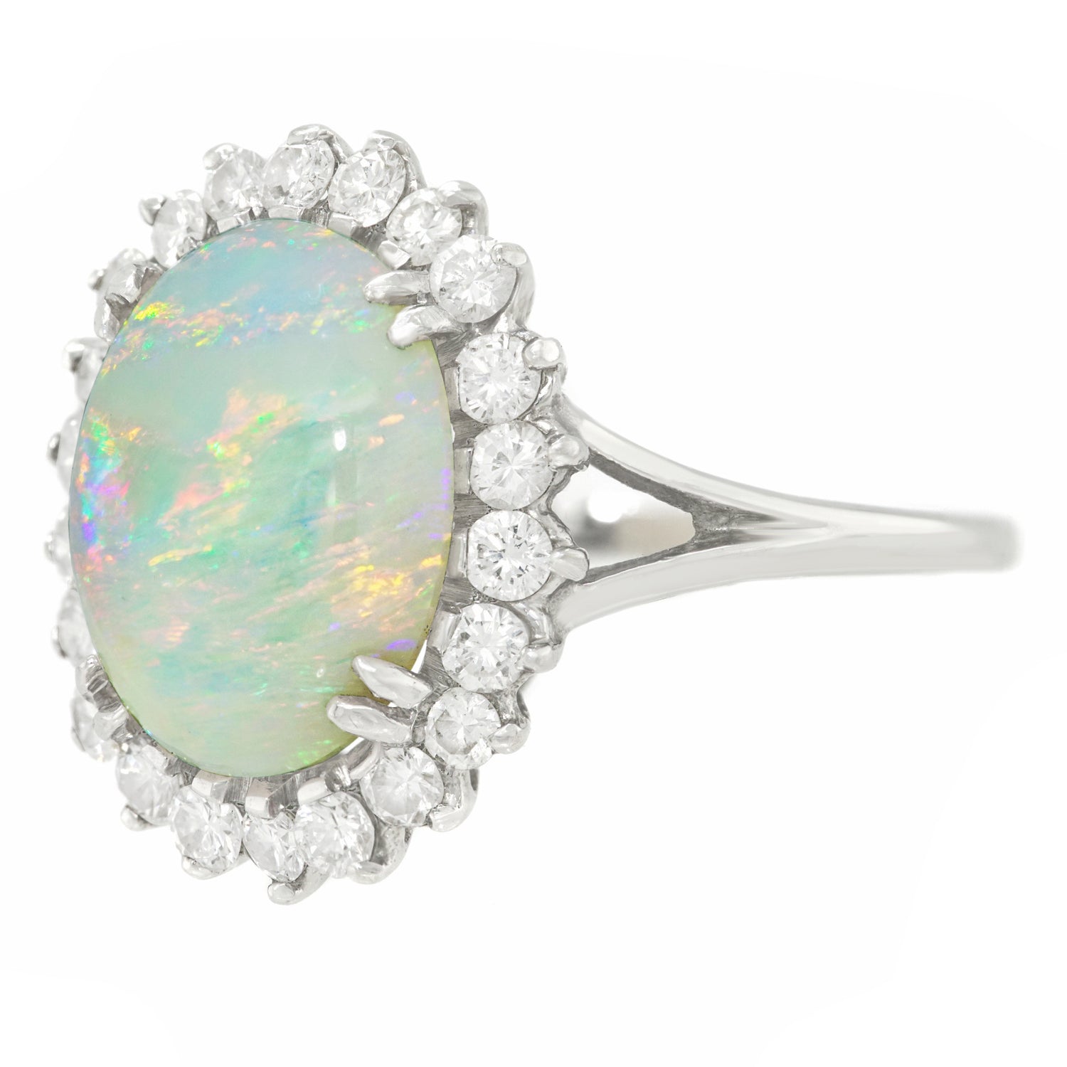 Circa 1960s, 18k, American.   This chic sixties ring is all about the scintillating 2.5-carat opal. Displaying green, blue, purple, and red in varying hues, this stone has excellent fire and sublime play of light! One carat of sparkly diamonds (H color, VS clarity) surrounds the main stone, completing the picture. Handmade, this ring is in excellent condition.