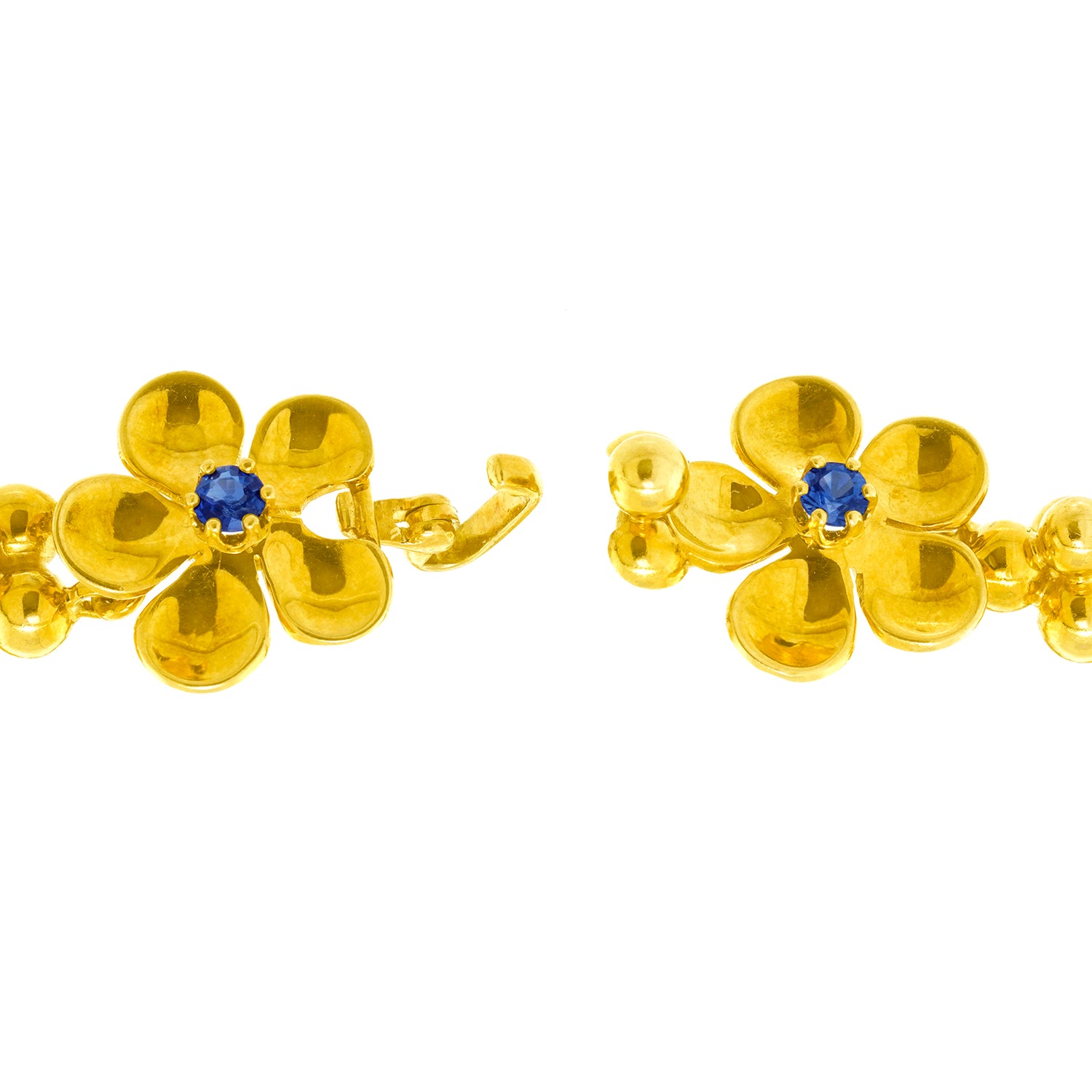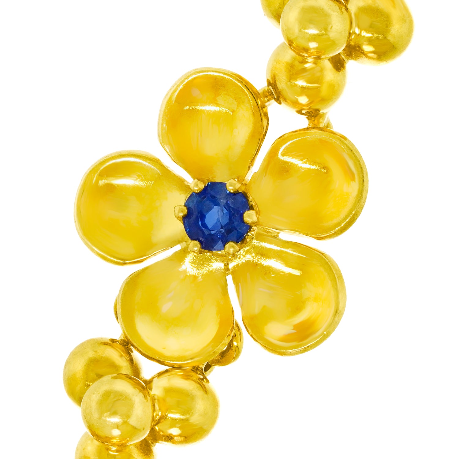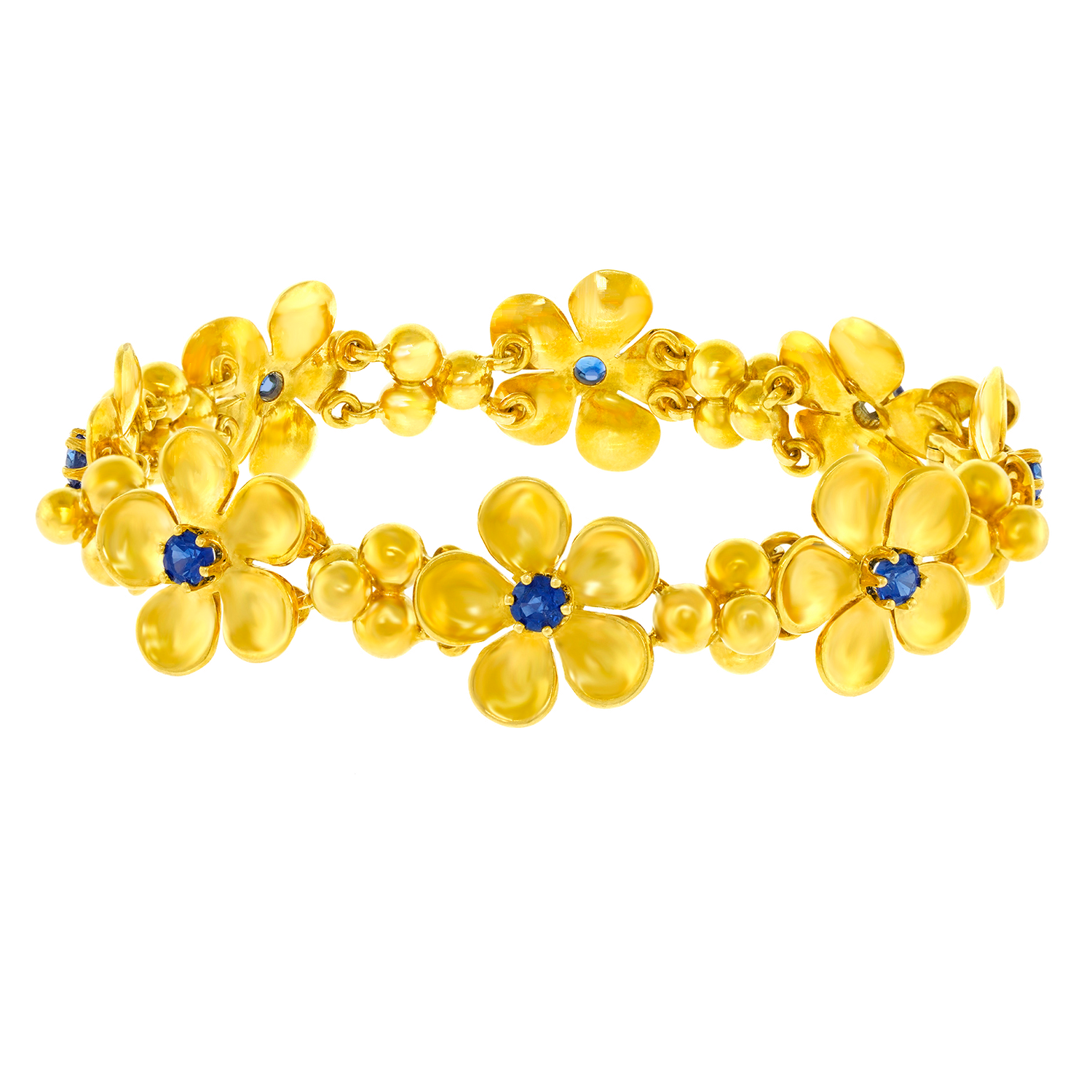Circa 1960s, 18k, by Rud Murbach, Zurich, Switzerland. Charming, cheerful, and chic, this lovely flower bracelet is a visual ray of sunshine! Each flower is set with a brilliant corn flower blue sapphire (2.0 carats total weight). The look is flower-power, pop art perfection! Finely made in eighteen-karat yellow gold in Zurich, this jewel is in excellent condition.