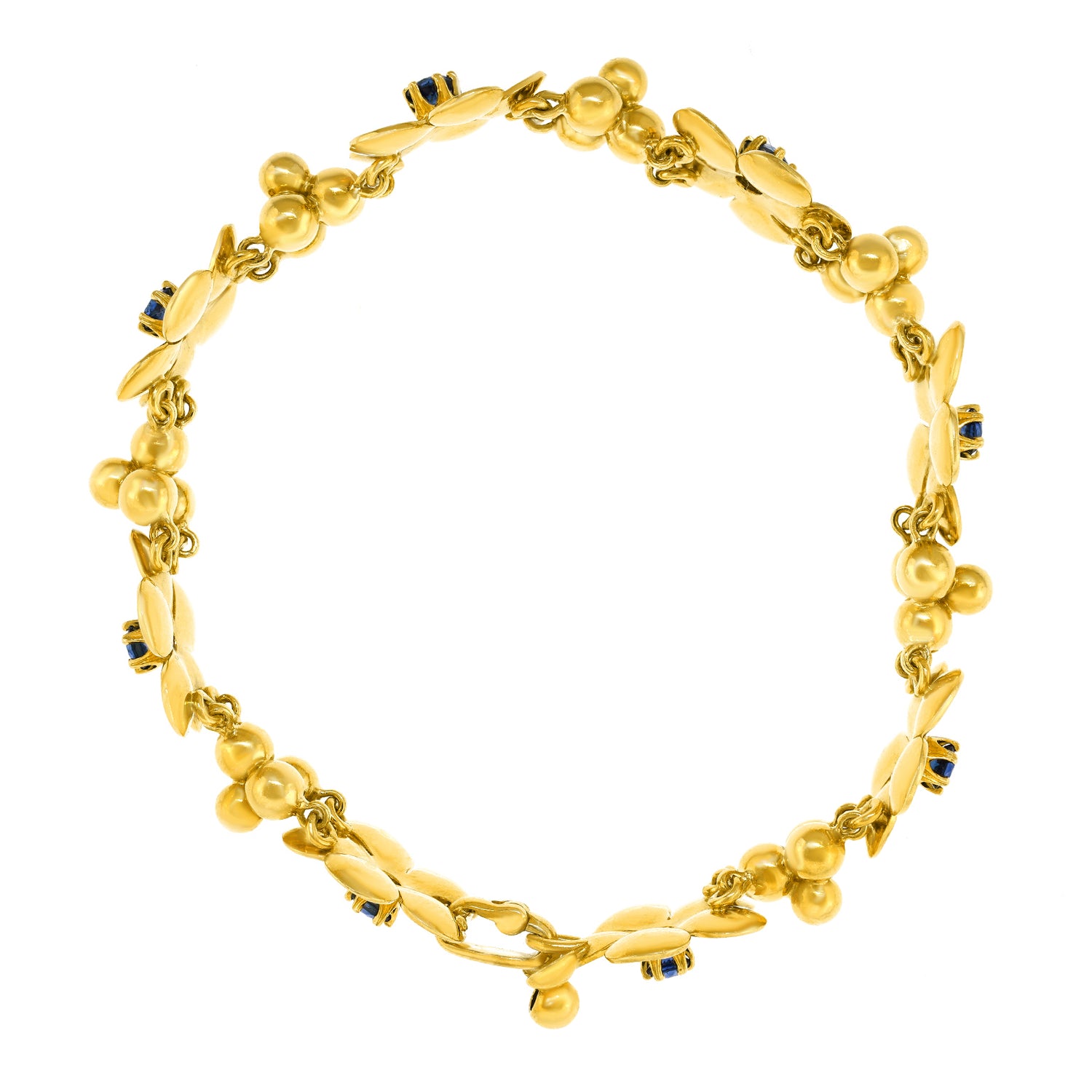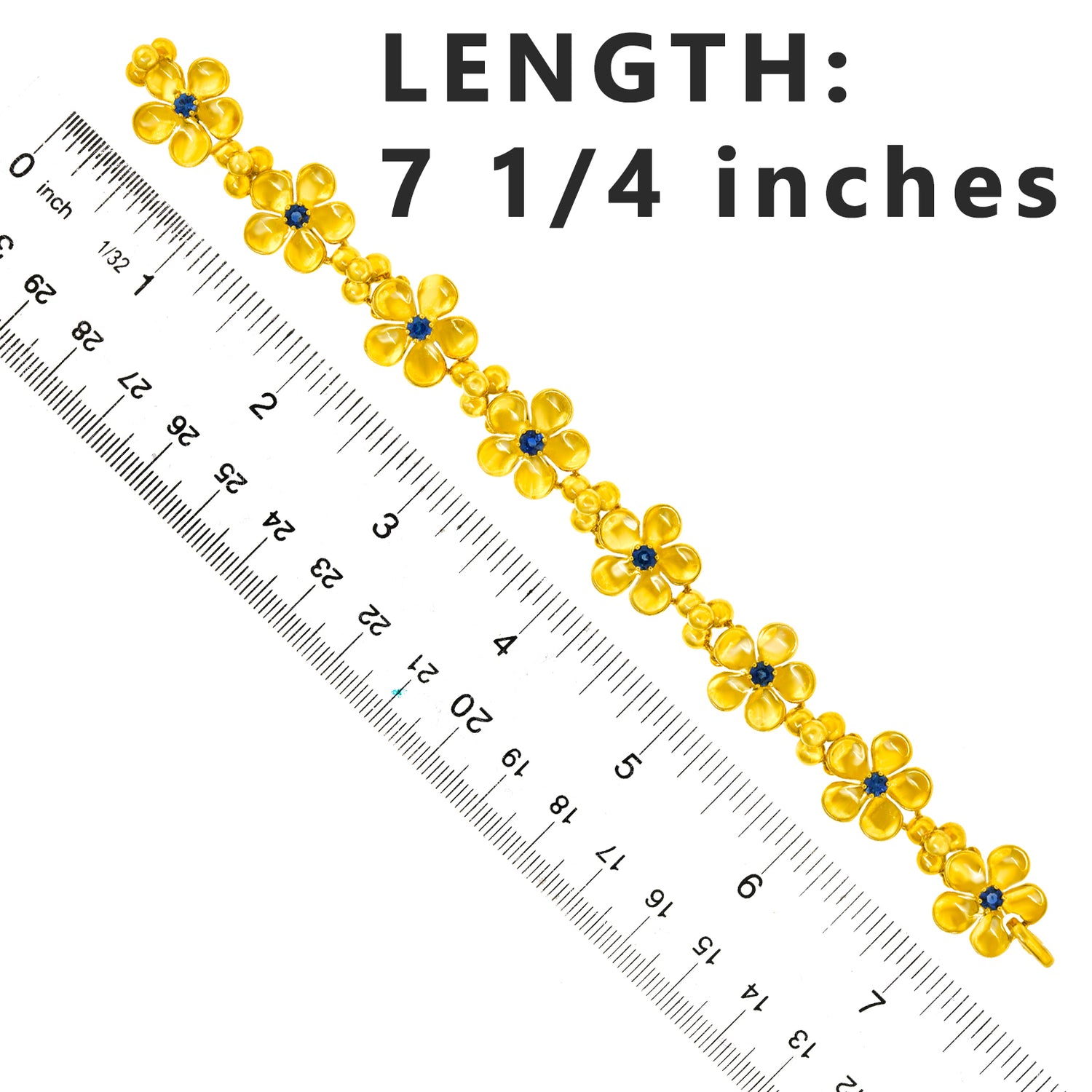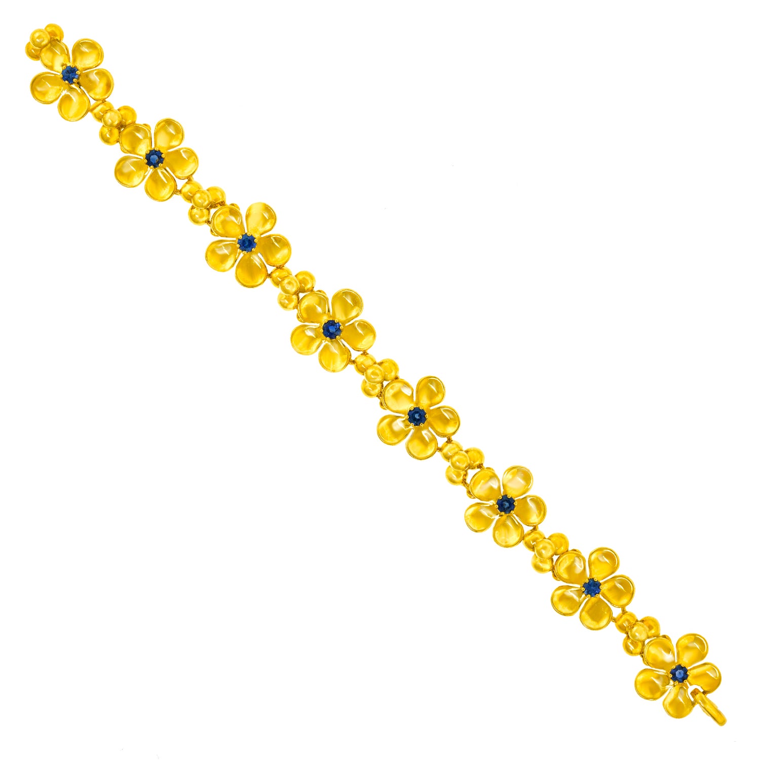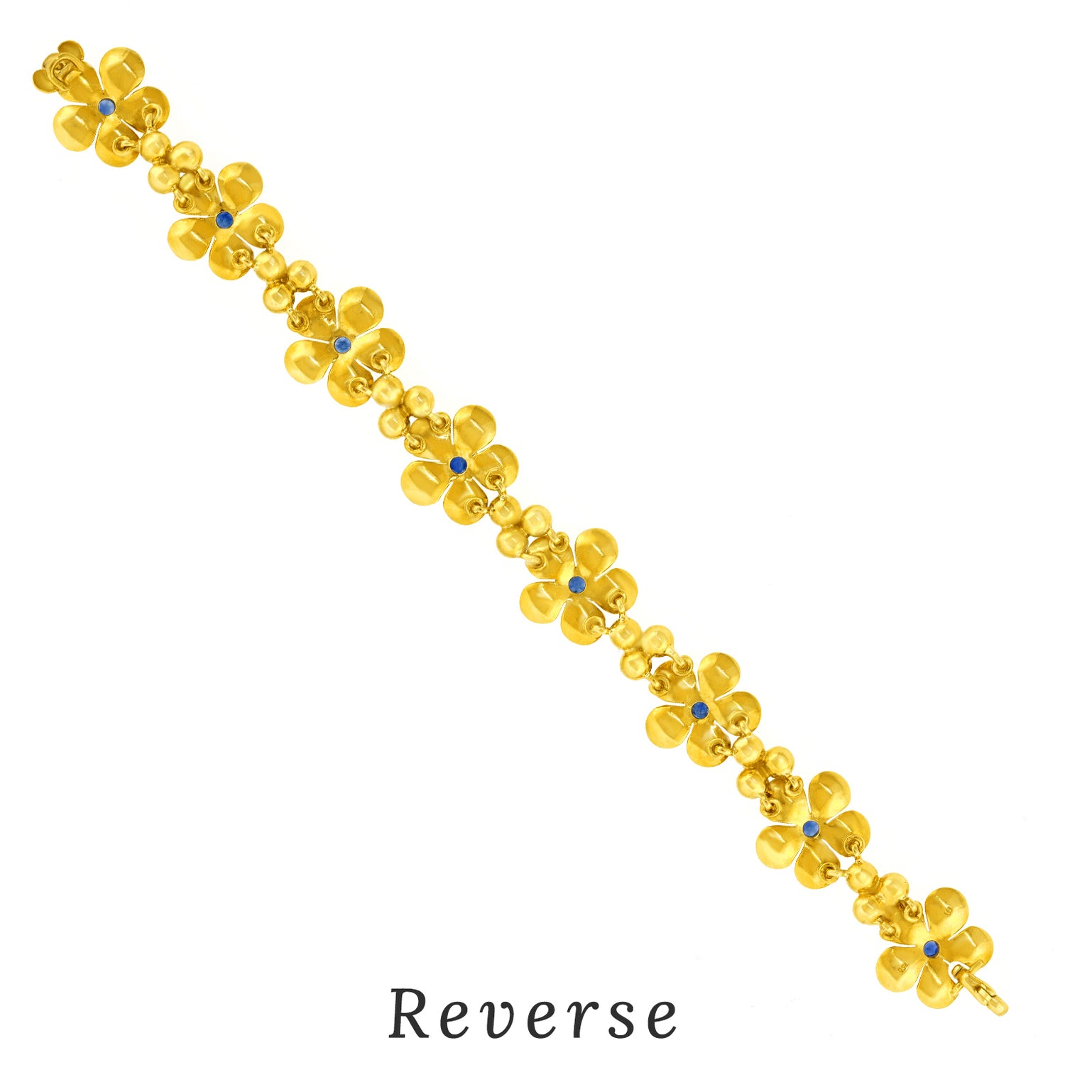 Circa 1960s, 18k, by Rud Murbach, Zurich, Switzerland. Charming, cheerful, and chic, this lovely flower bracelet is a visual ray of sunshine! Each flower is set with a brilliant corn flower blue sapphire (2.0 carats total weight). The look is flower-power, pop art perfection! Finely made in eighteen-karat yellow gold in Zurich, this jewel is in excellent condition.